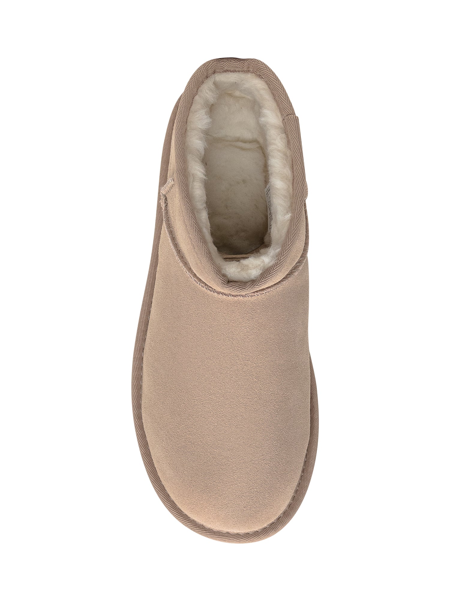 Beige suede low boot. Slip-on. Sheepskin lining. Logo patch at heel. Platform sole.