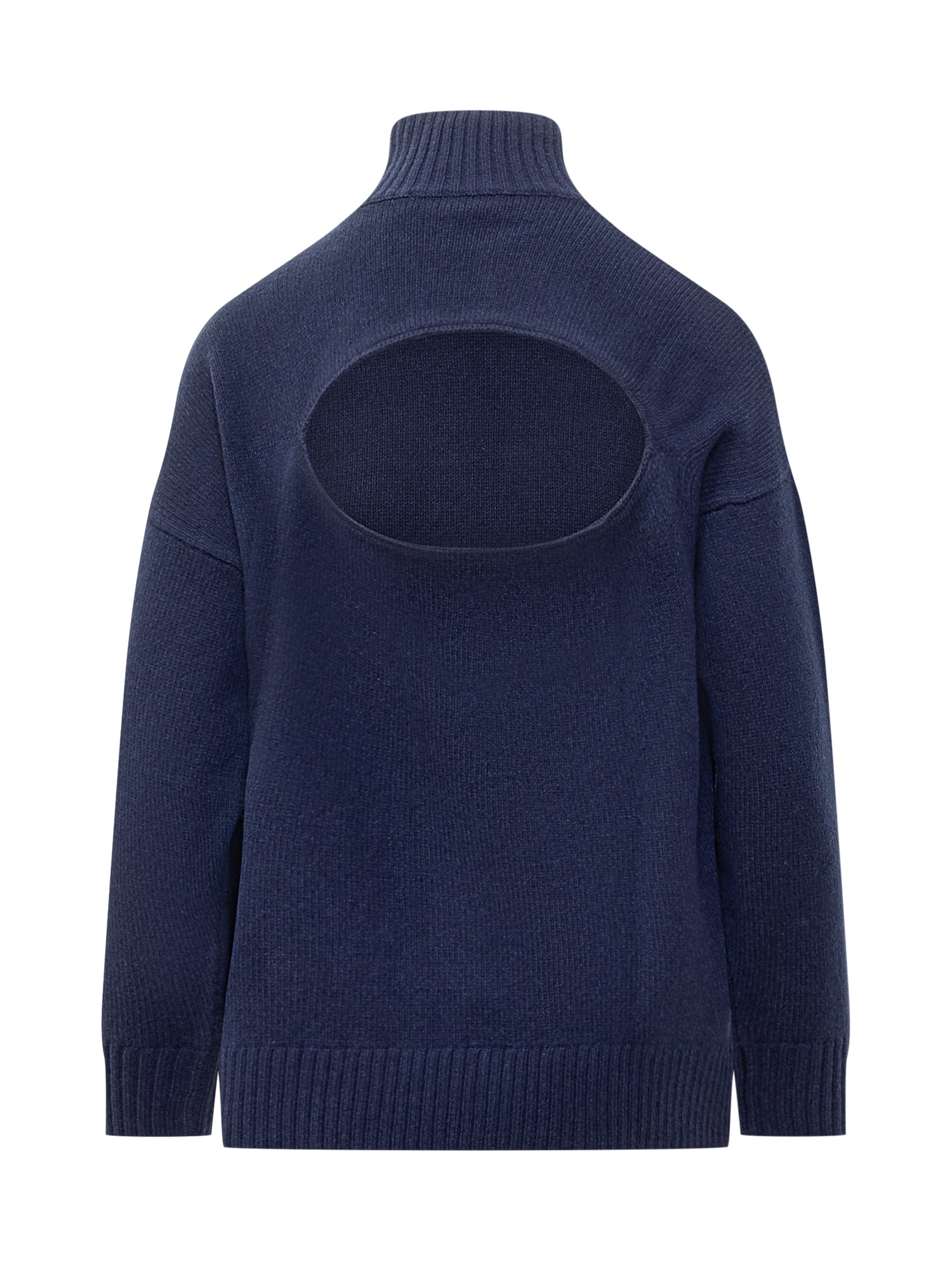 Blue sweater in wool blend. High neck. Collar, cuffs and ribbed hem. Back cut-out.