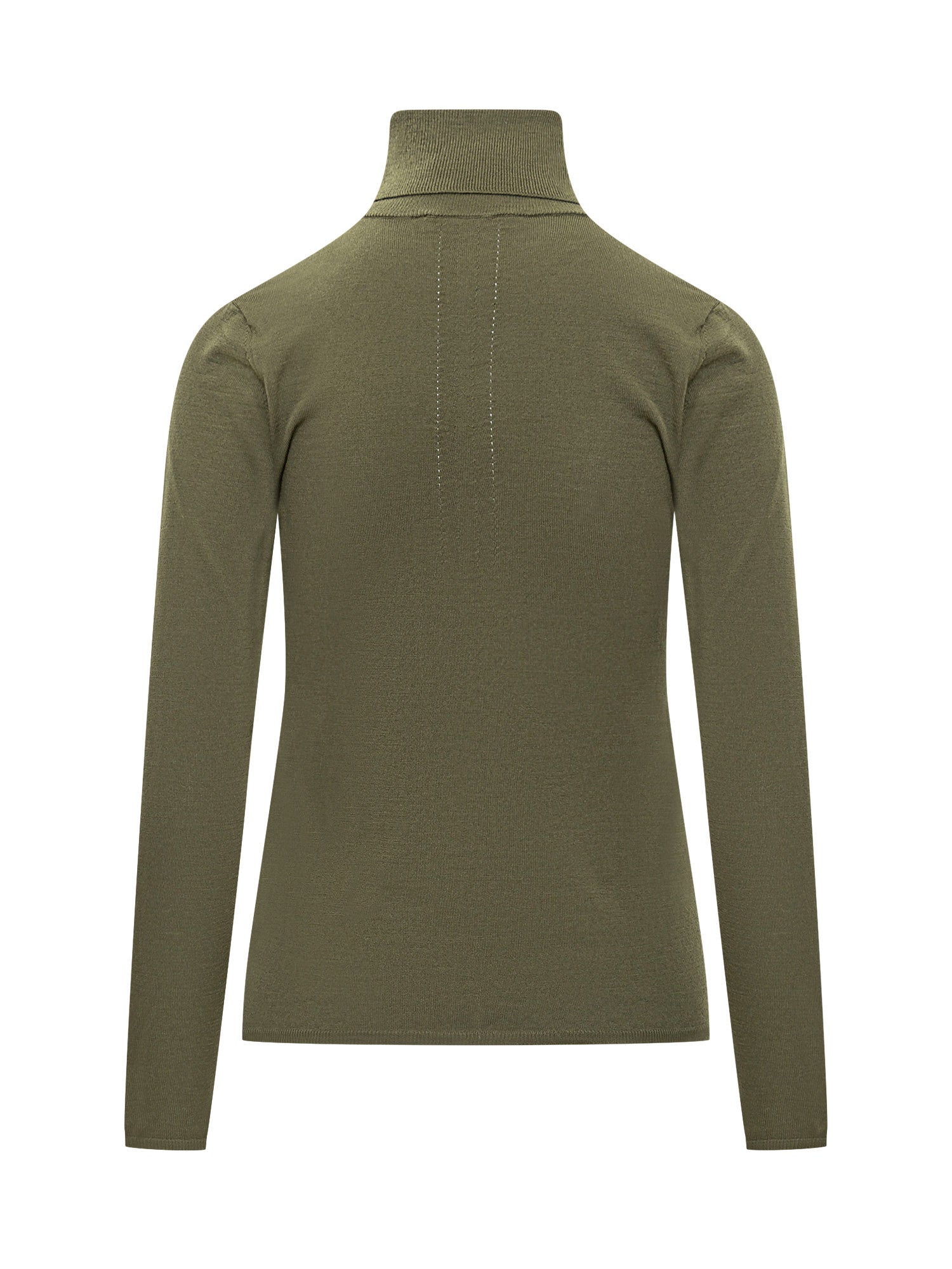 Military green fine wool turtleneck with a slim fit and minimal design, ideal for elegant outfits and versatile layering.