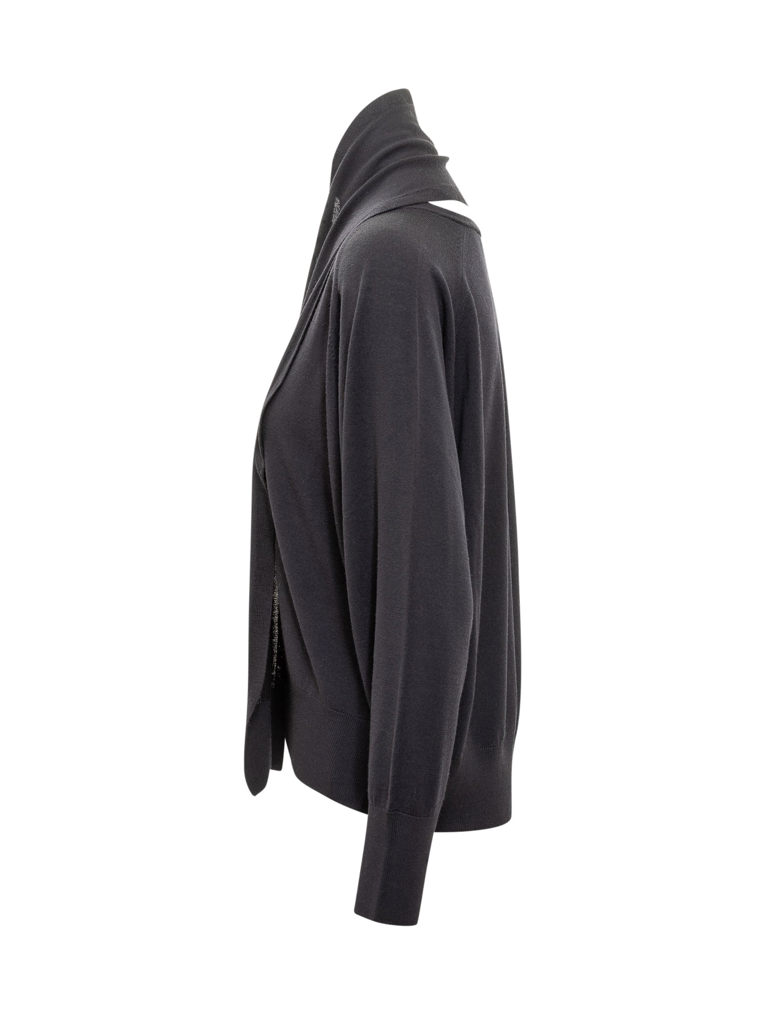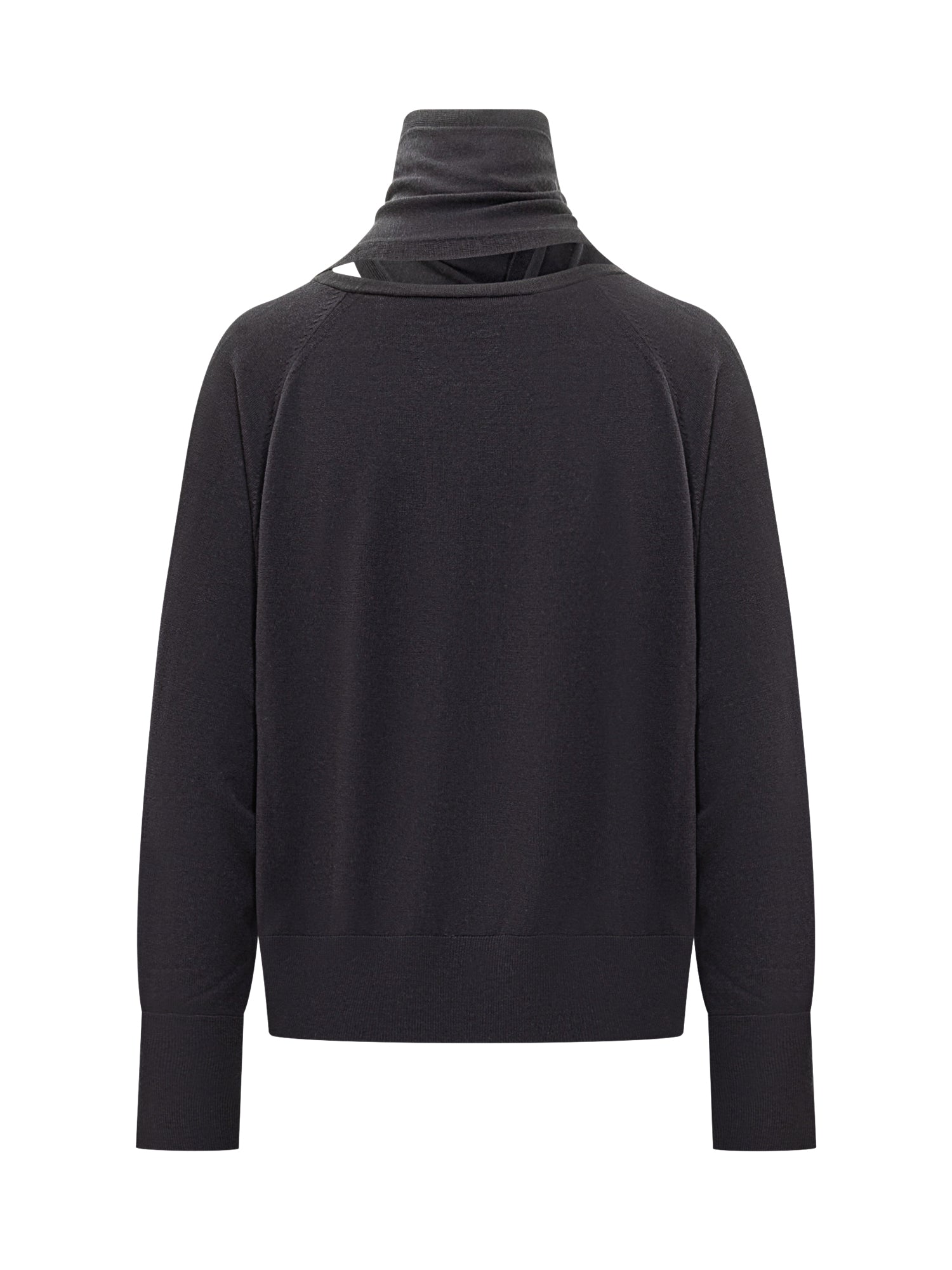 Black lightweight wool sweater with integrated scarf and asymmetric cut-out detail, offering a sophisticated and contemporary style.