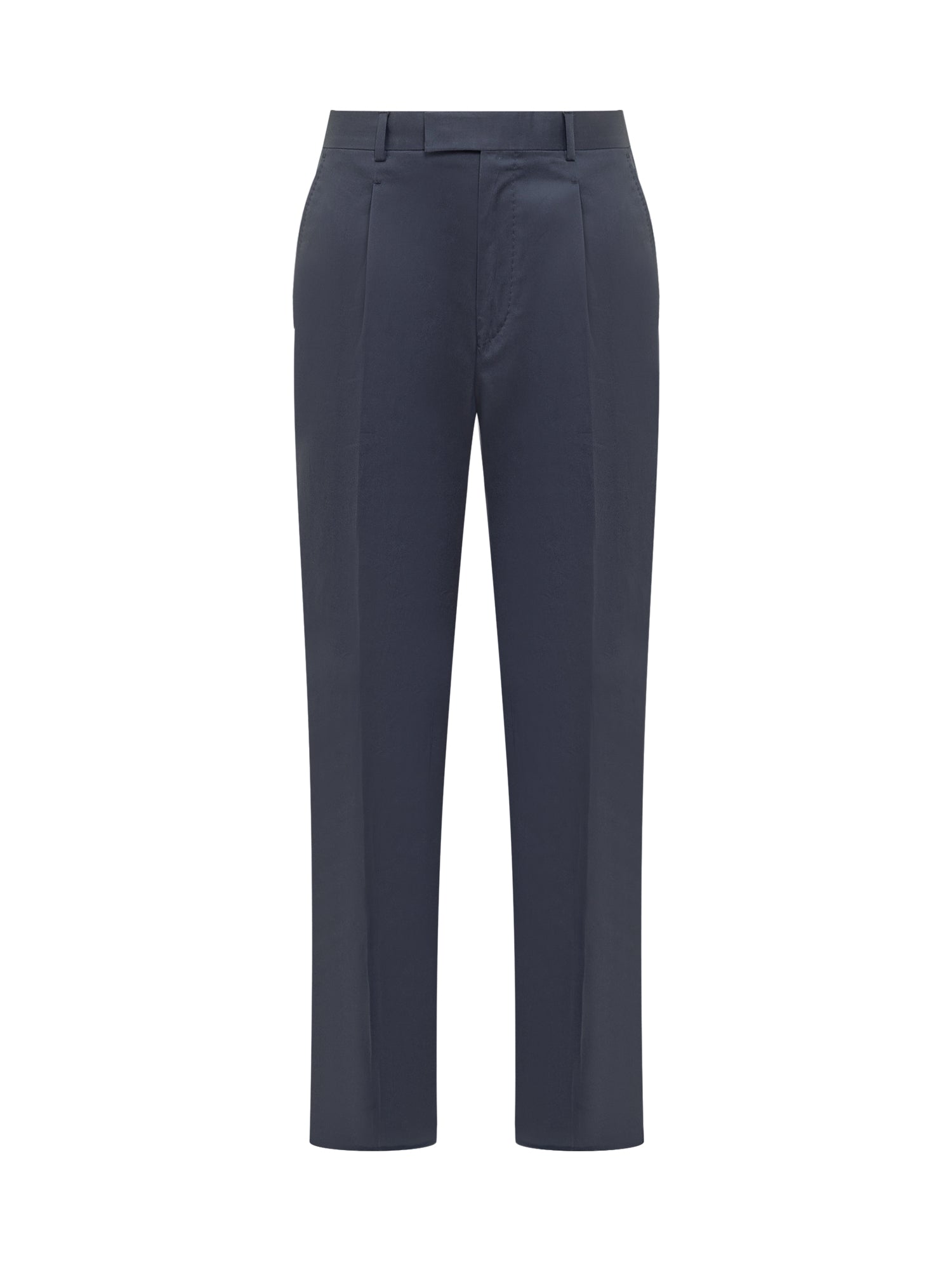 Long straight fit cotton trousers. Zip and hook fastening. Belt loops. Four pockets. Darts on the front.