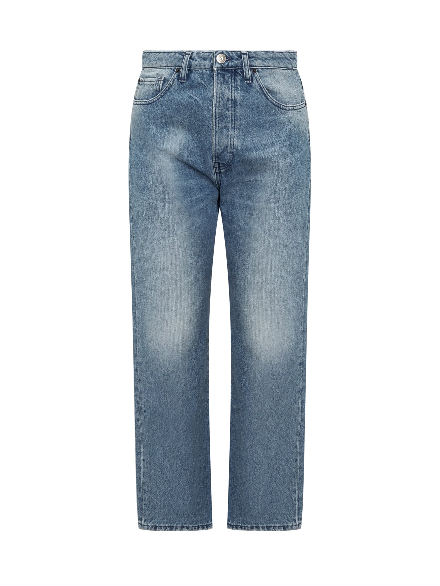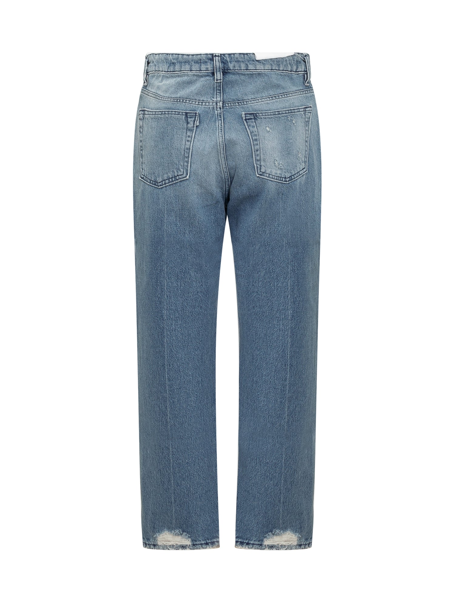 Jeans vita alta. Chiusura con bottoni a scomparsa. 5 tasche. Passanti per cintura. Effetto usurato sul fondo.
