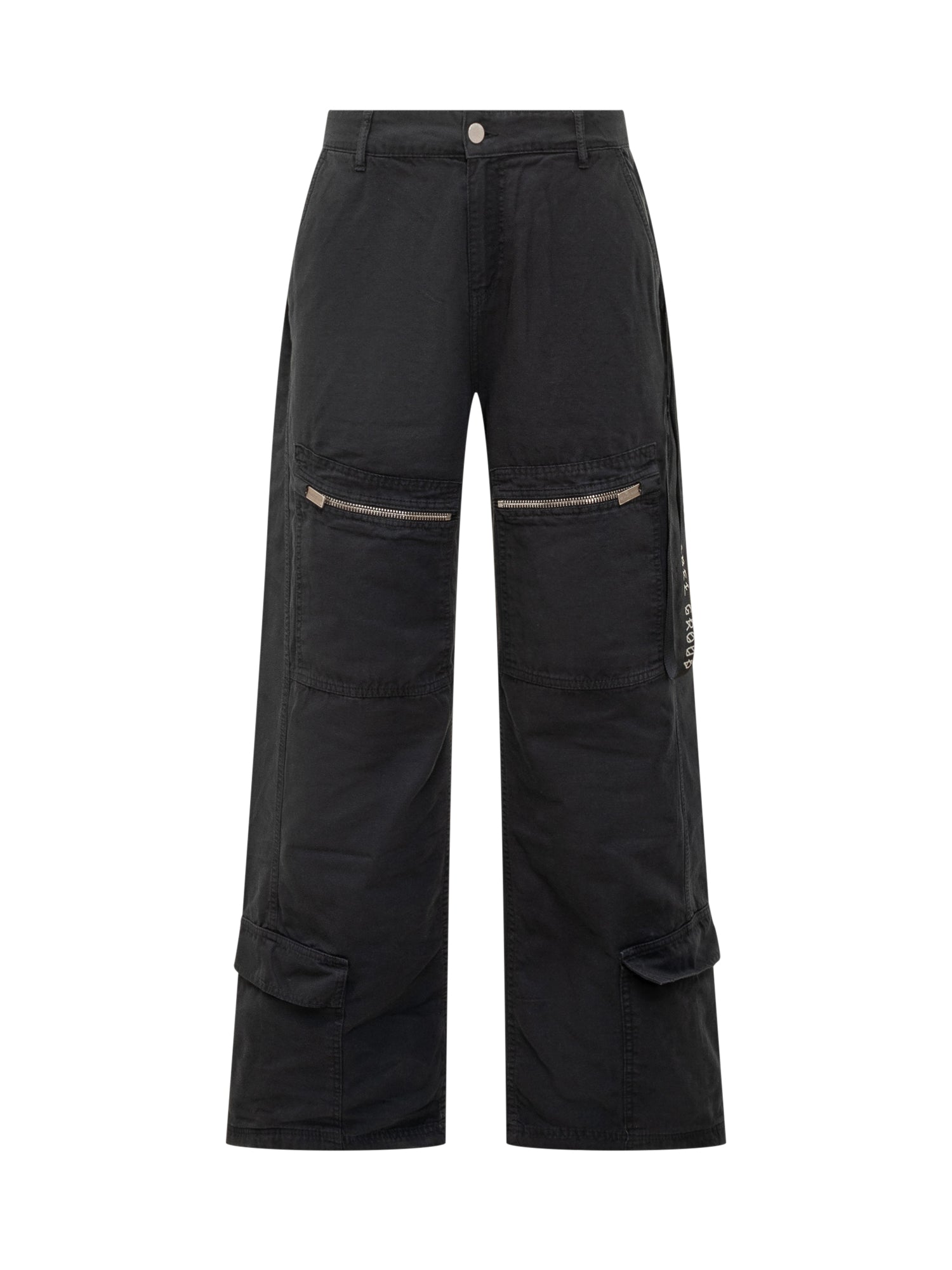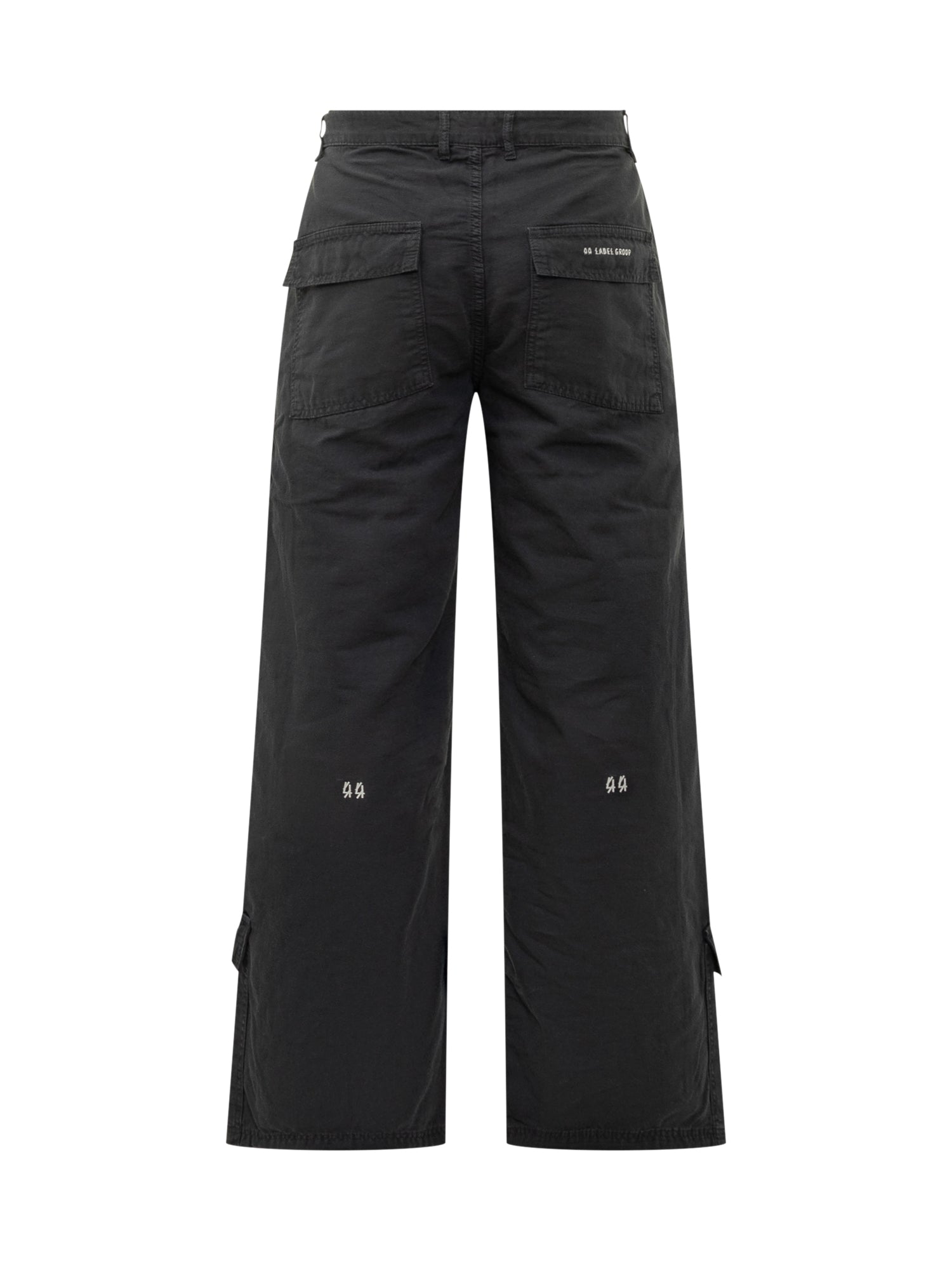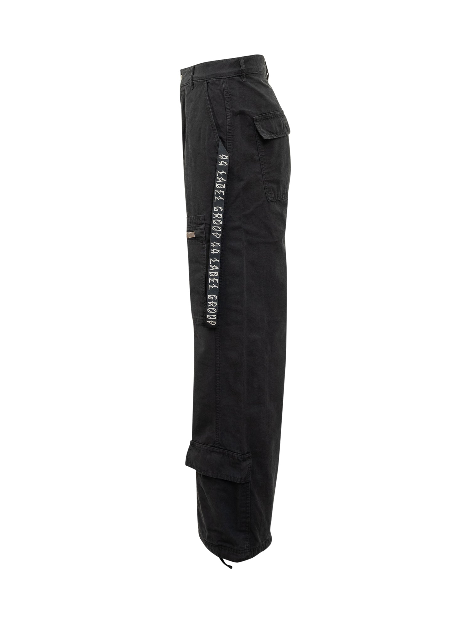 Pantaloni cargo 44 Label Group in cotone nero con vestibilità ampia, tasche multiple e dettagli con zip.