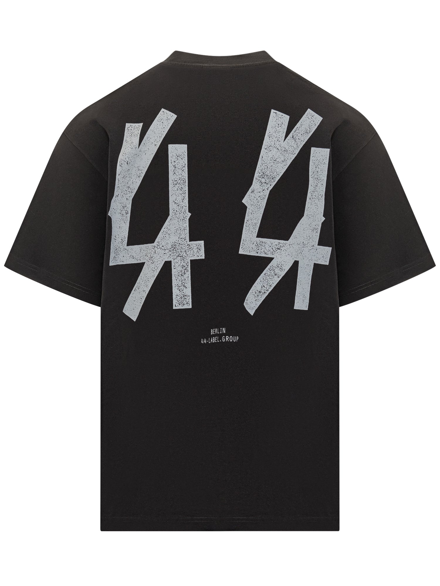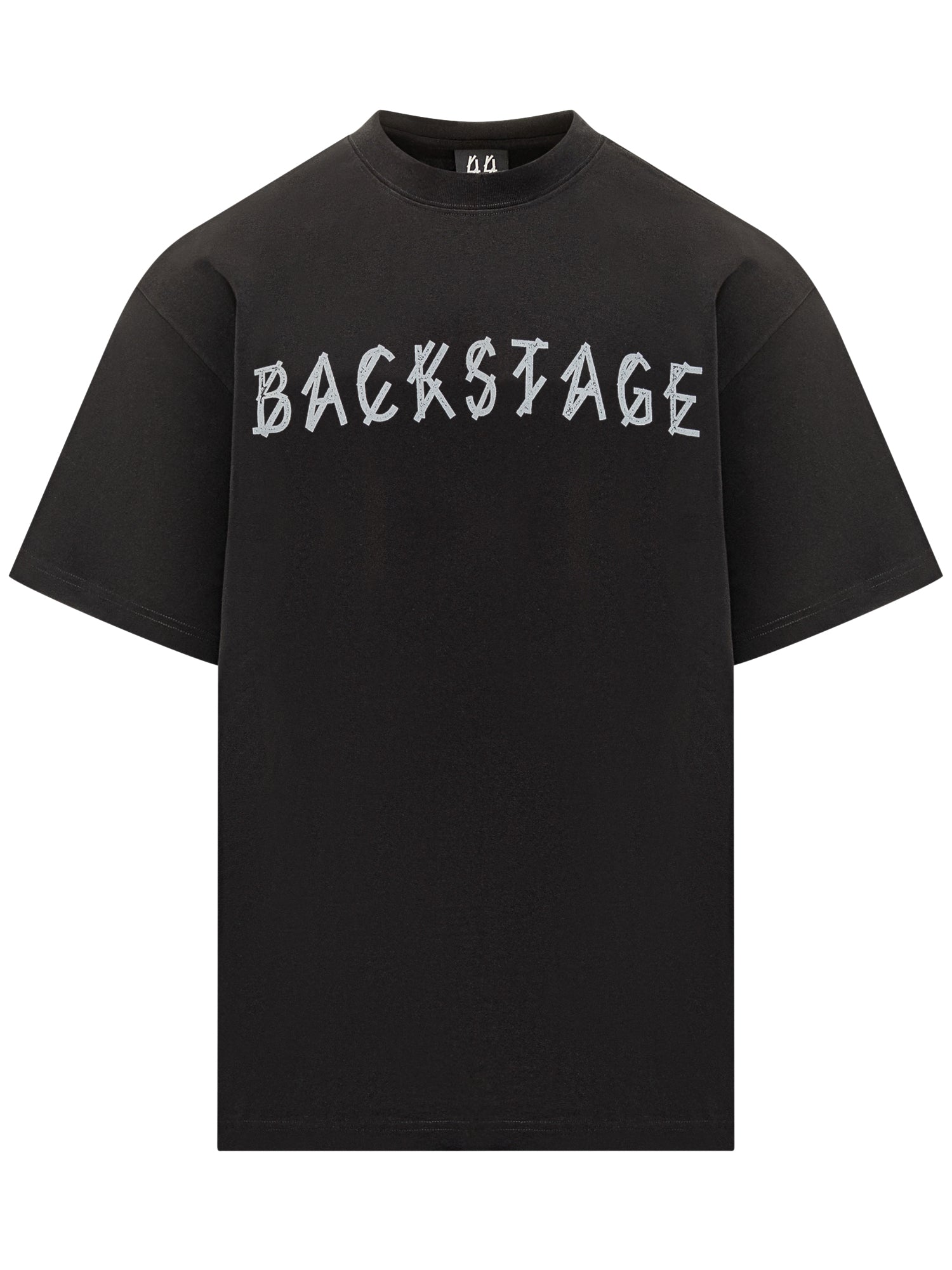 T-shirt 44 Label Group in cotone nero con stampa frontale Backstage in carattere gotico.
