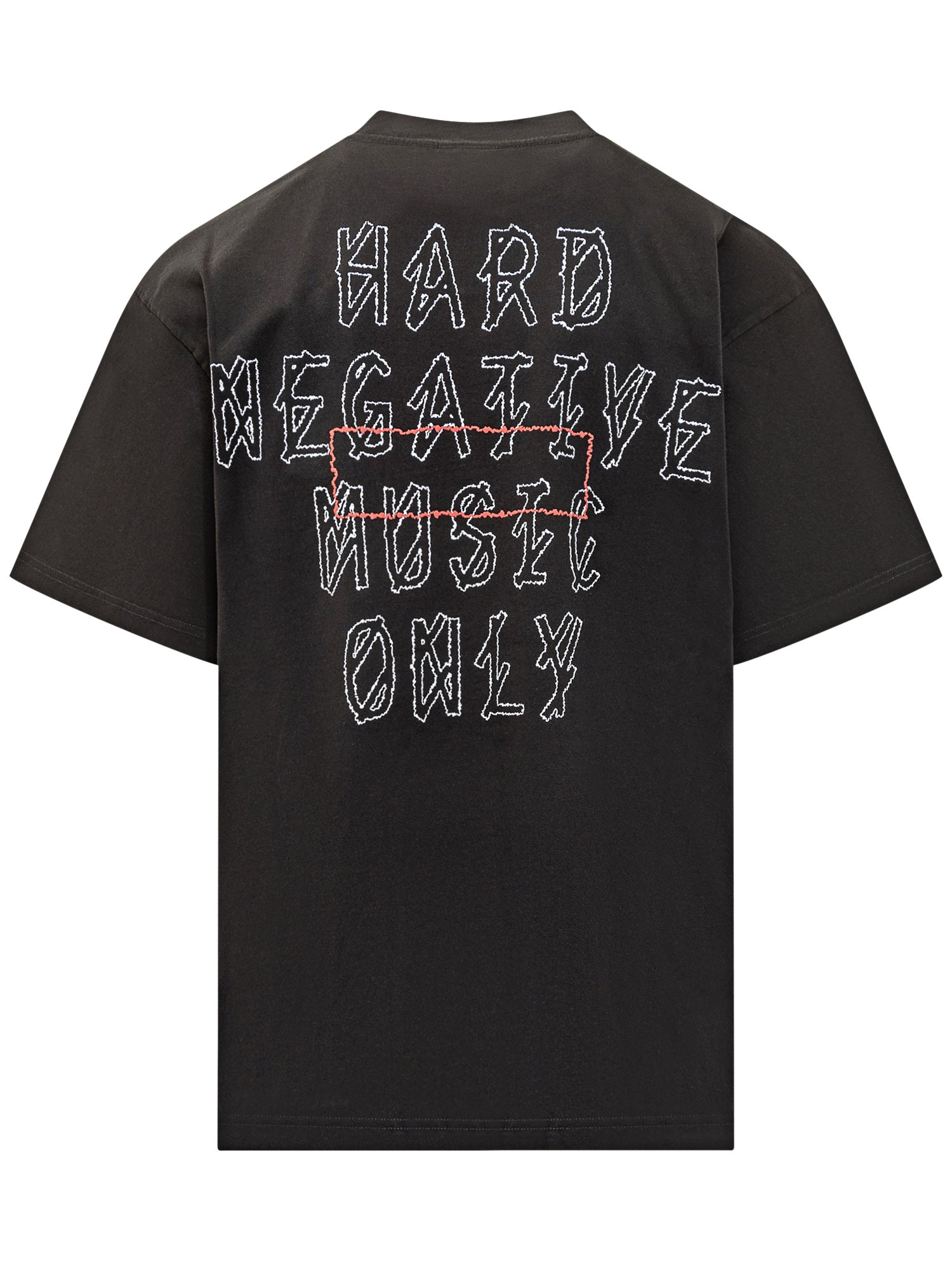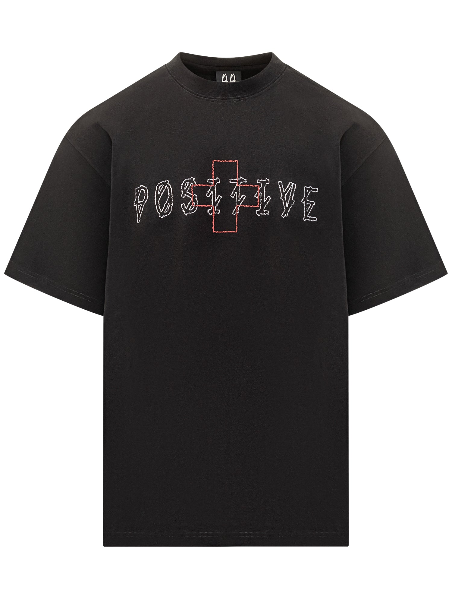 T-shirt oversize 44 Label Group in cotone nero con logo "Positive" ricamato e croce rossa centrale. Urban style deciso, perfetta per outfit streetwear contemporanei.