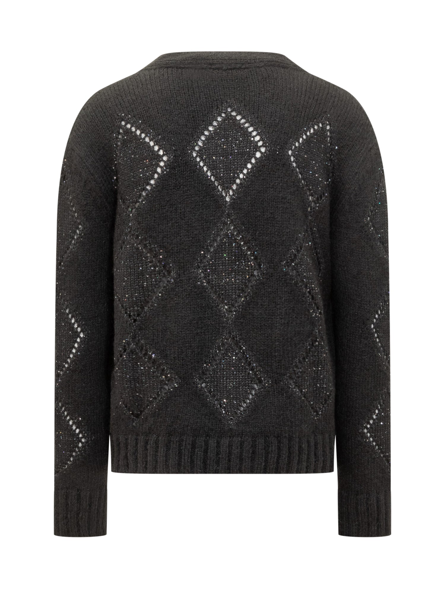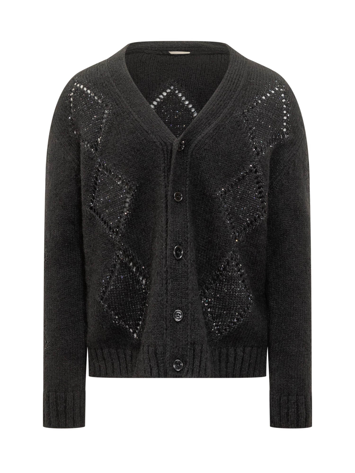 Cardigan A Paper Kid in maglia nera con motivo a rombi impreziosito da cristalli. Chiusura frontale a bottoni e vestibilità morbida.