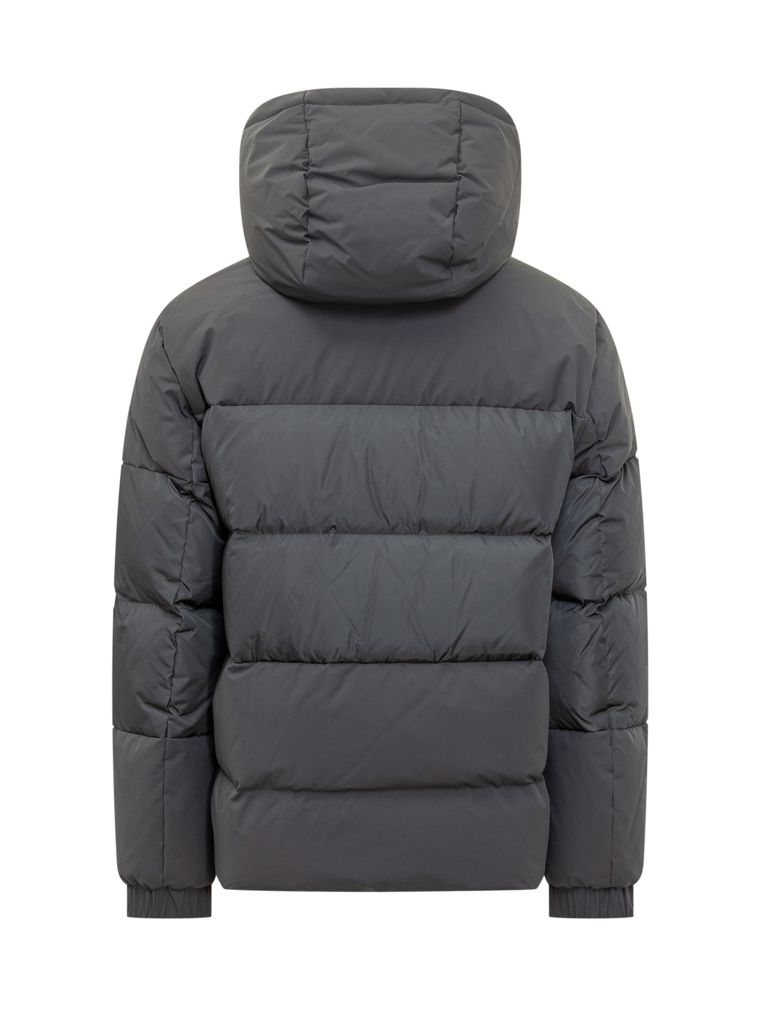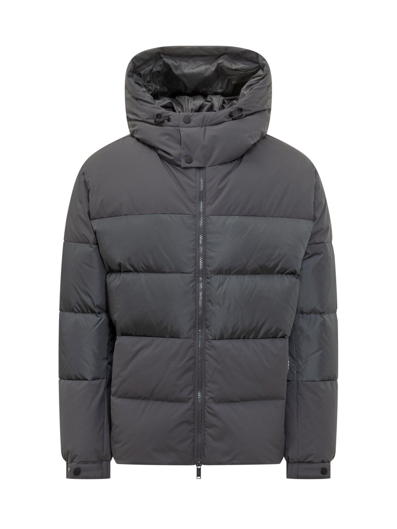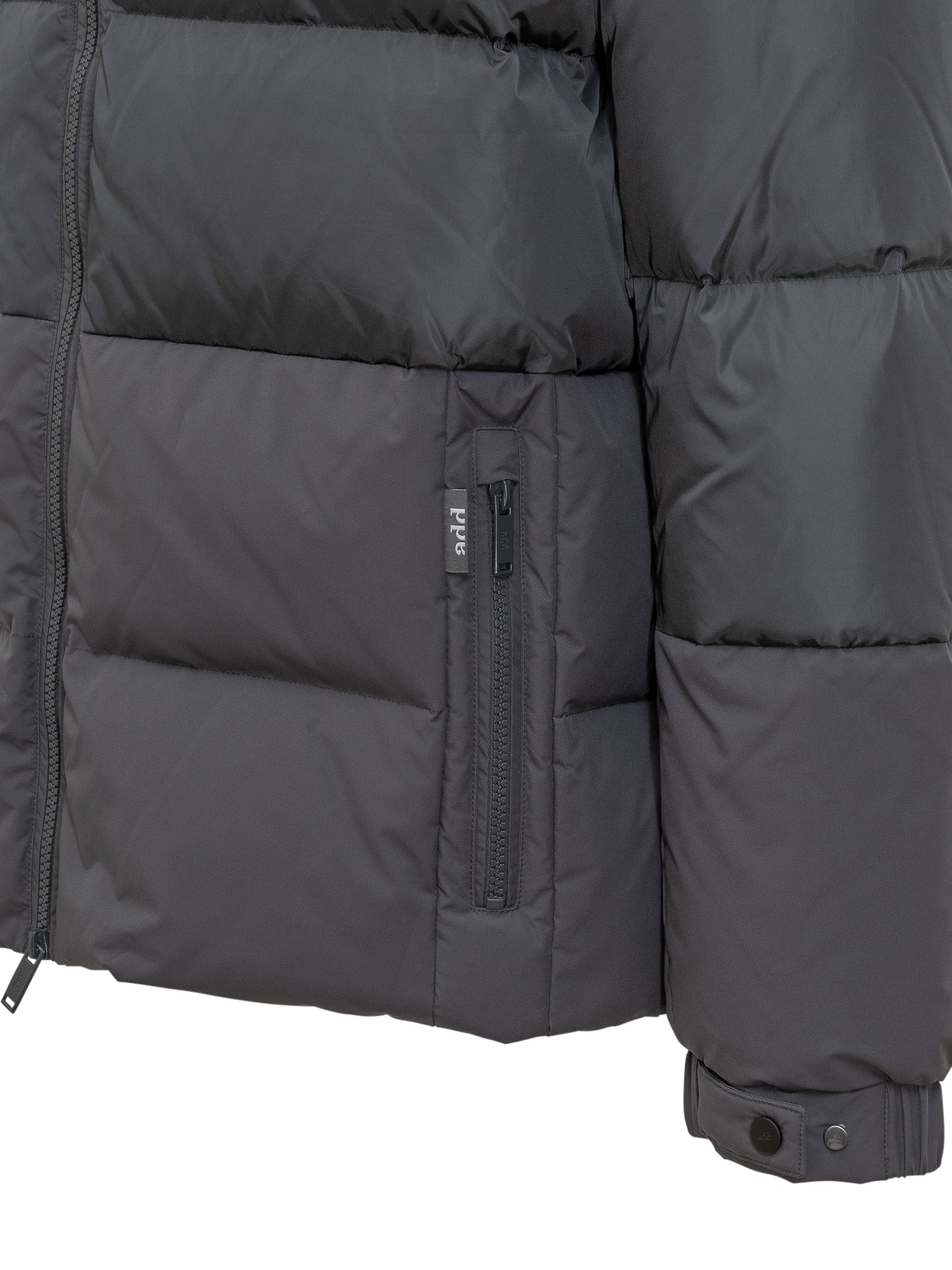 Piumino Add nero con imbottitura calda e trapuntatura orizzontale. Dotato di cappuccio regolabile, zip frontale e tasche laterali.