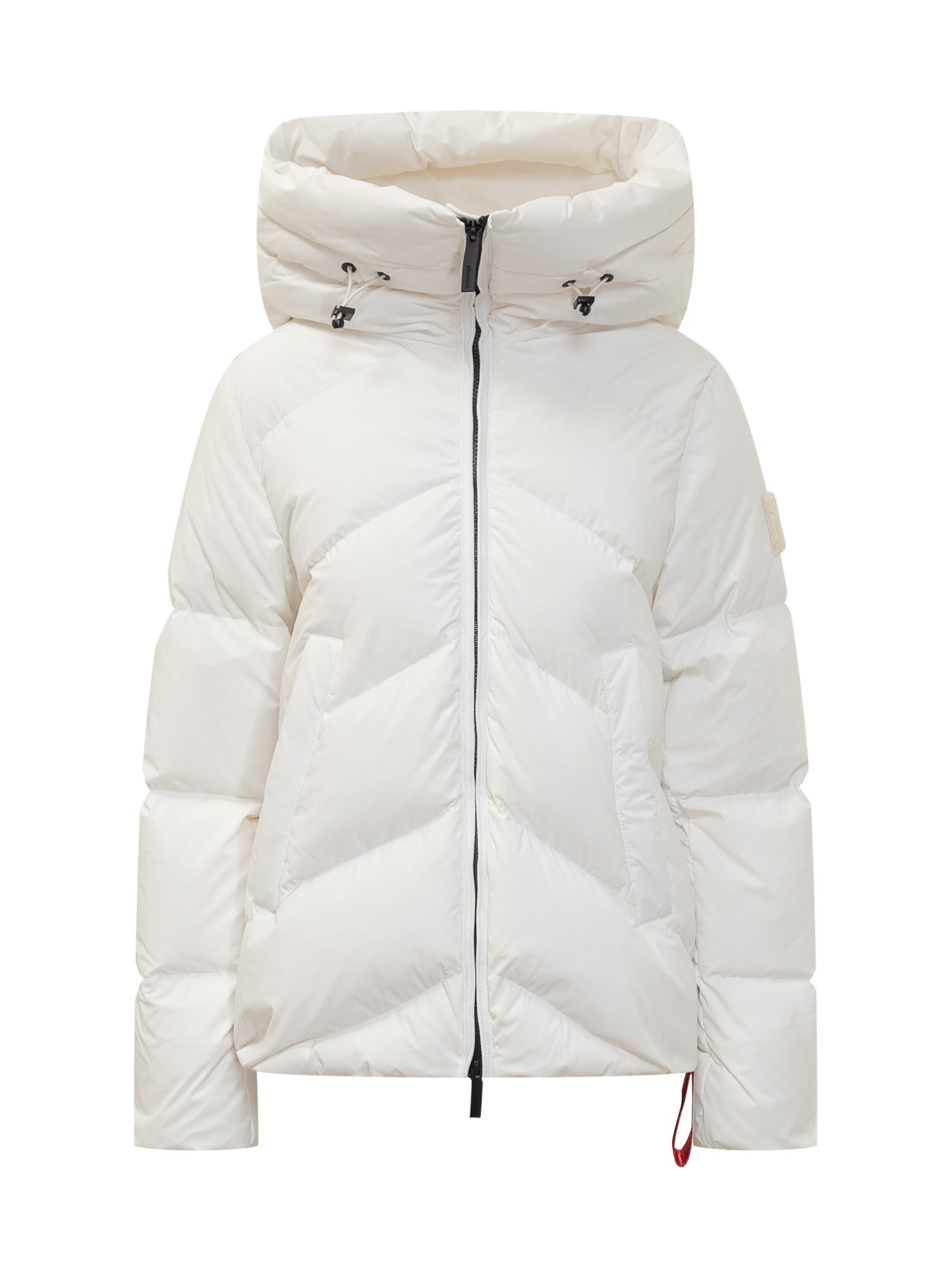 Piumino After Label bianco con trapuntatura a chevron e cappuccio regolabile. Imbottitura calda e silhouette moderna.