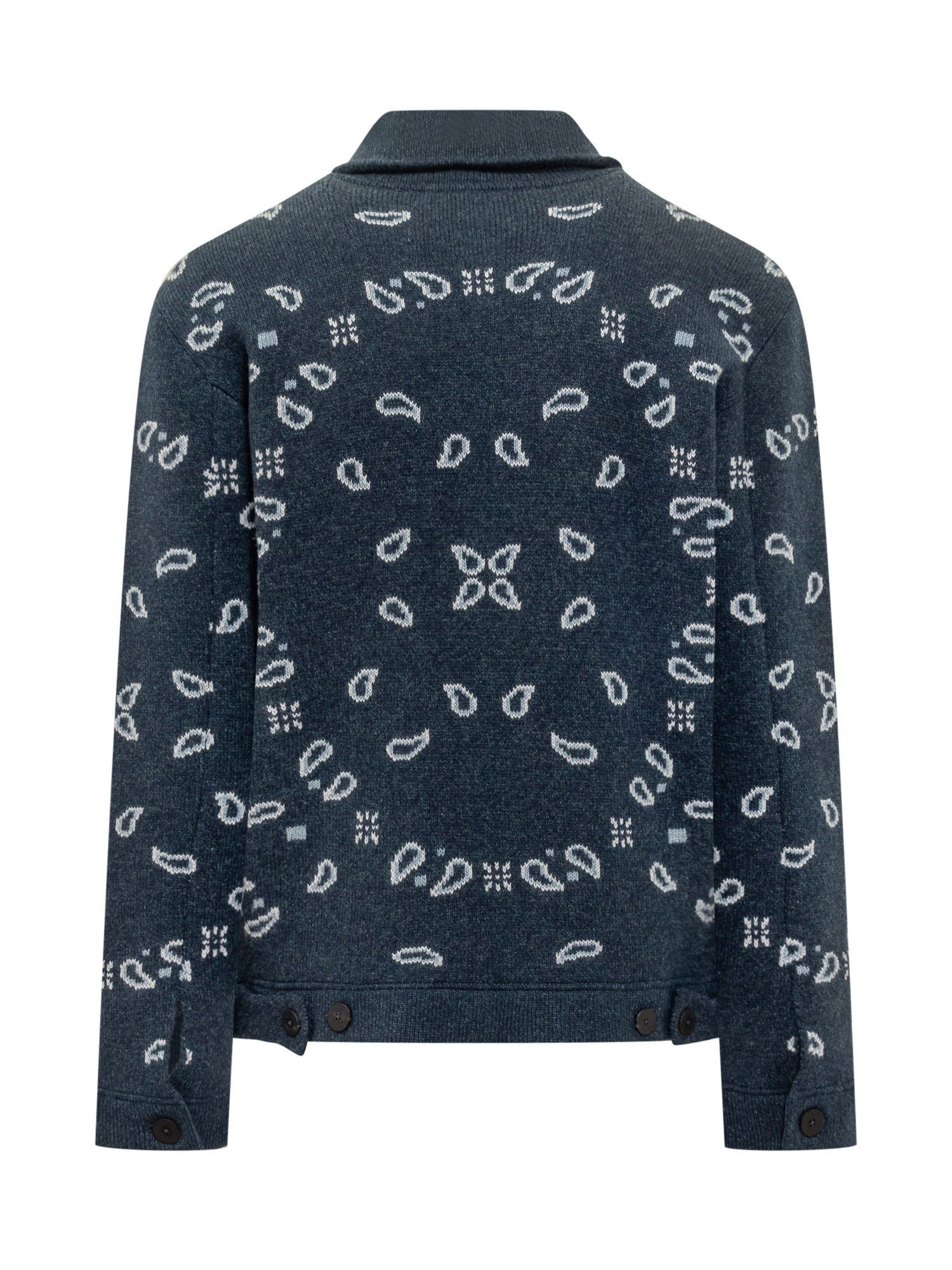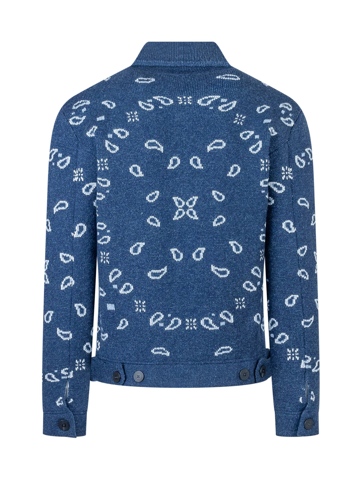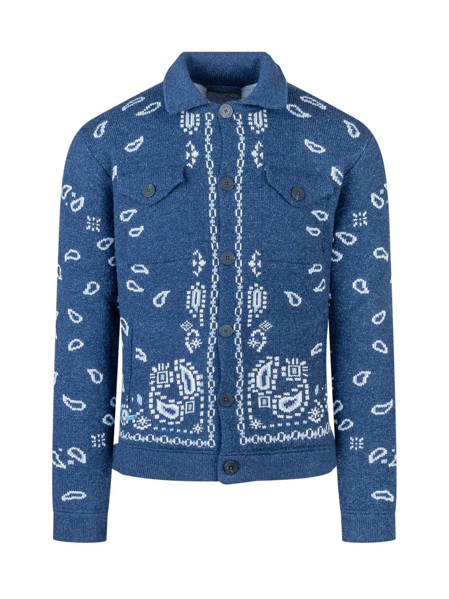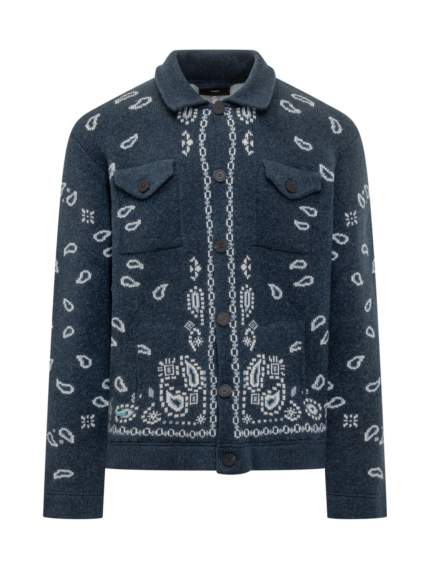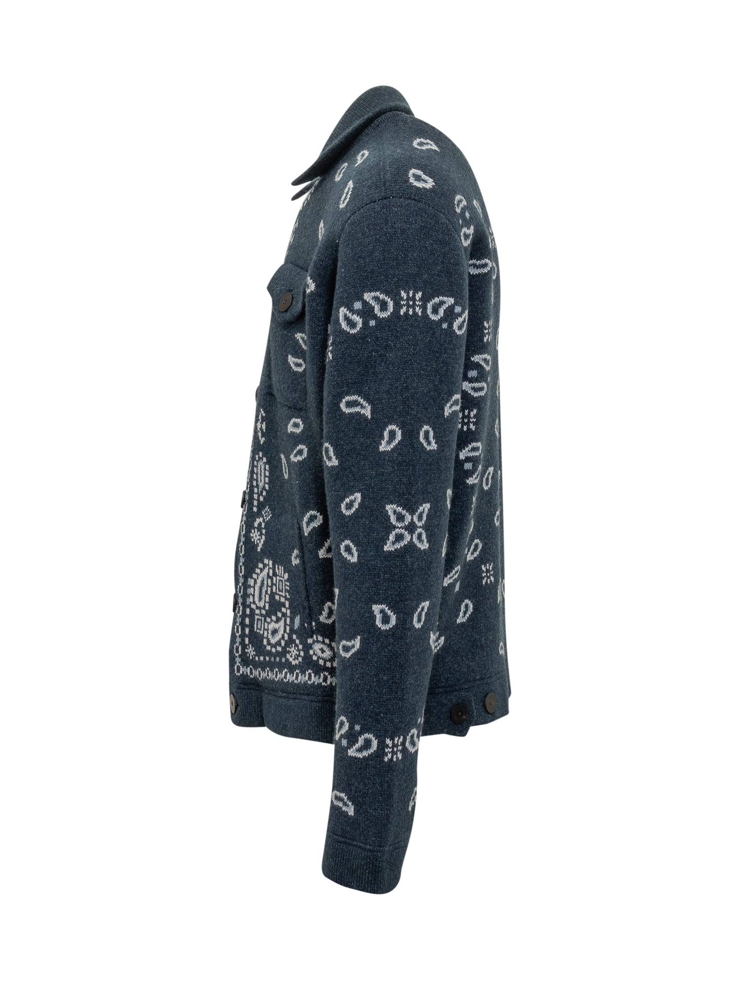 Cardigan blu Alanui con motivo bandana a contrasto e chiusura con bottoni frontali. Realizzato con lavorazione jacquard e tasche sul petto.