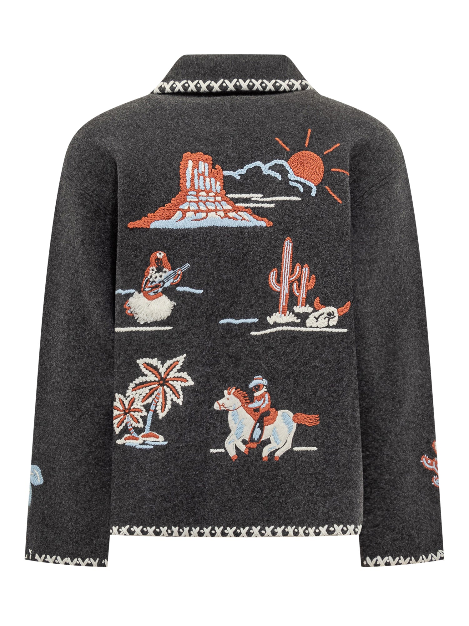 Giacca Alanui in lana grigio antracite con ricami colorati a tema palme e dettagli a contrasto sul profilo.