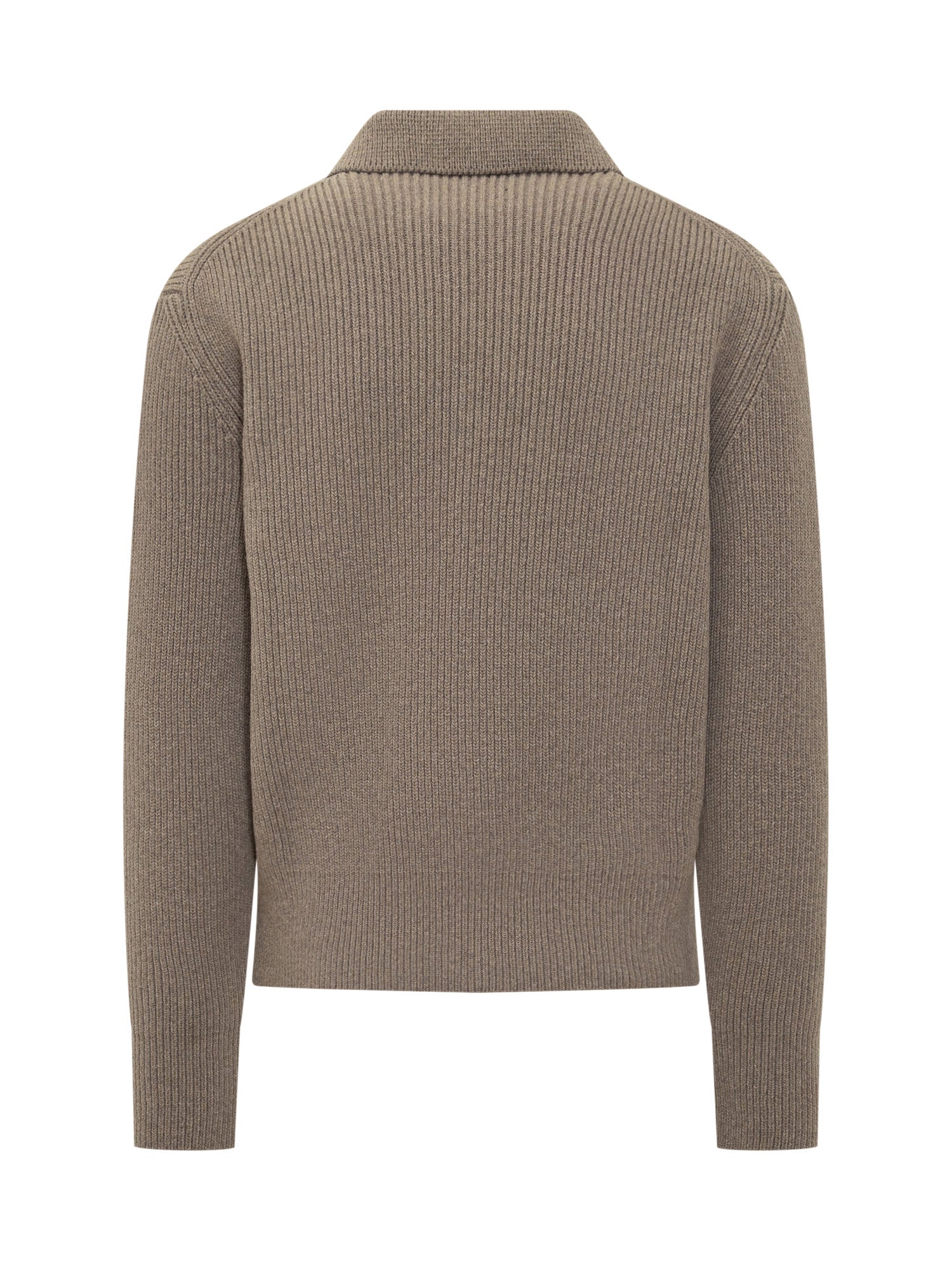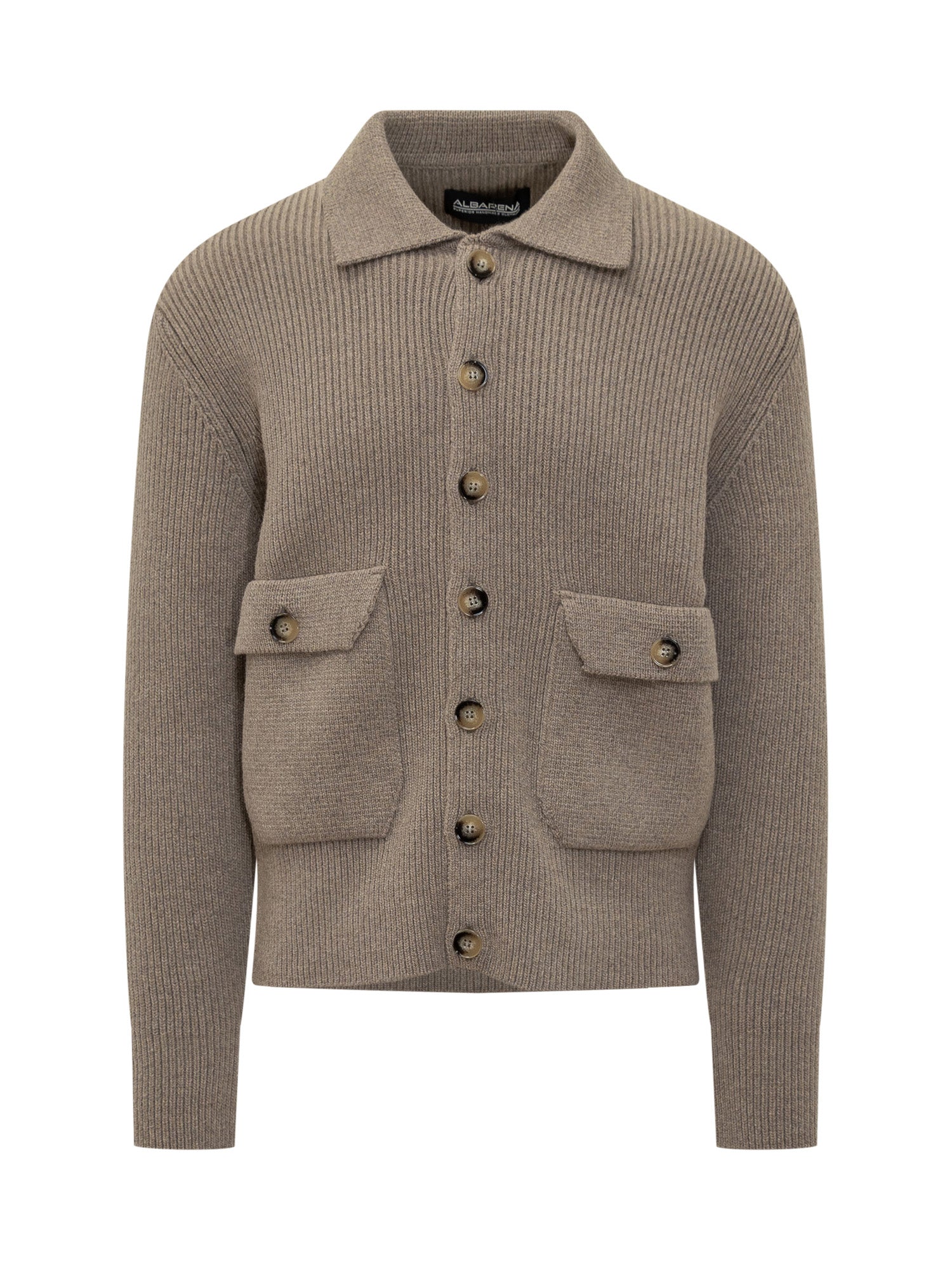 Cardigan Albarena in maglia beige con lavorazione a coste, chiusura a bottoni e tasche frontali con patta.