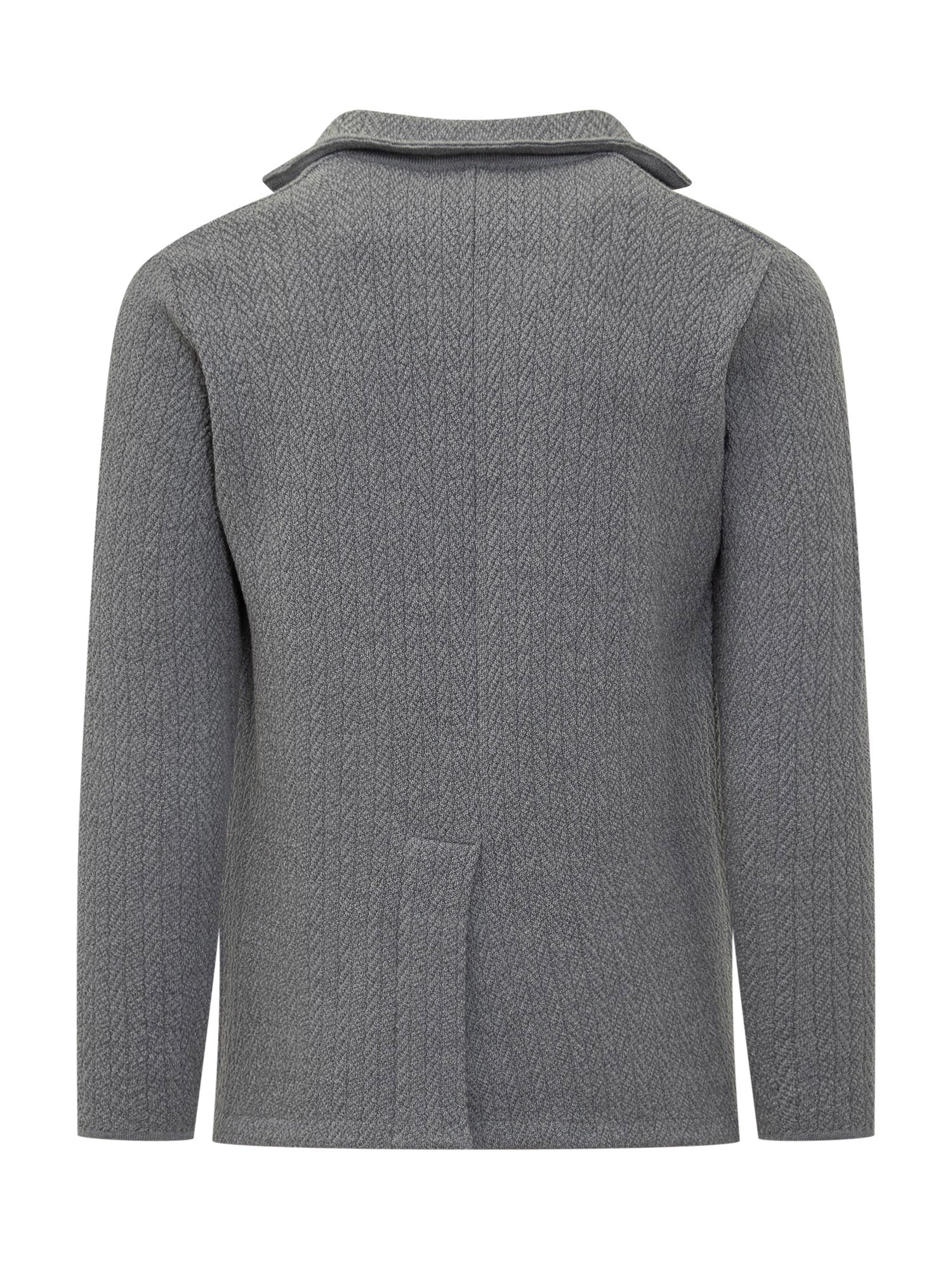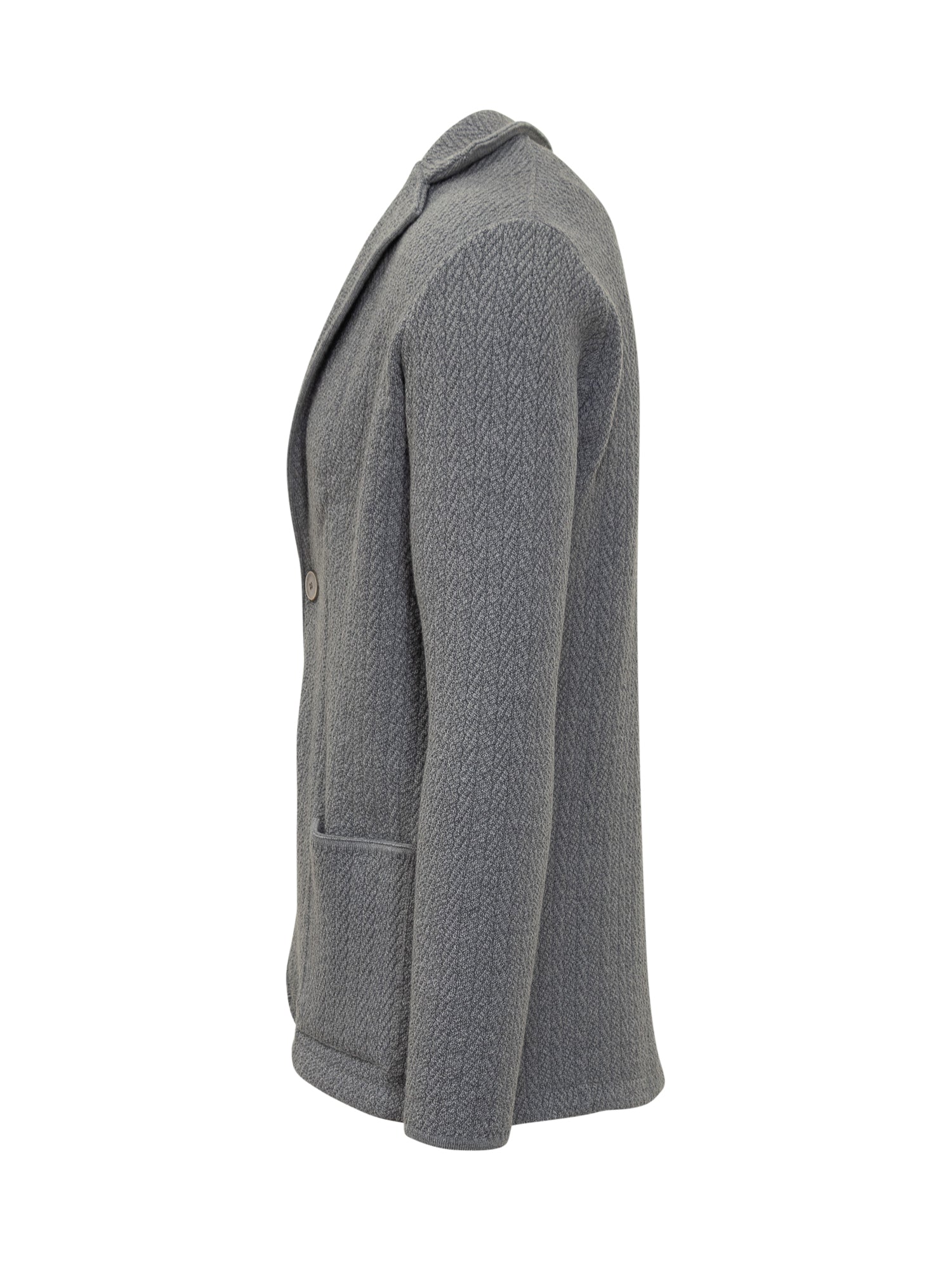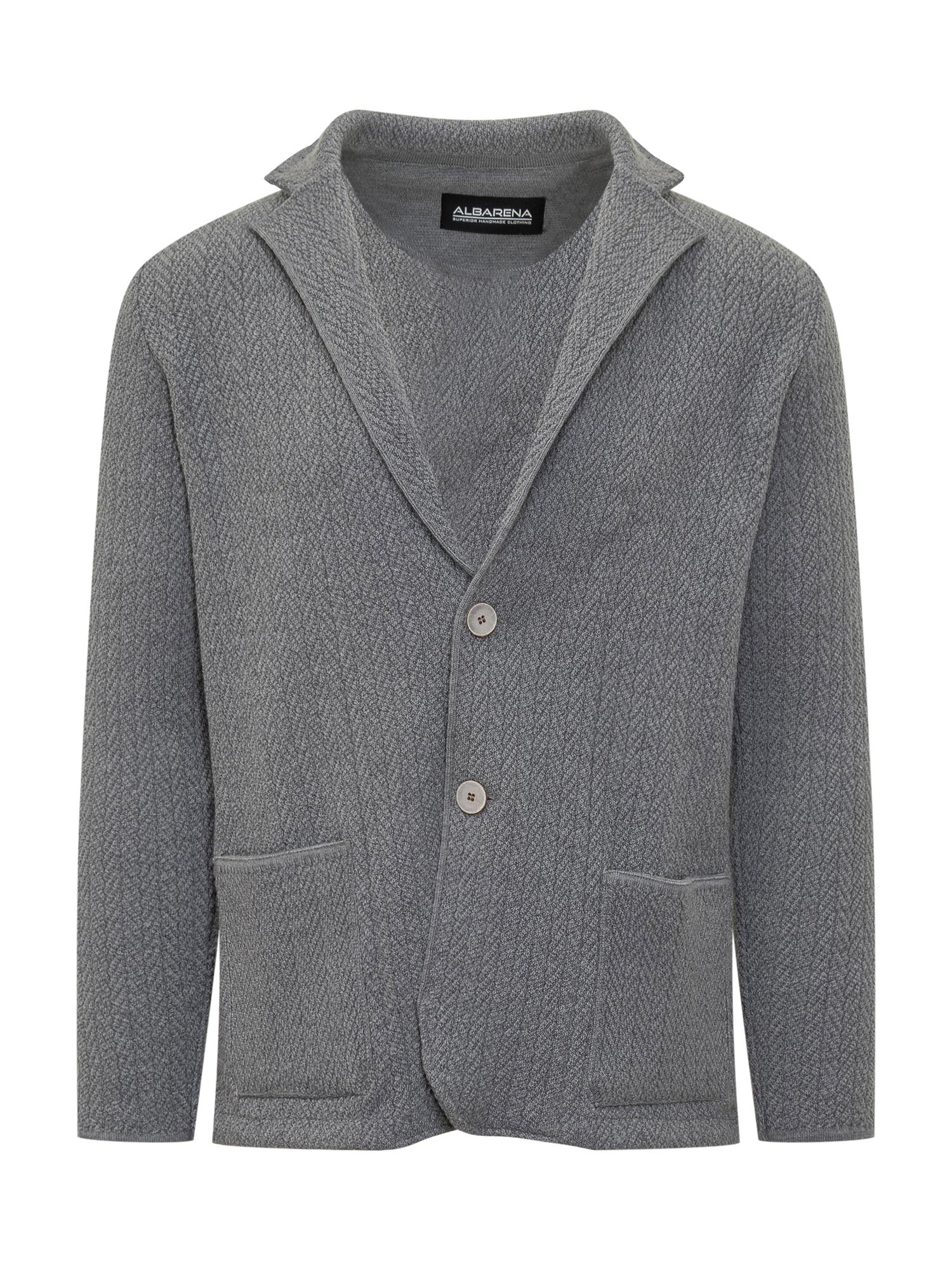 Giacca Albarena in maglia grigia con lavorazione a spigato, chiusura a due bottoni e tasche frontali applicate.