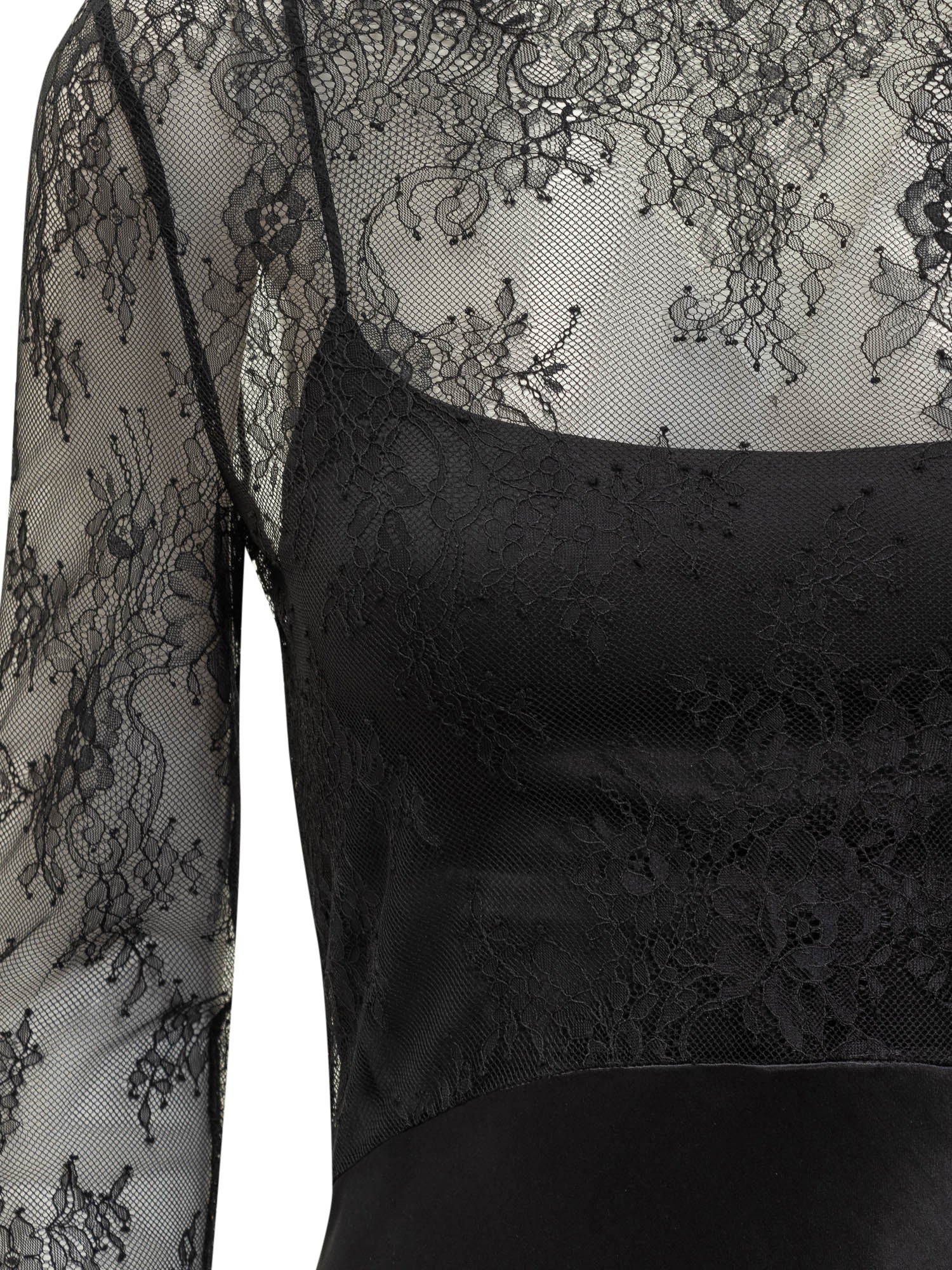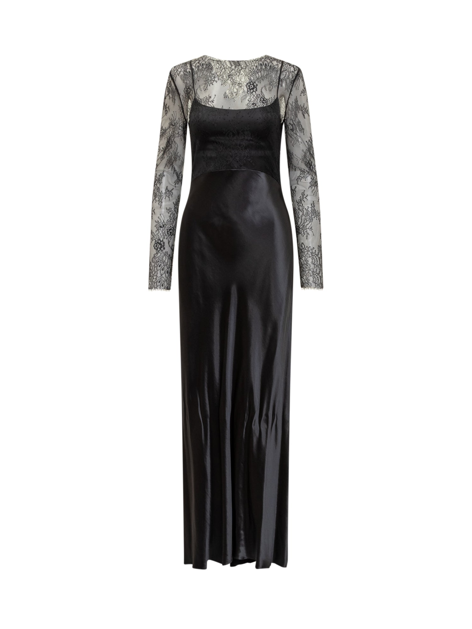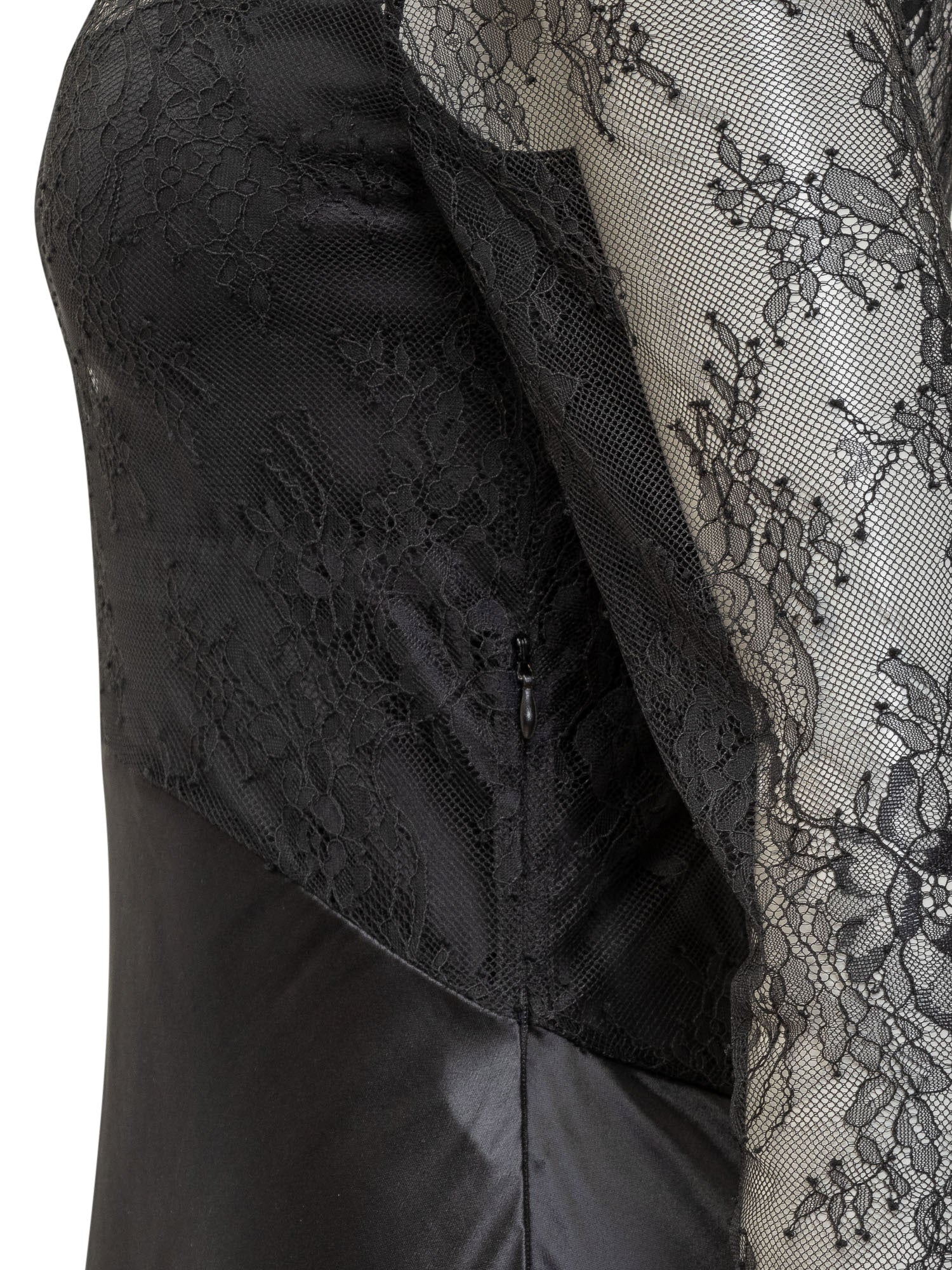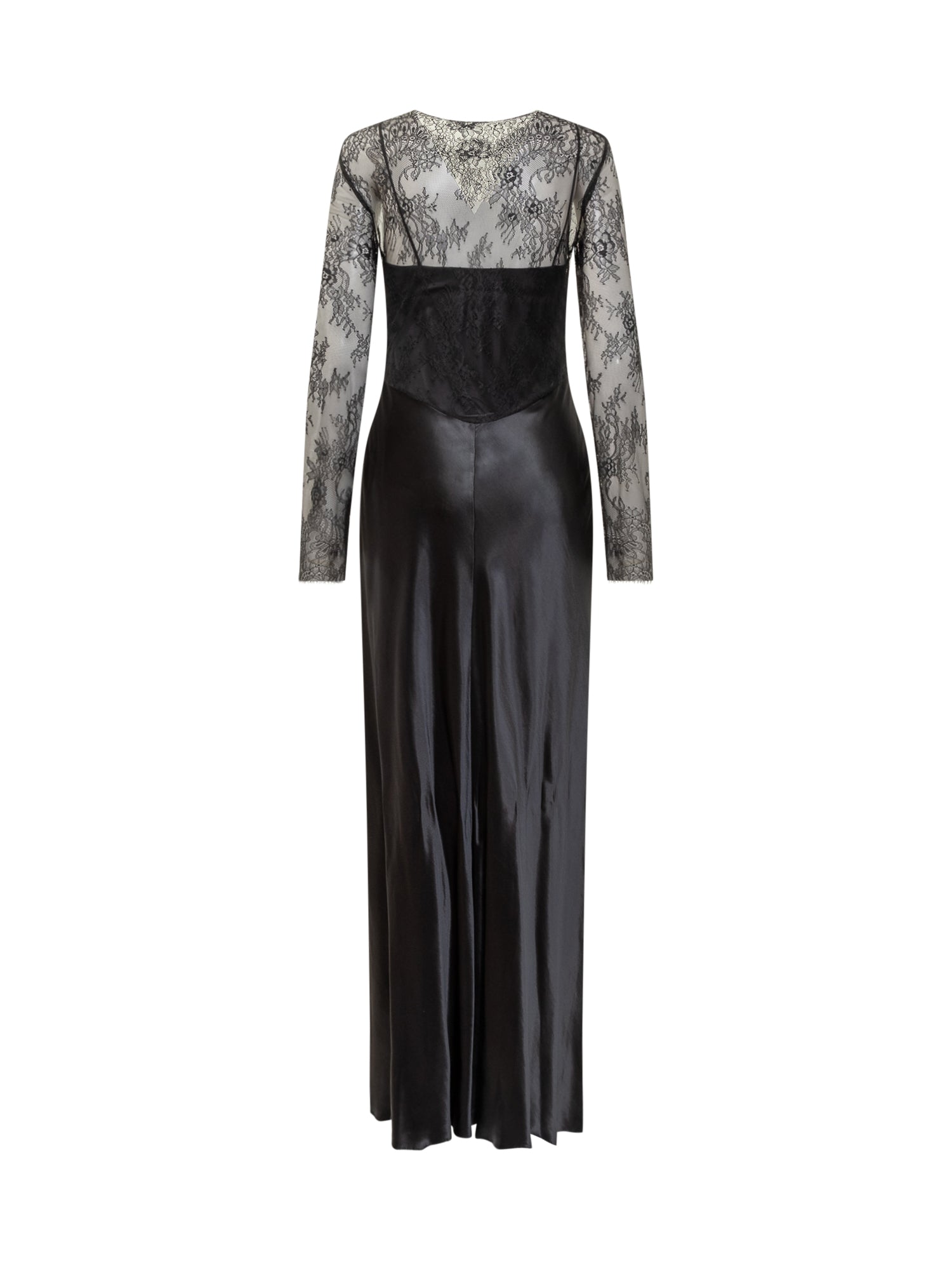 Abito lungo Alberta Ferretti in raso nero con dettagli in pizzo trasparente.