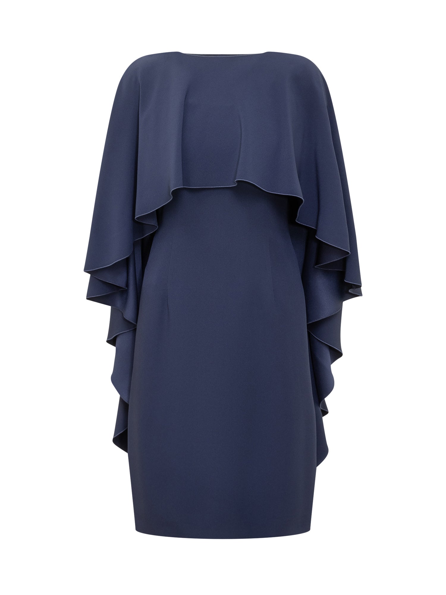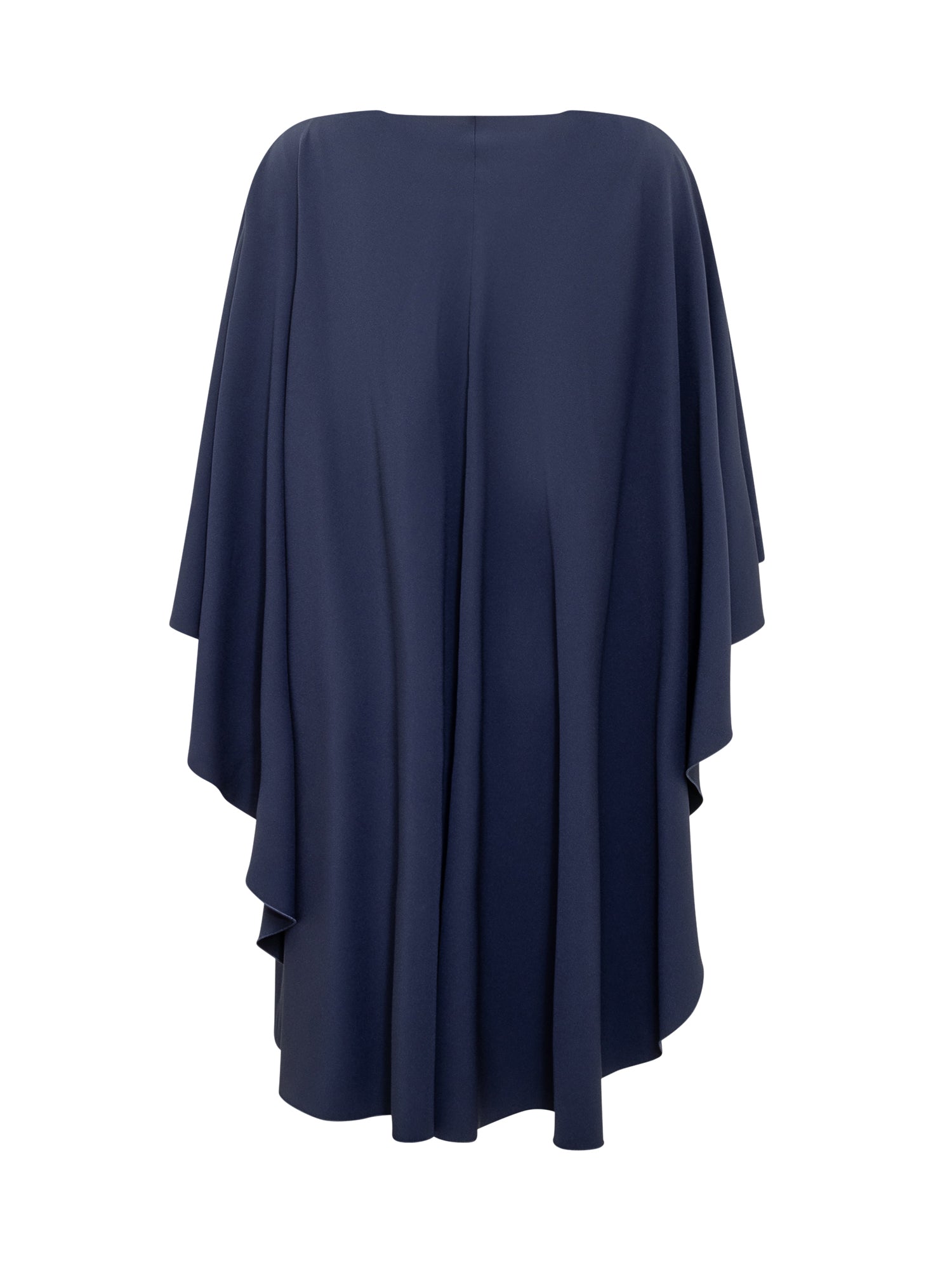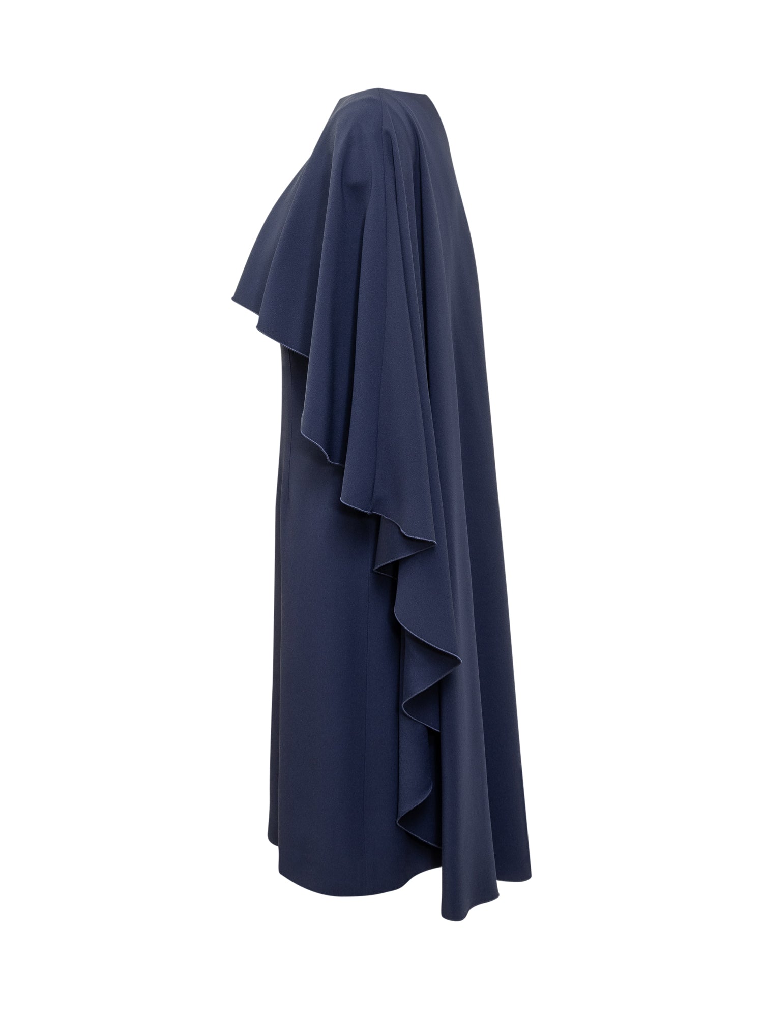 Abito midi blu. Scollo a barchetta. Chiusura con zip laterale. Effetto mantella con drappeggi.