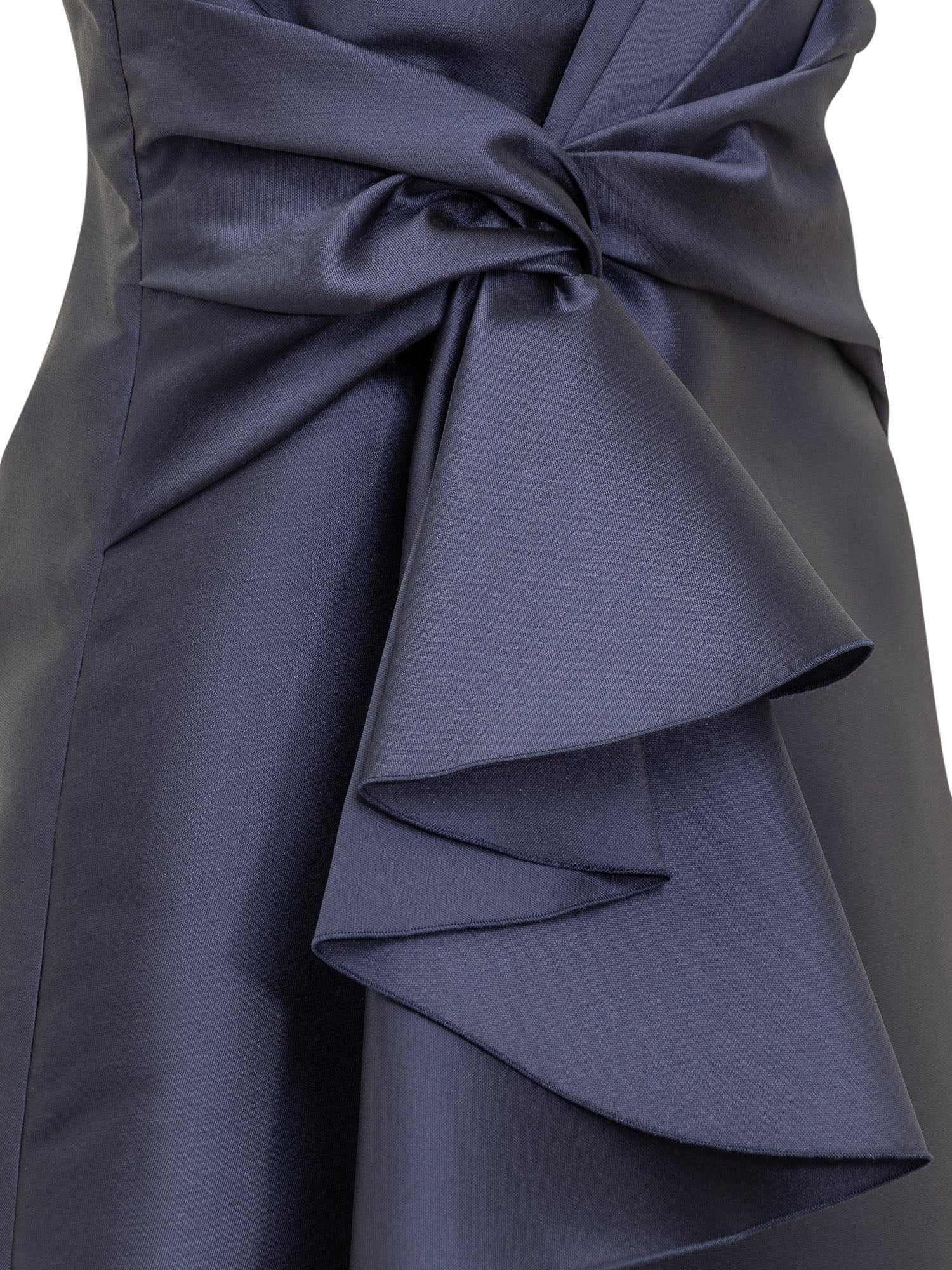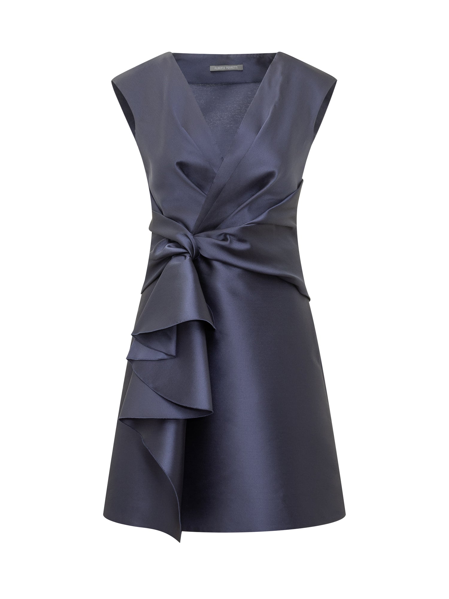Abito mini blu smanicato. Scollo a V sul davanti. Chiusura con zip laterale. Dettaglio maxi nodo con drappeggio laterale.