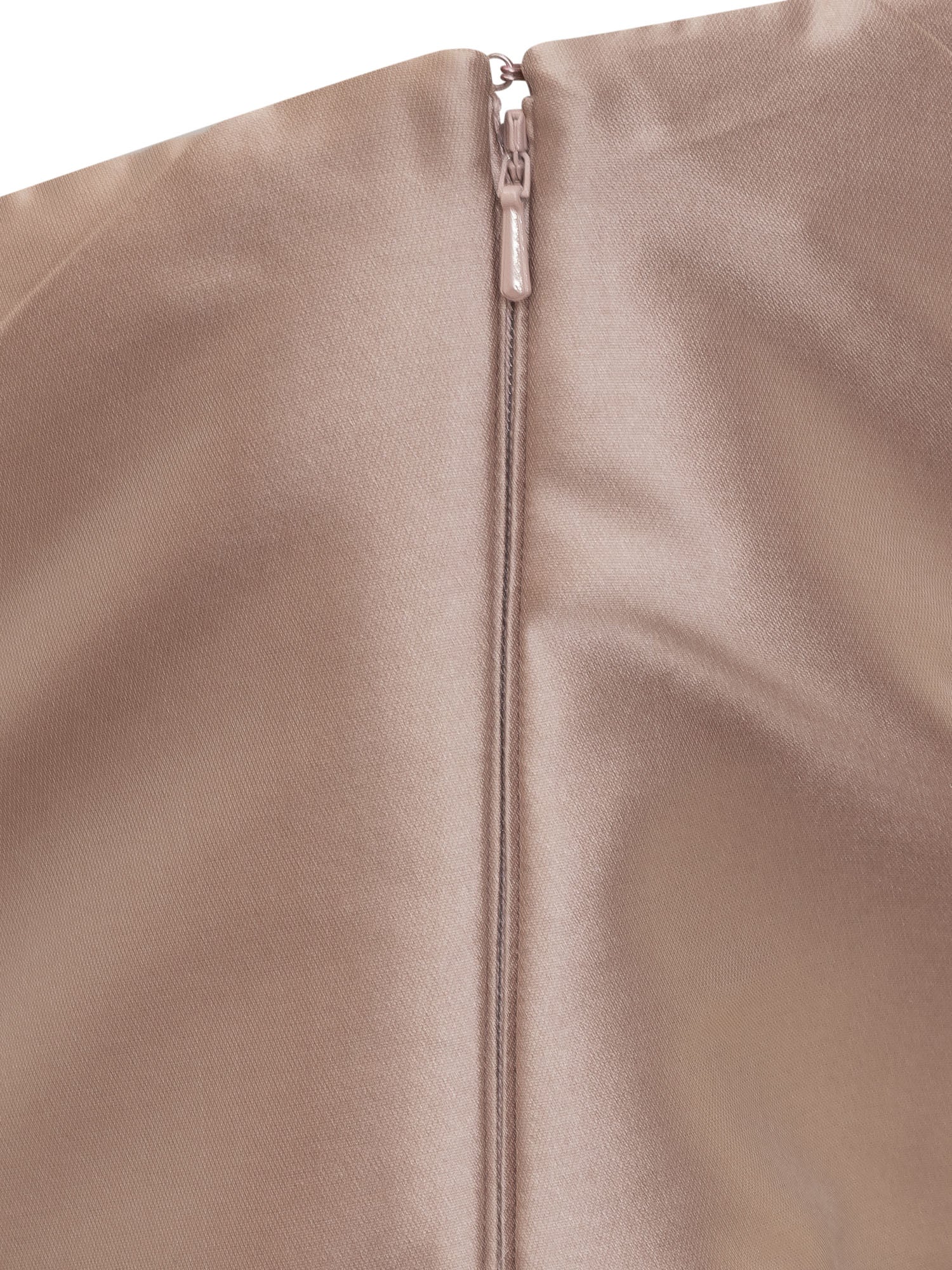 Abito midi rosa senza spallini. Chiusura con zip. Dettaglio drappeggiato sul davanti.