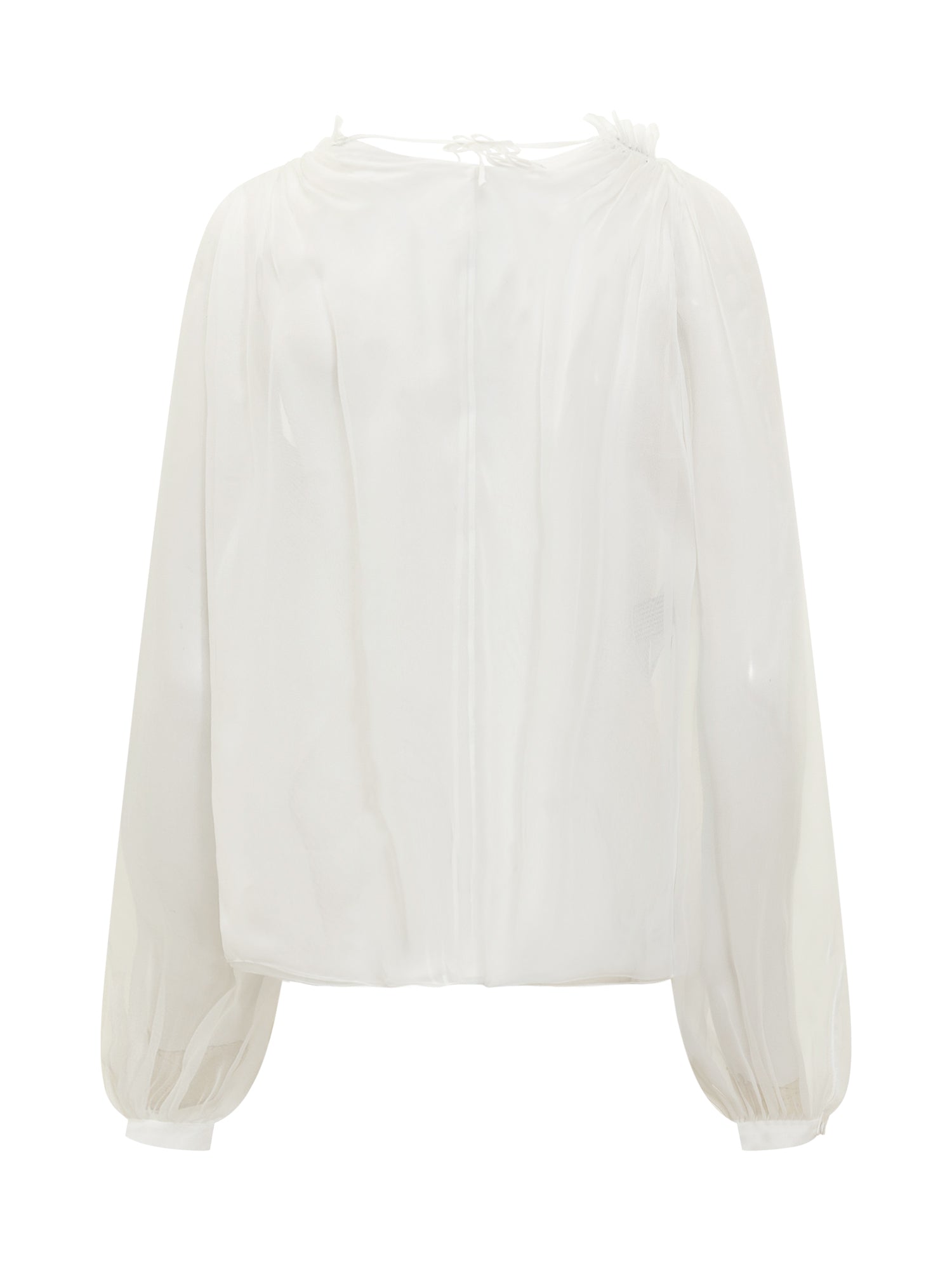 Blusa Alberta Ferretti in chiffon bianco con maniche lunghe ampie e fiore sullo scollo arricciato.