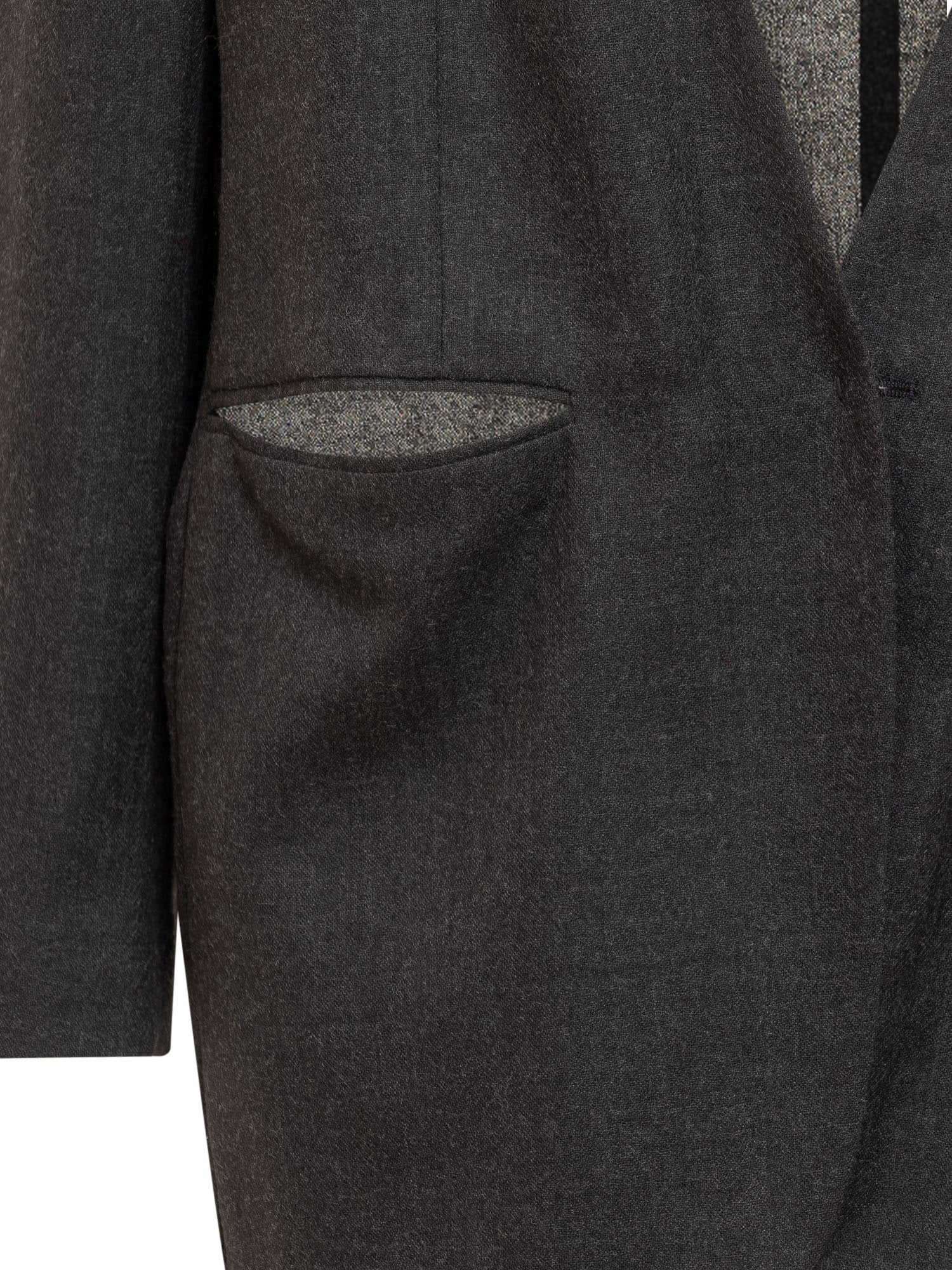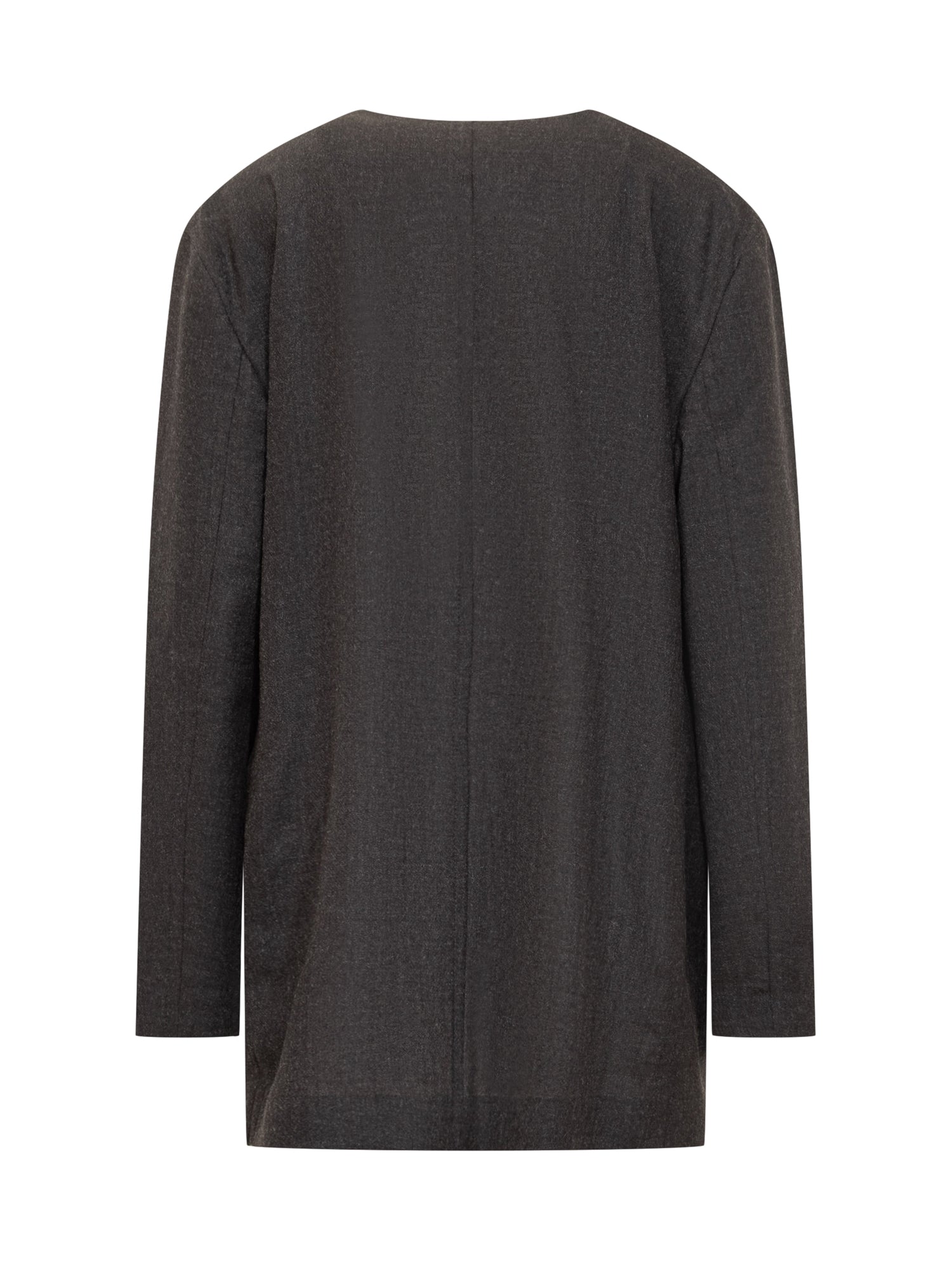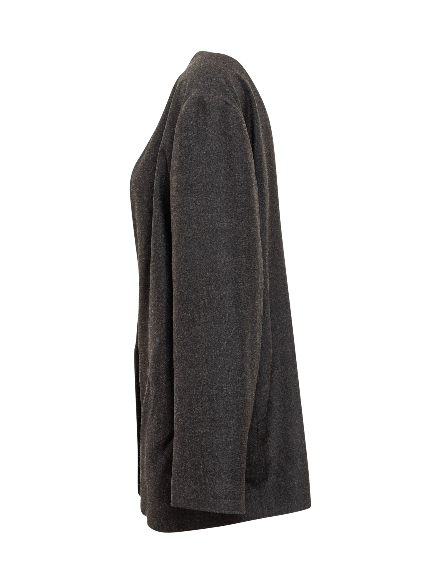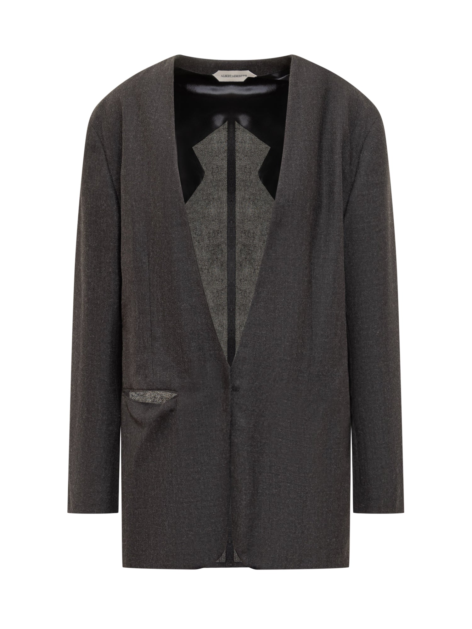 Giacca Alberta Ferretti in lana grigio antracite con profondo scollo a V, dettagli in contrasto all interno e taschino decorativo.