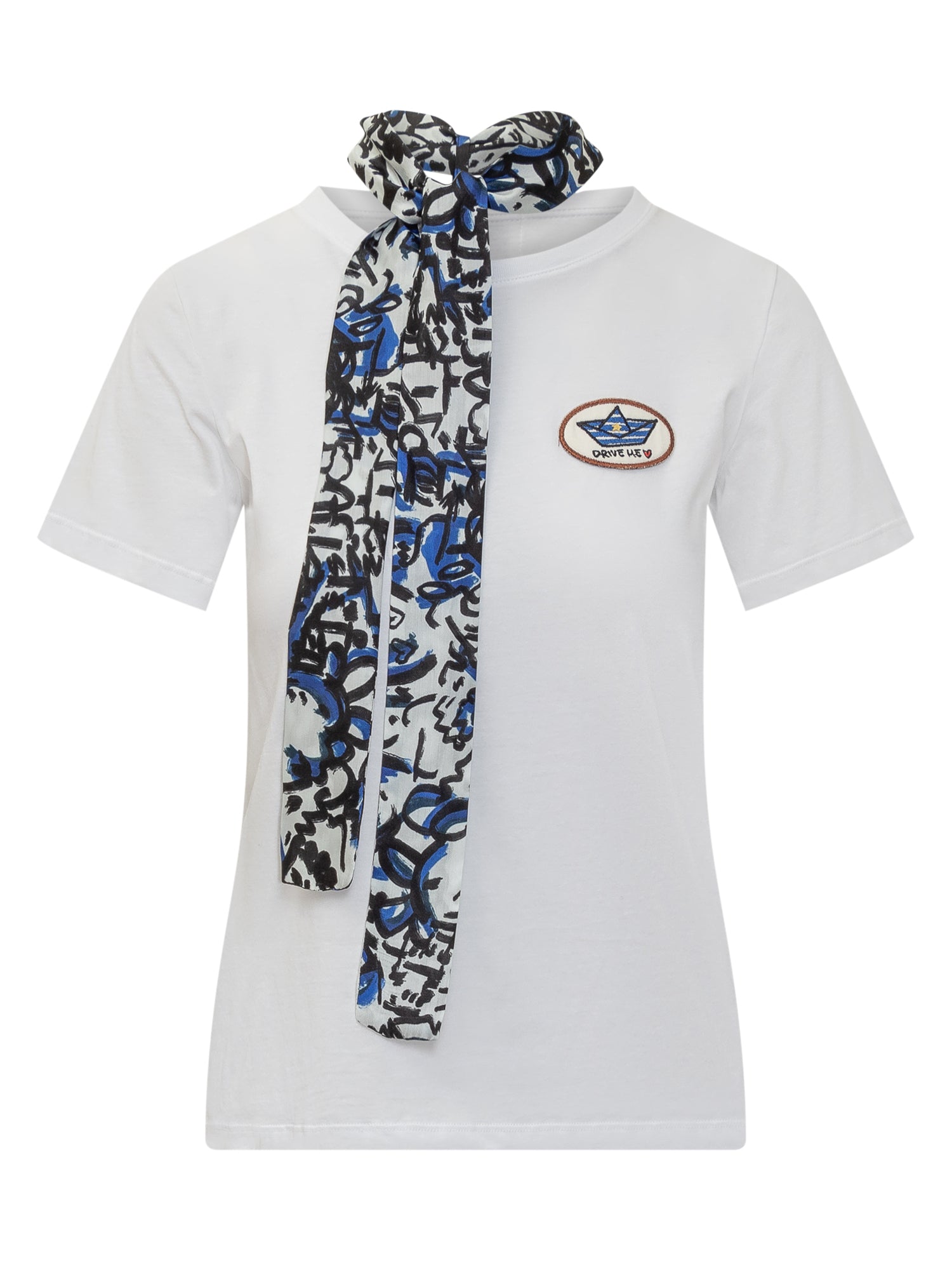 T-shirt a maniche corte in cotone. Girocollo con foulard. Orli a costine. Logo sul davanti.