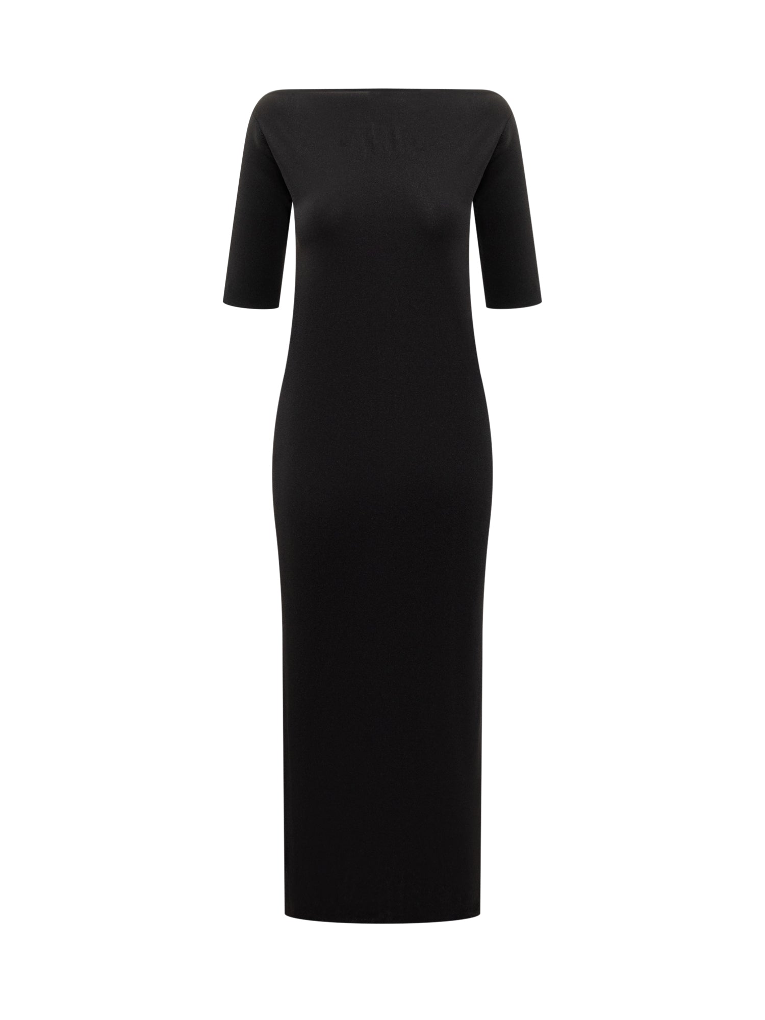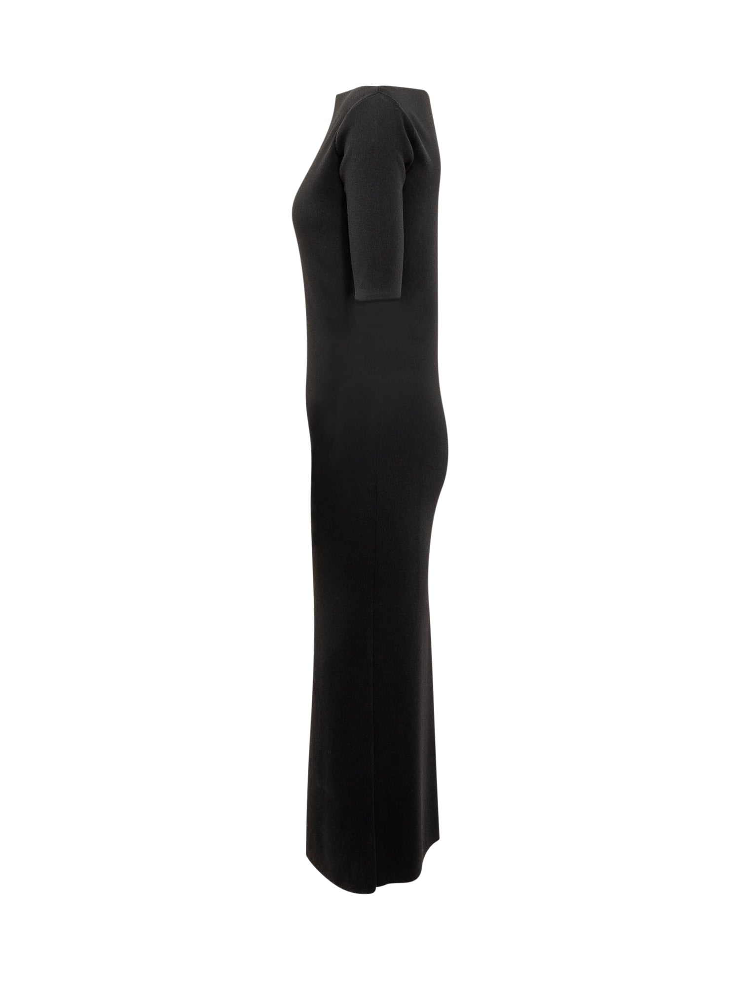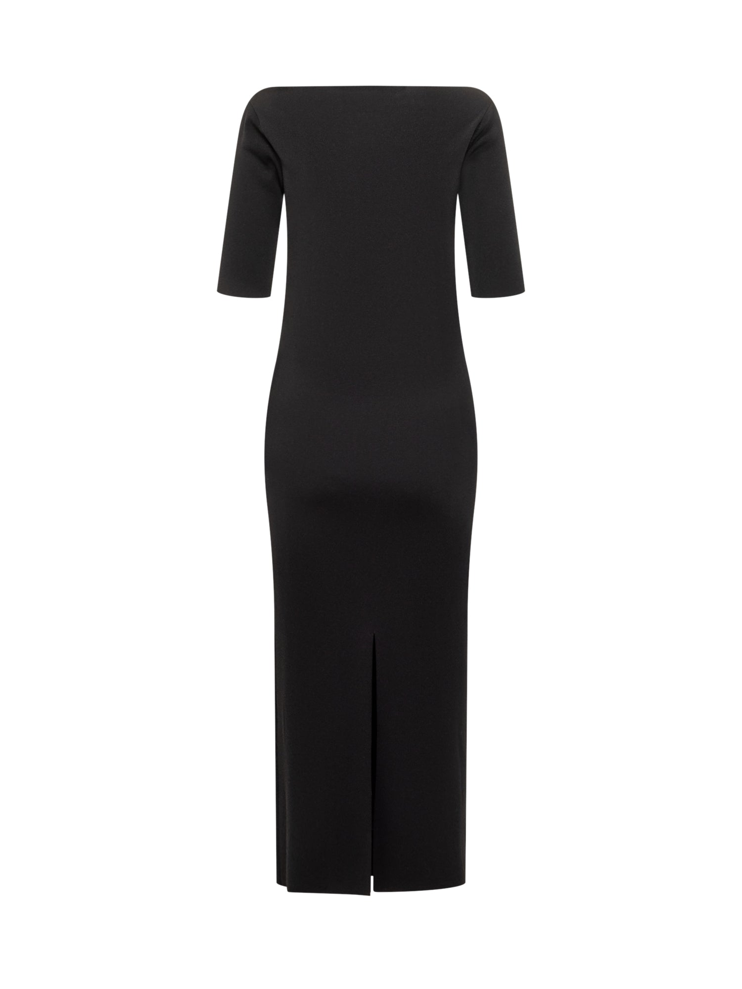 Abito Alpha Studio nero in maglia leggera con scollo a barca e maniche al gomito. Silhouette aderente e lunga per un eleganza minimale e raffinata.