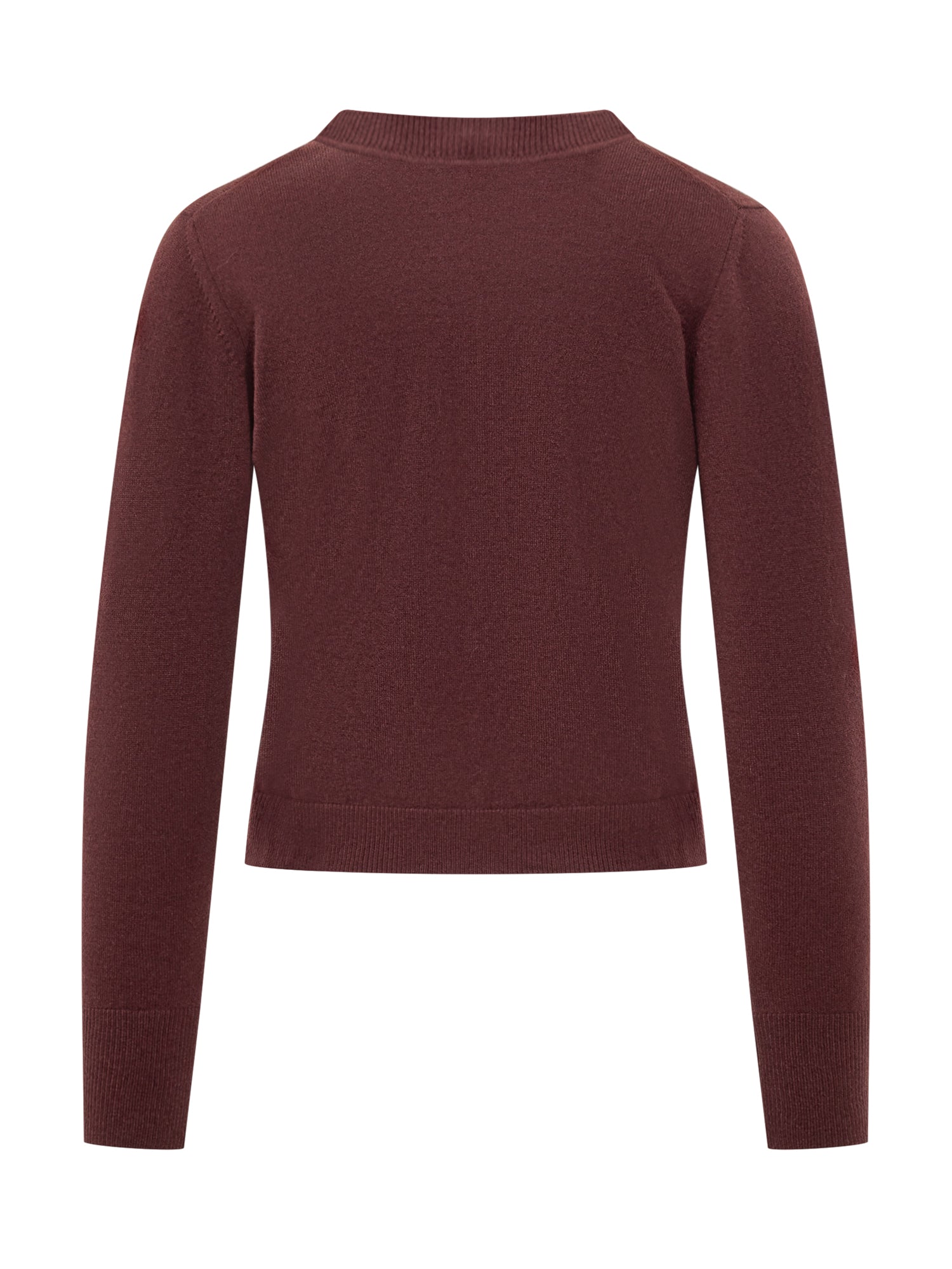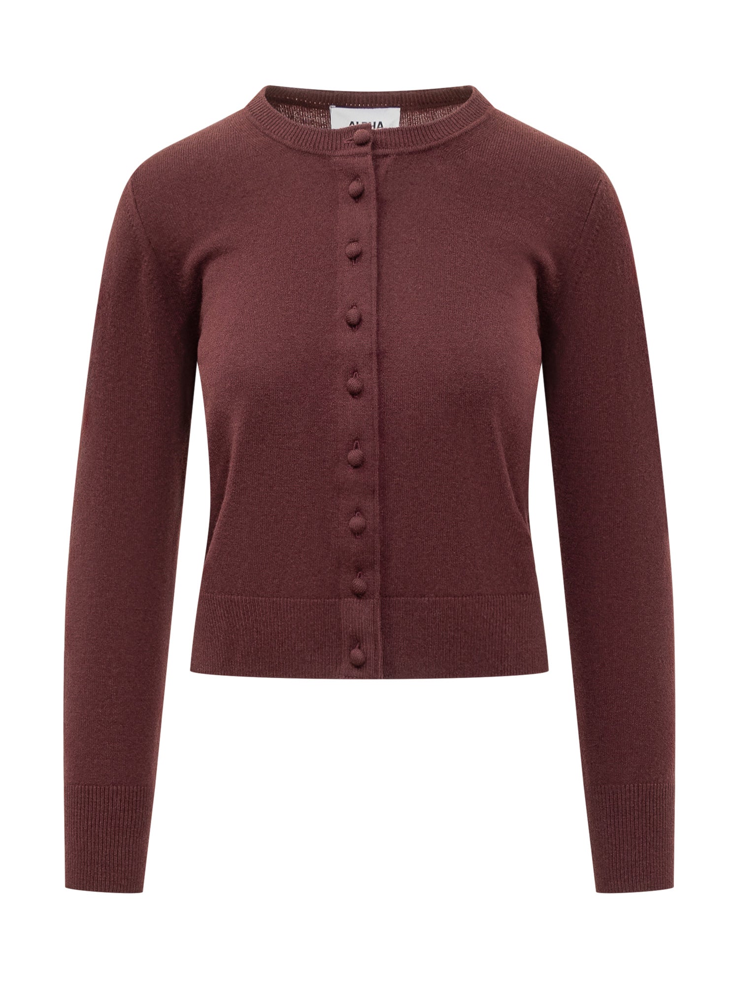Cardigan Alpha Studio in lana fine bordeaux, con linea corta e bottoni rivestiti tono su tono.