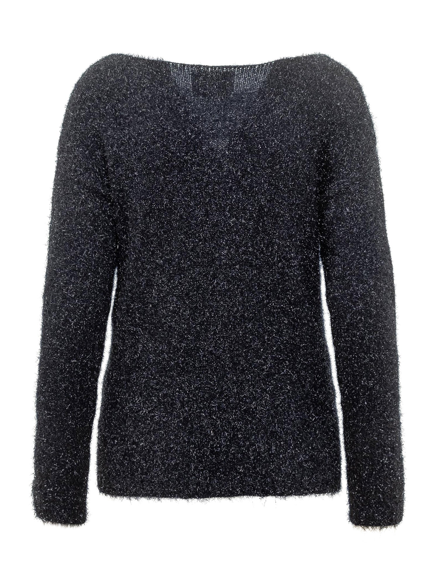 Maglia Alpha Studio nera a maniche lunghe con filato lurex effetto brillante e scollo a barca. Un capo elegante e luminoso, perfetto per look da sera sofisticati.