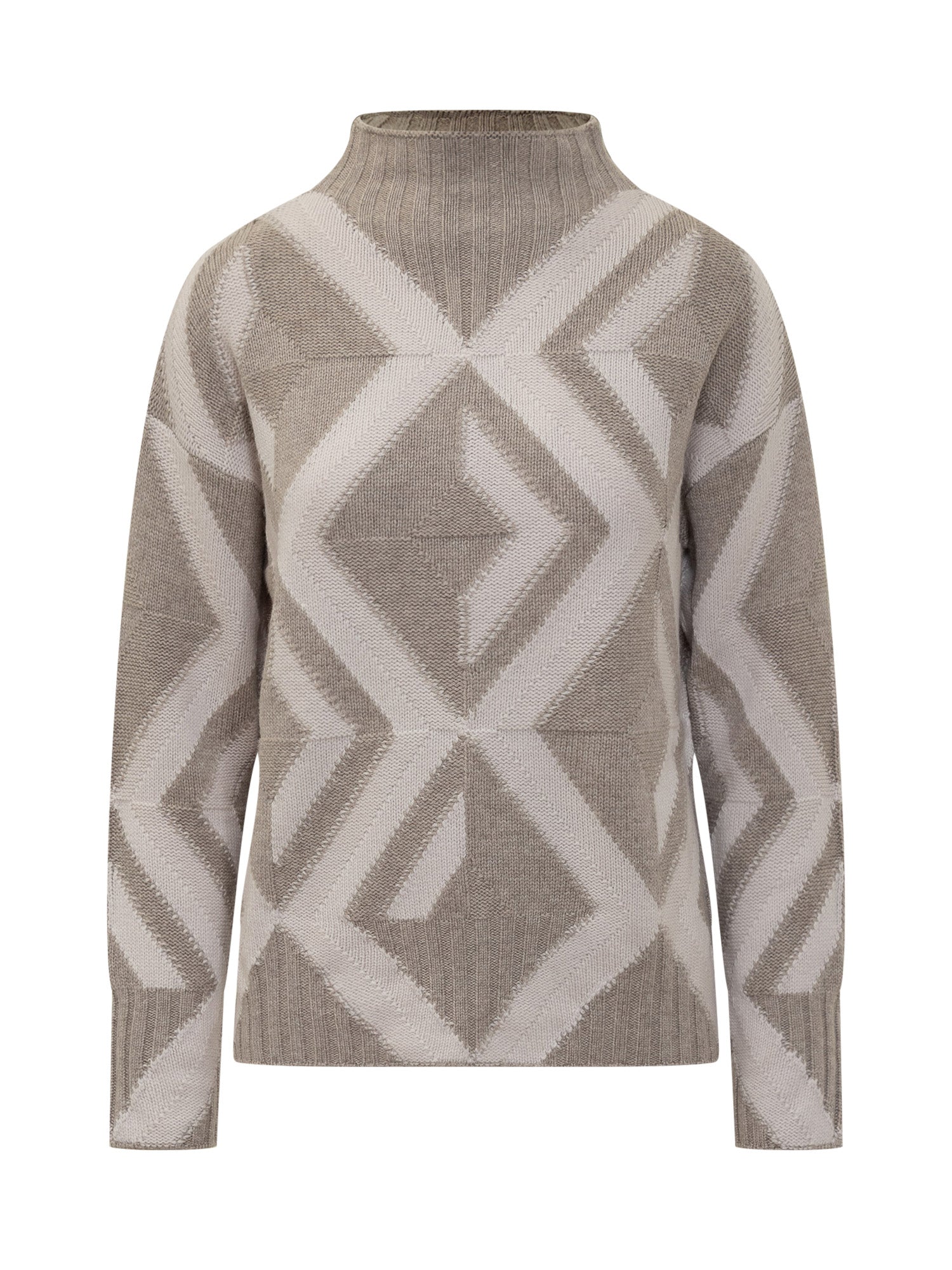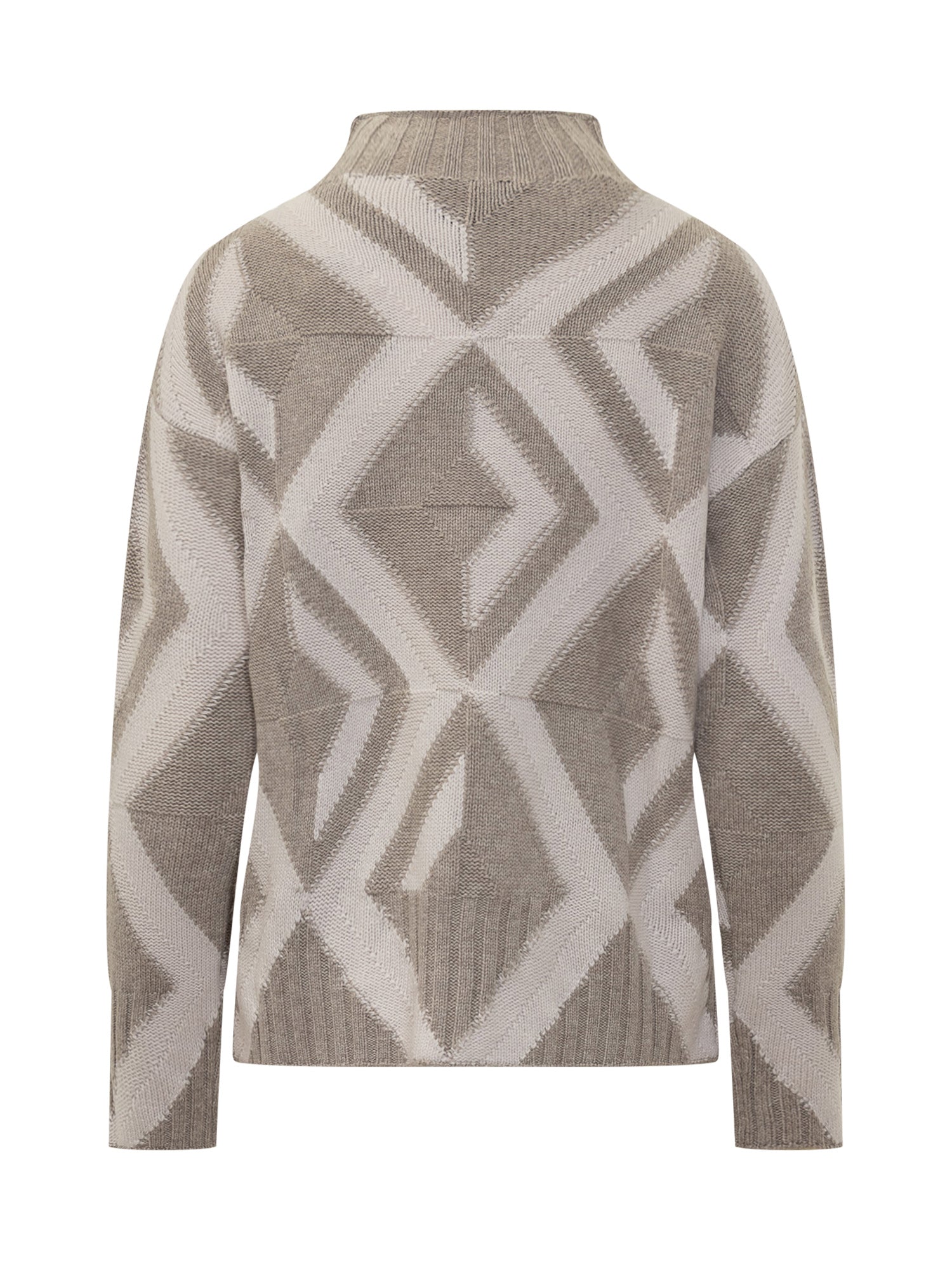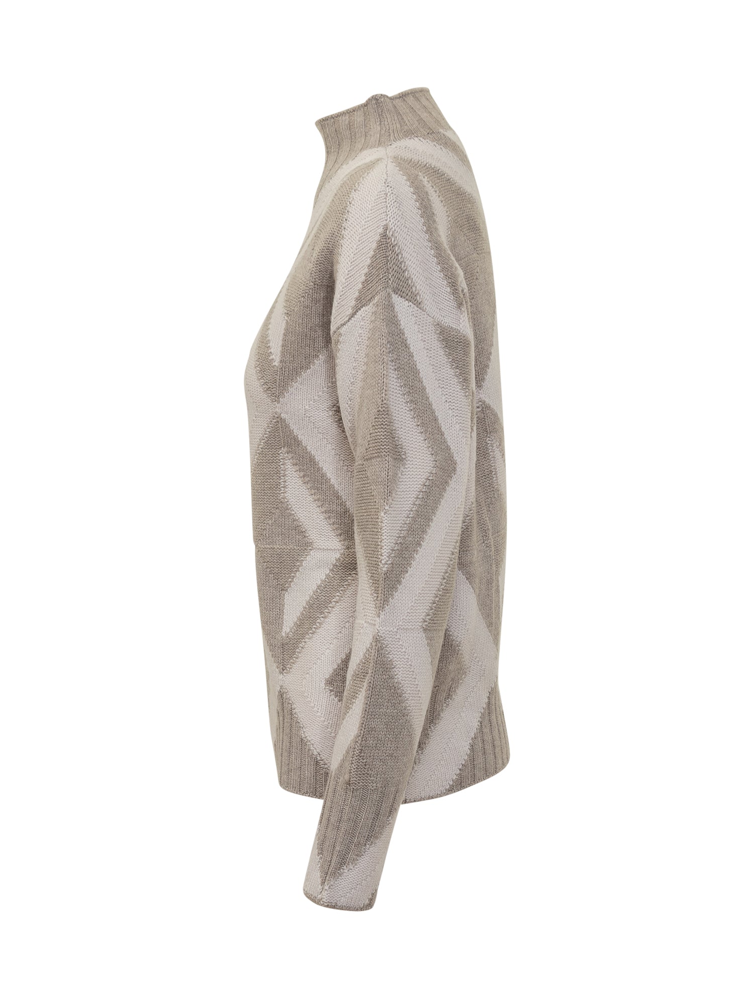 Maglione Alpha Studio beige e panna con motivo geometrico jacquard e collo alto. Realizzato in filato morbido per un comfort elegante.