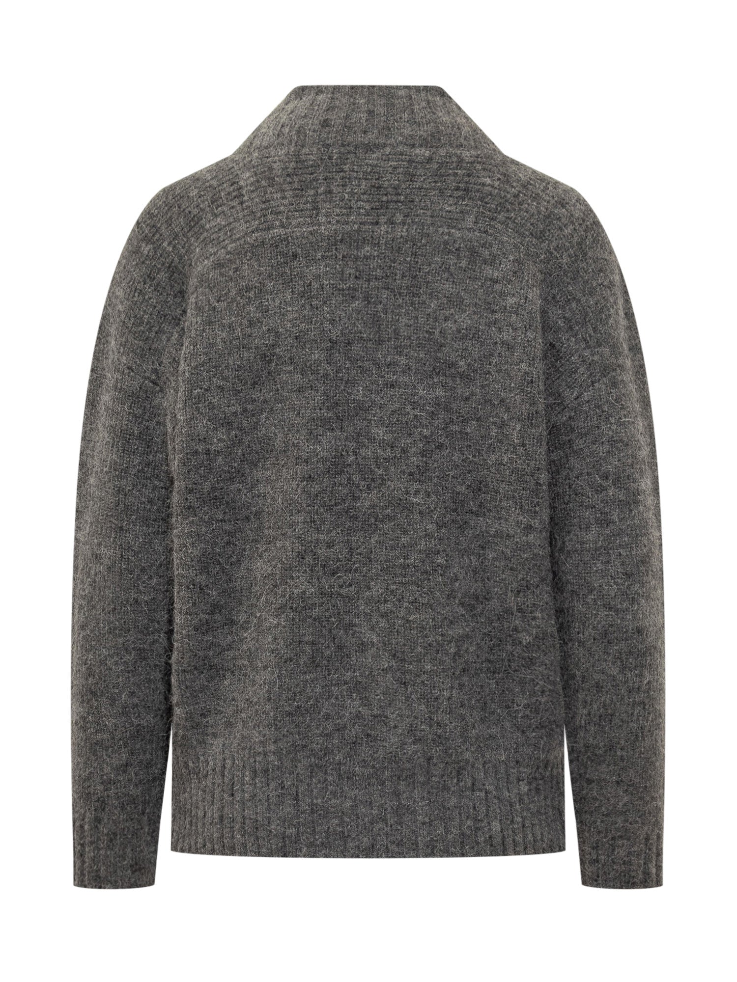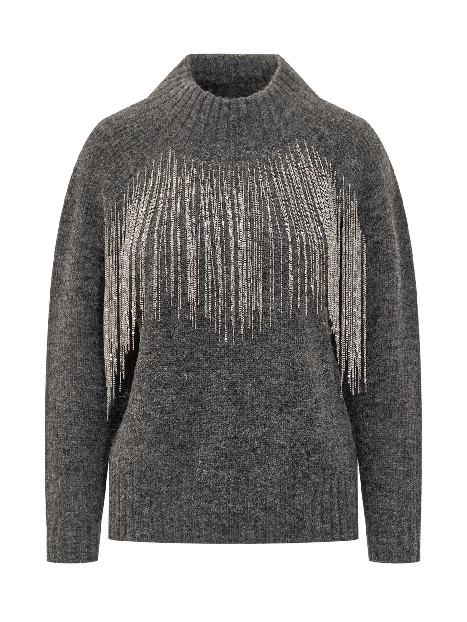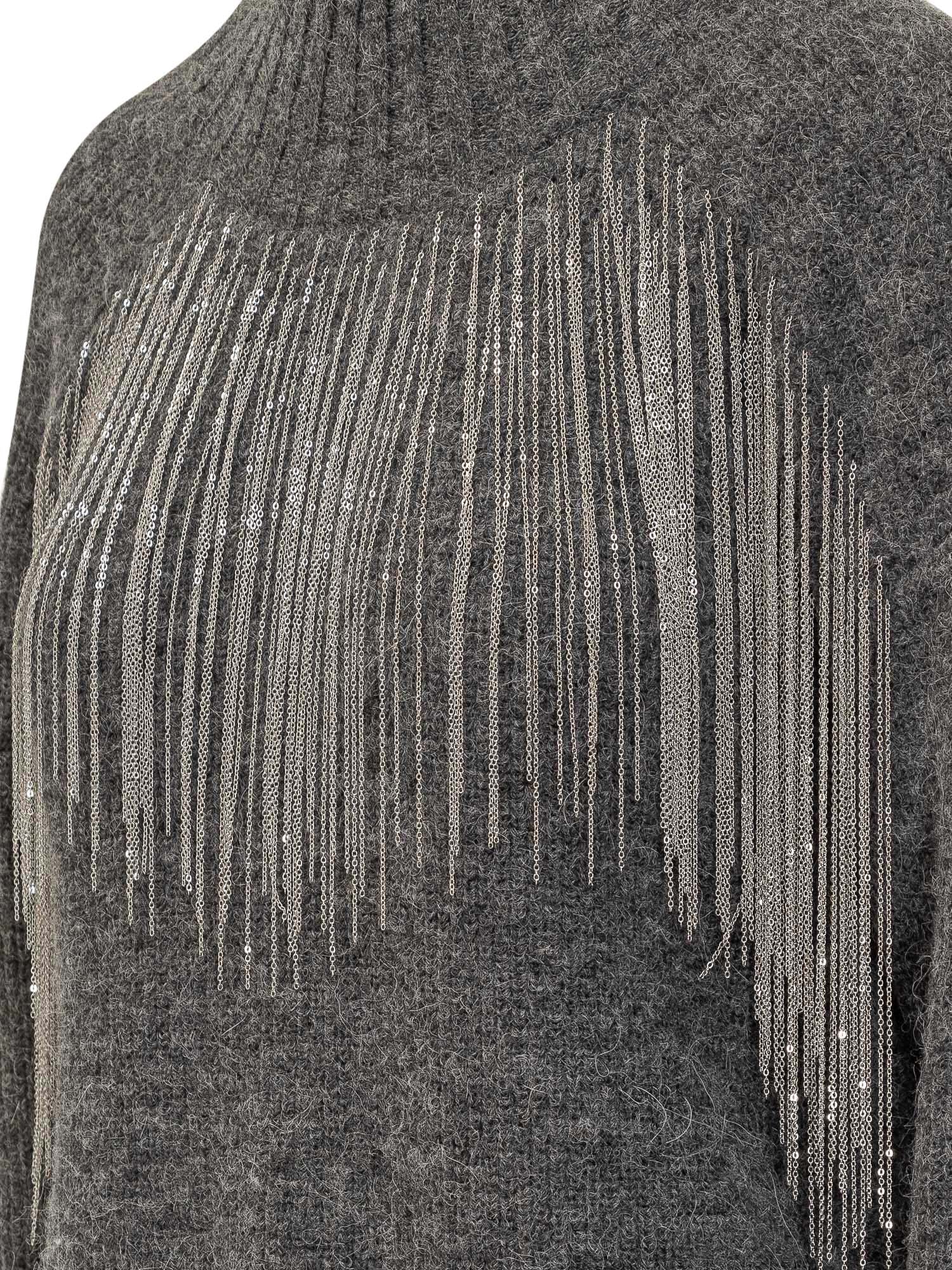 Maglione Alpha Studio in morbida lana grigia con frange gioiello sul davanti. Collo alto e linea rilassata per un look elegante.