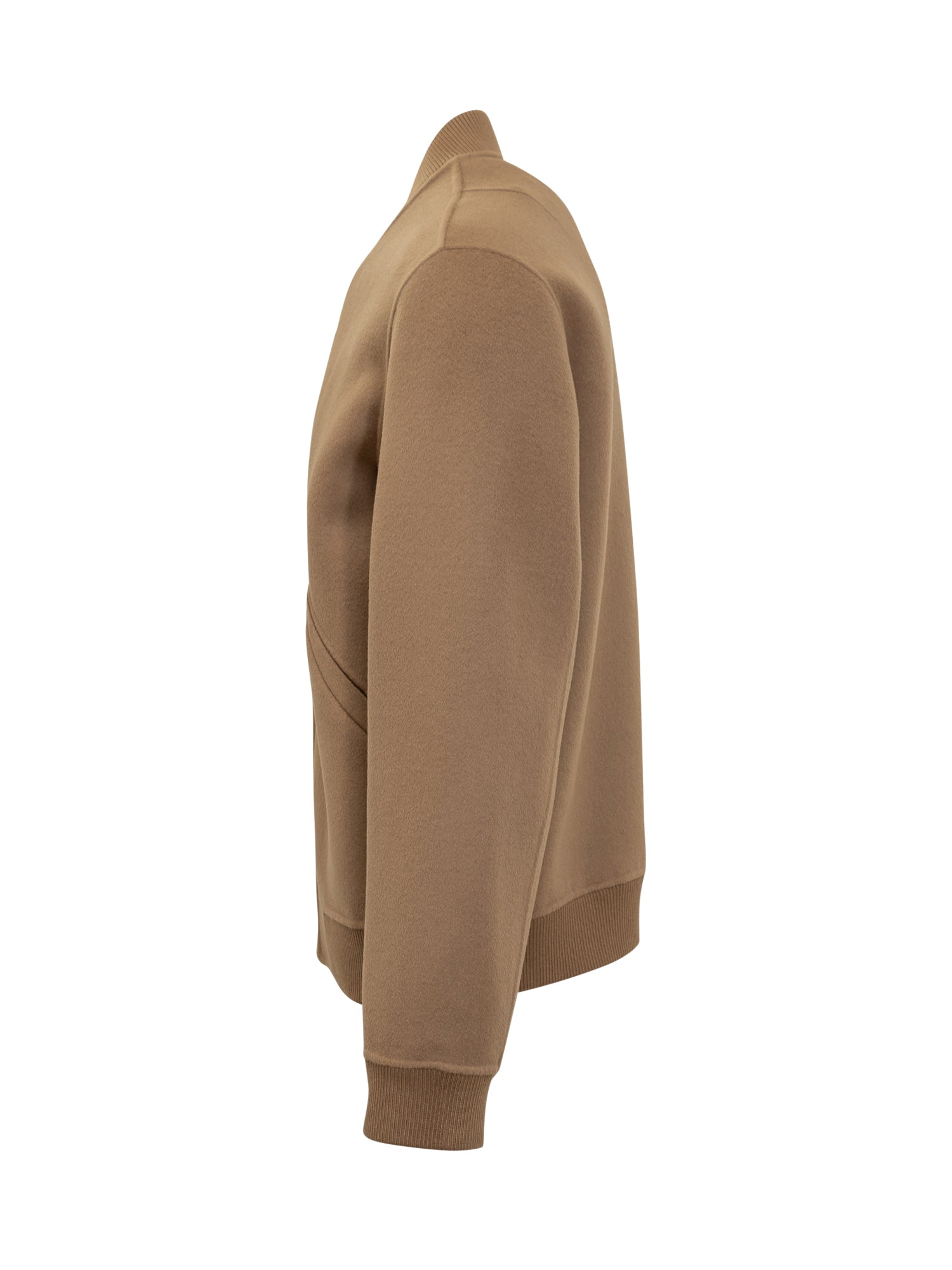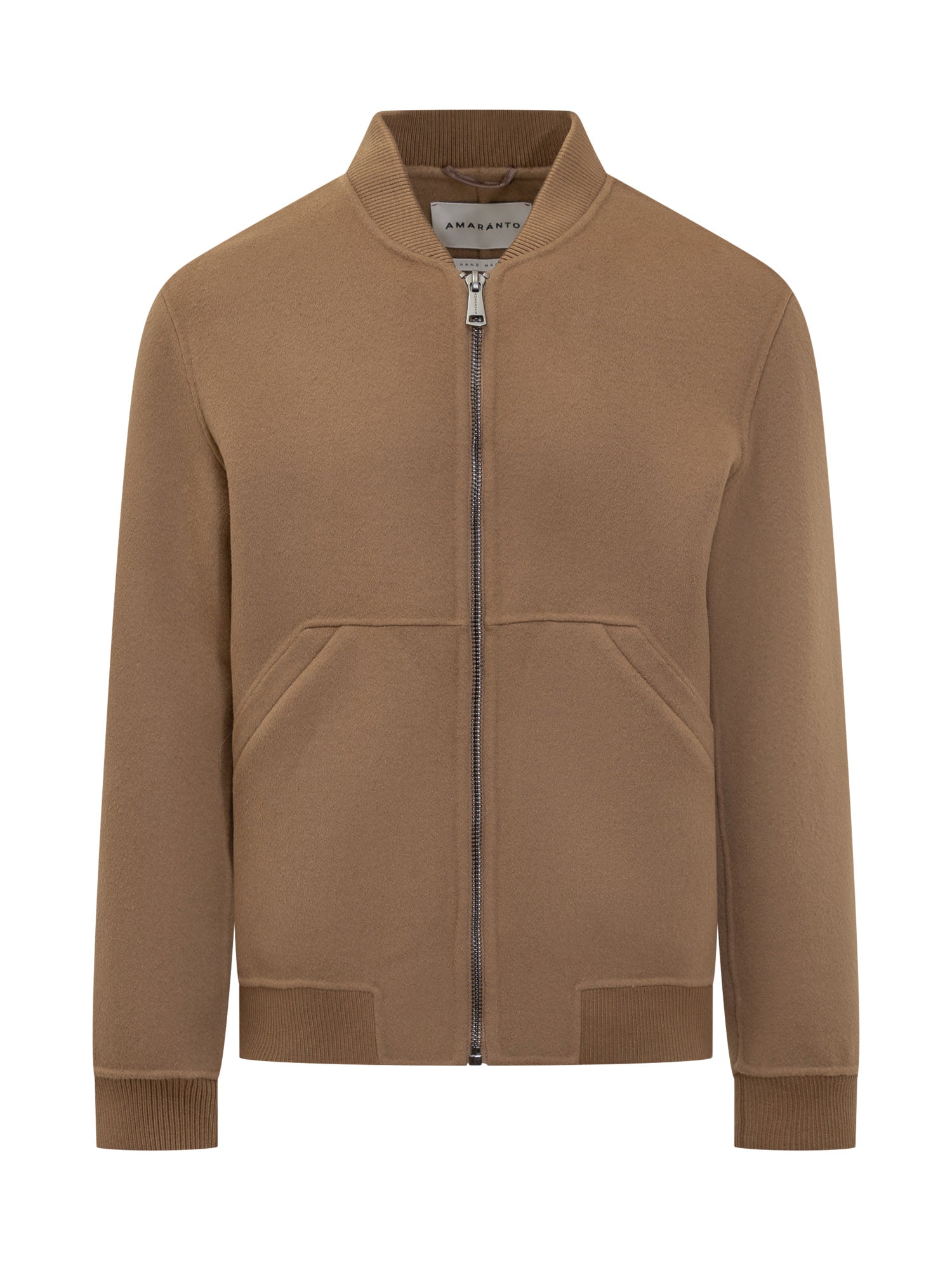 Bomber Amaranto in lana color cammello con chiusura a zip e tasche frontali.