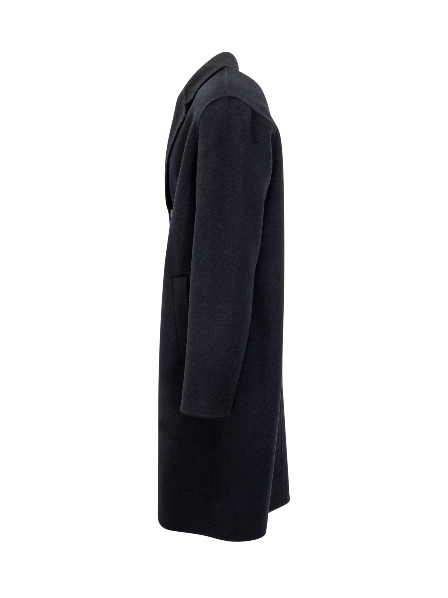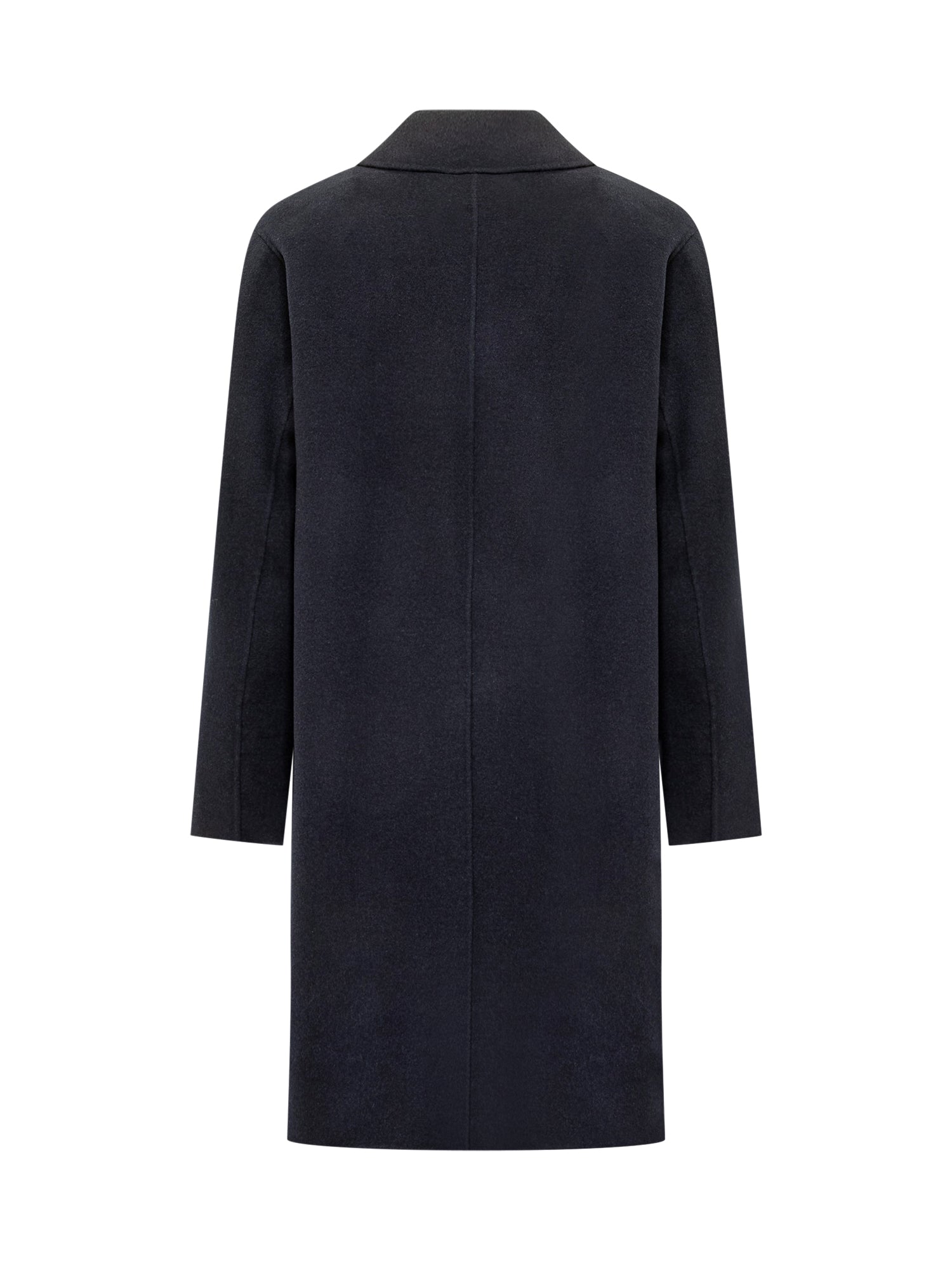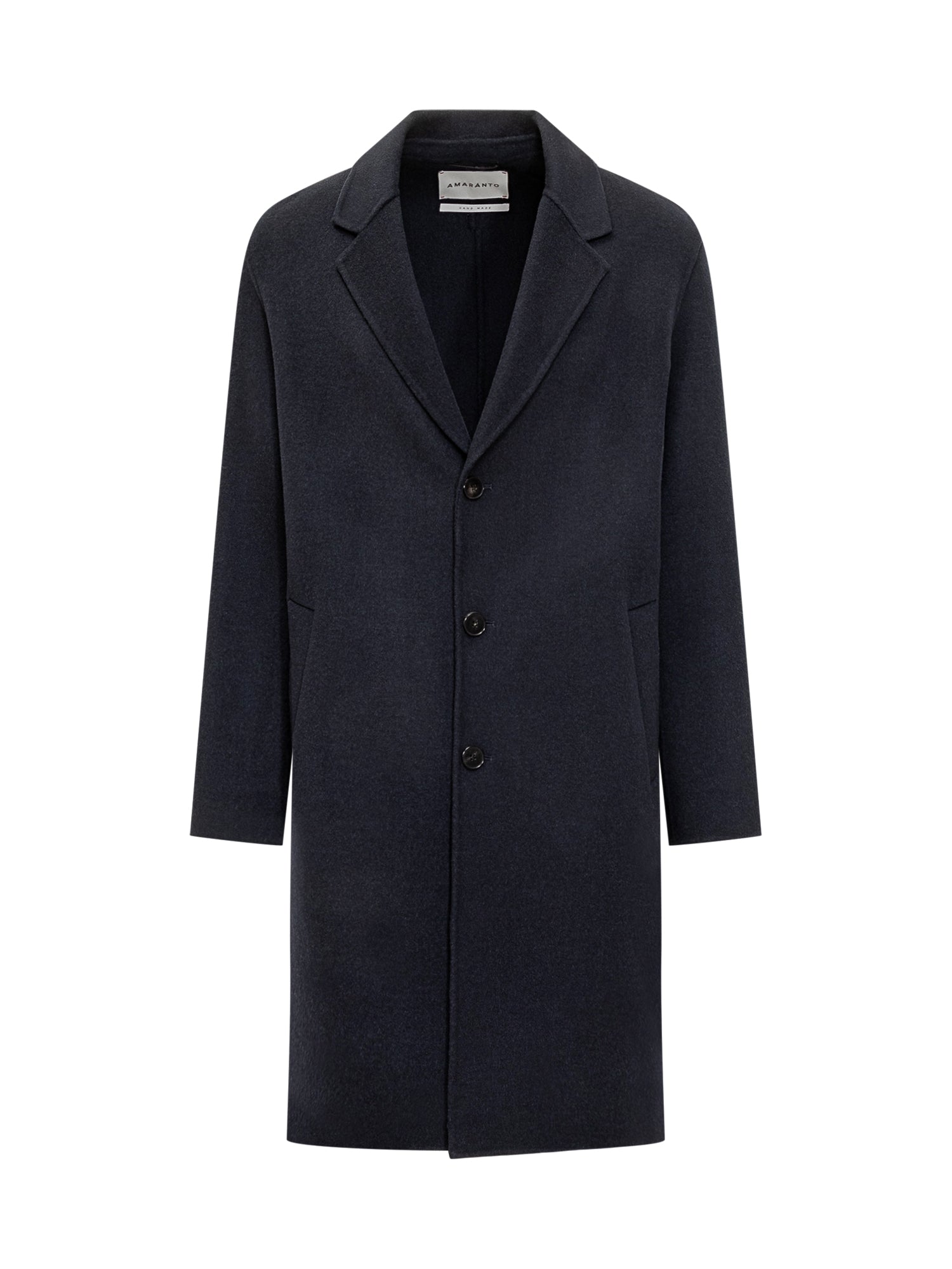 Cappotto Amaranto in lana blu con linea dritta e chiusura a tre bottoni.