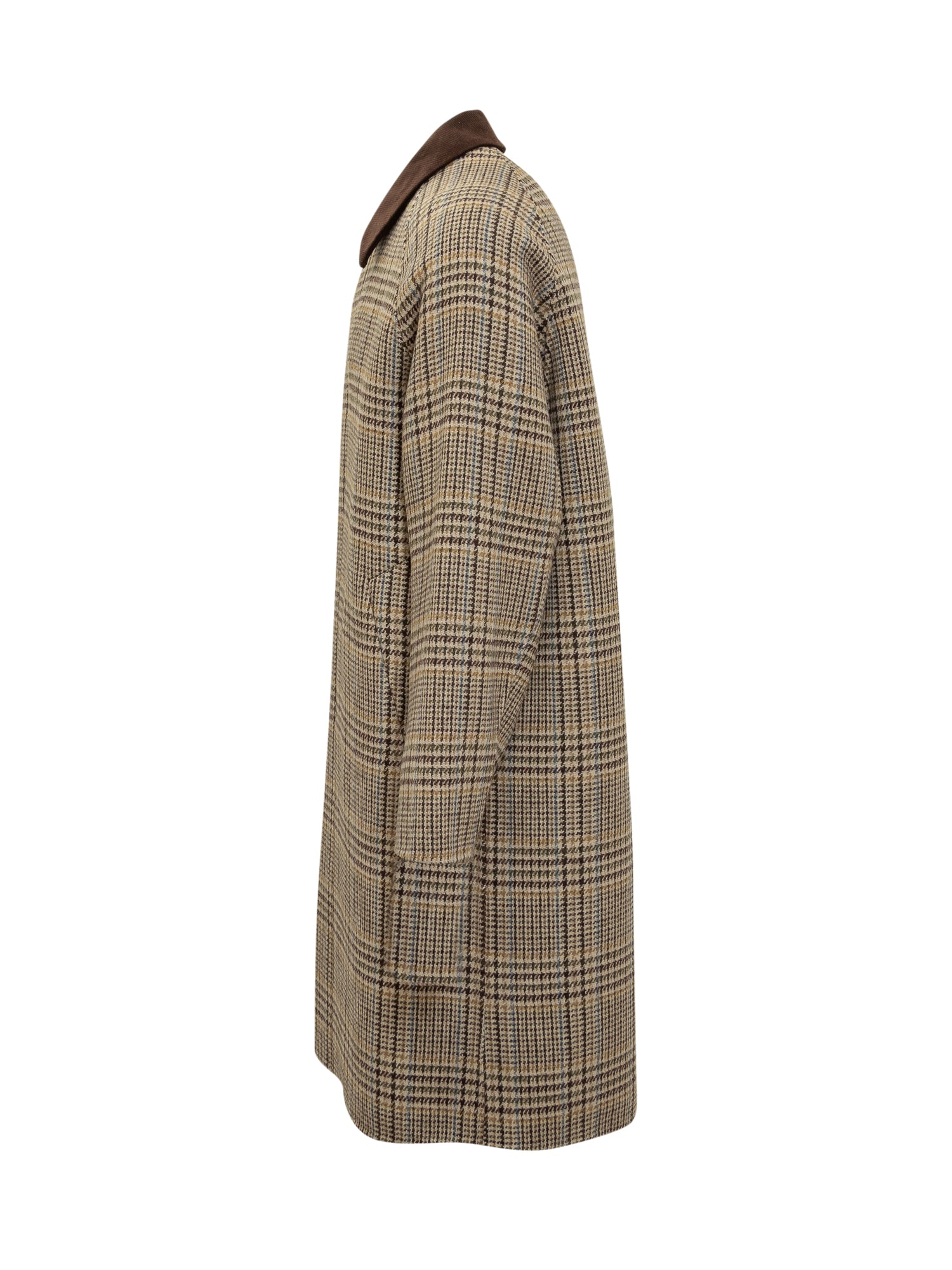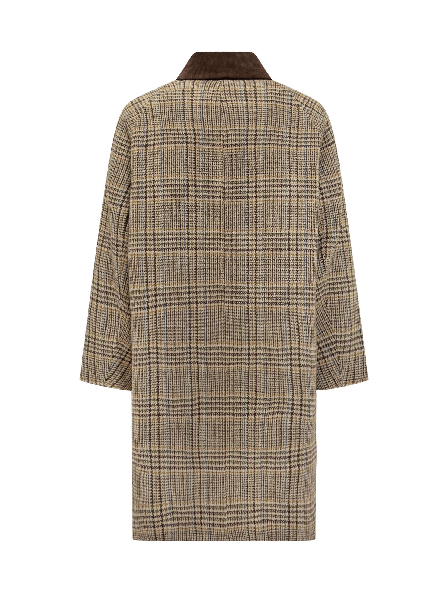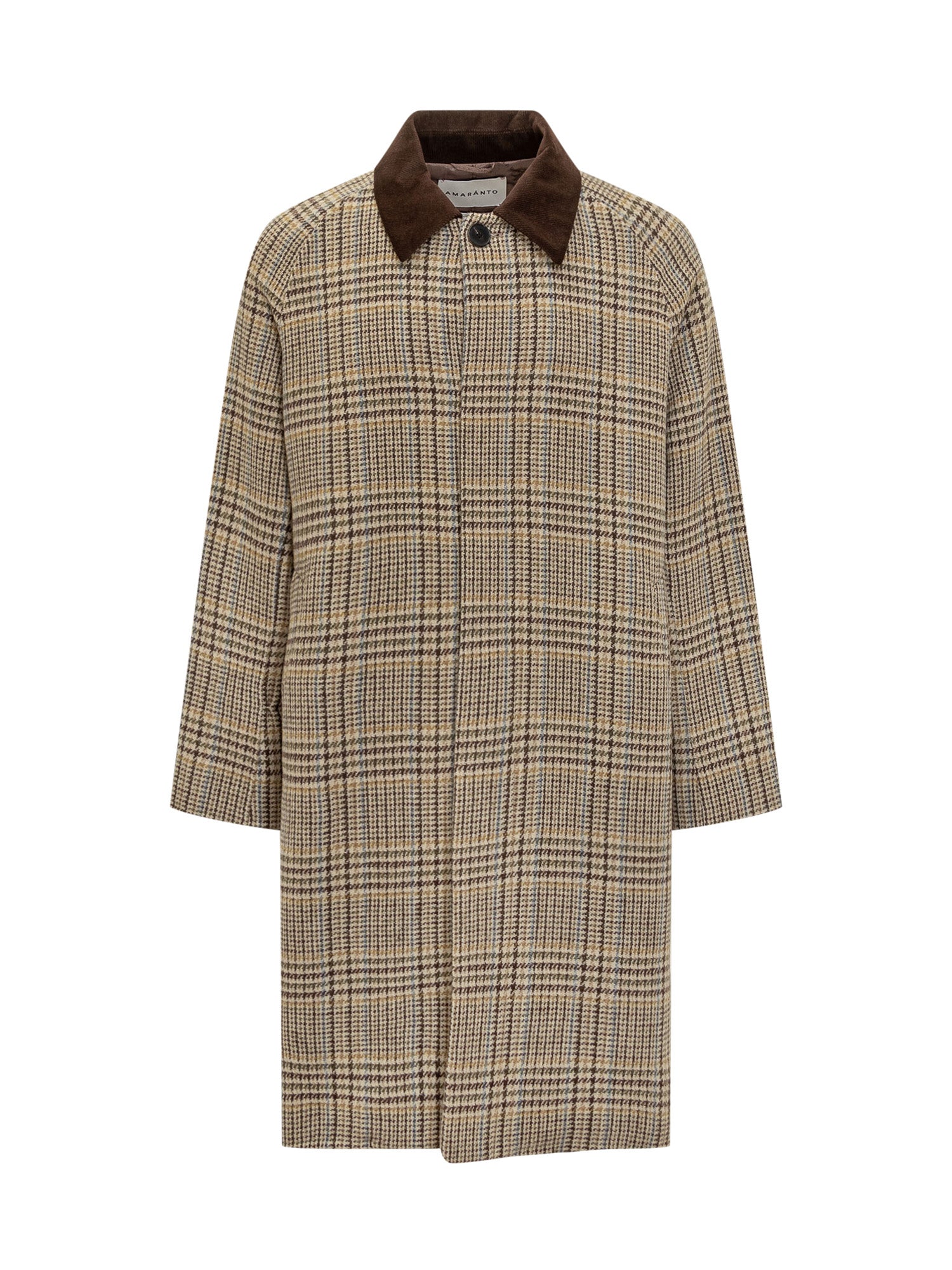 Cappotto Amaranto a quadri con colletto in velluto marrone e chiusura con bottoni nascosti.