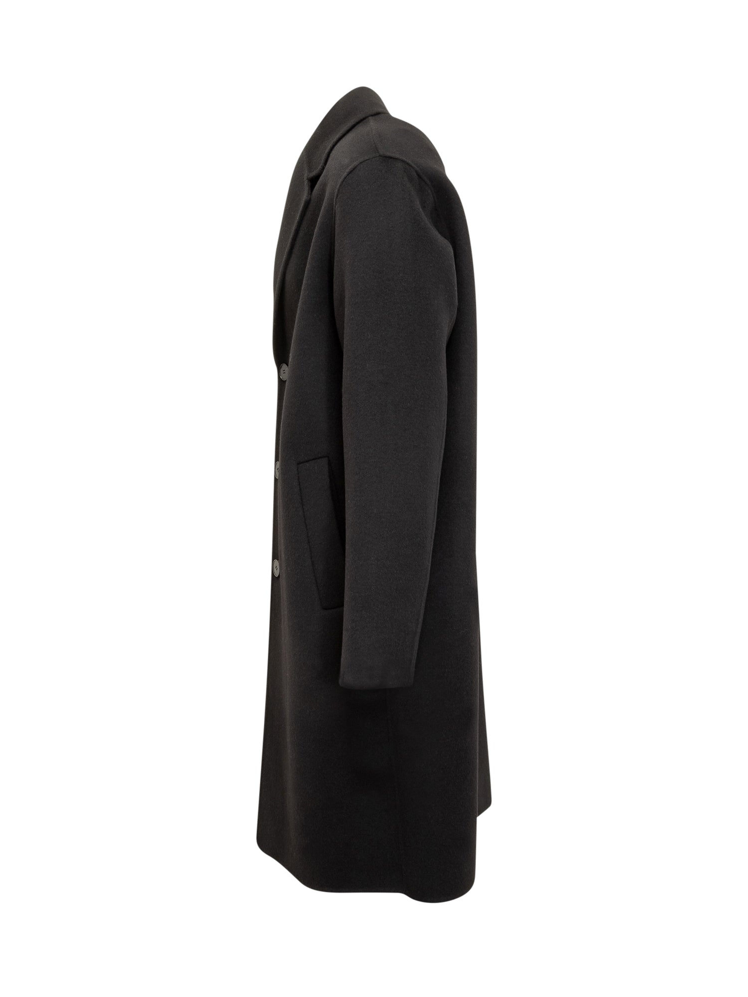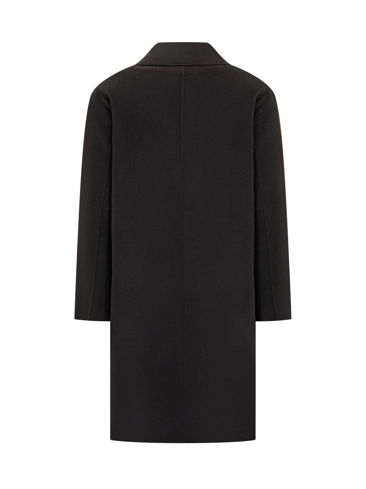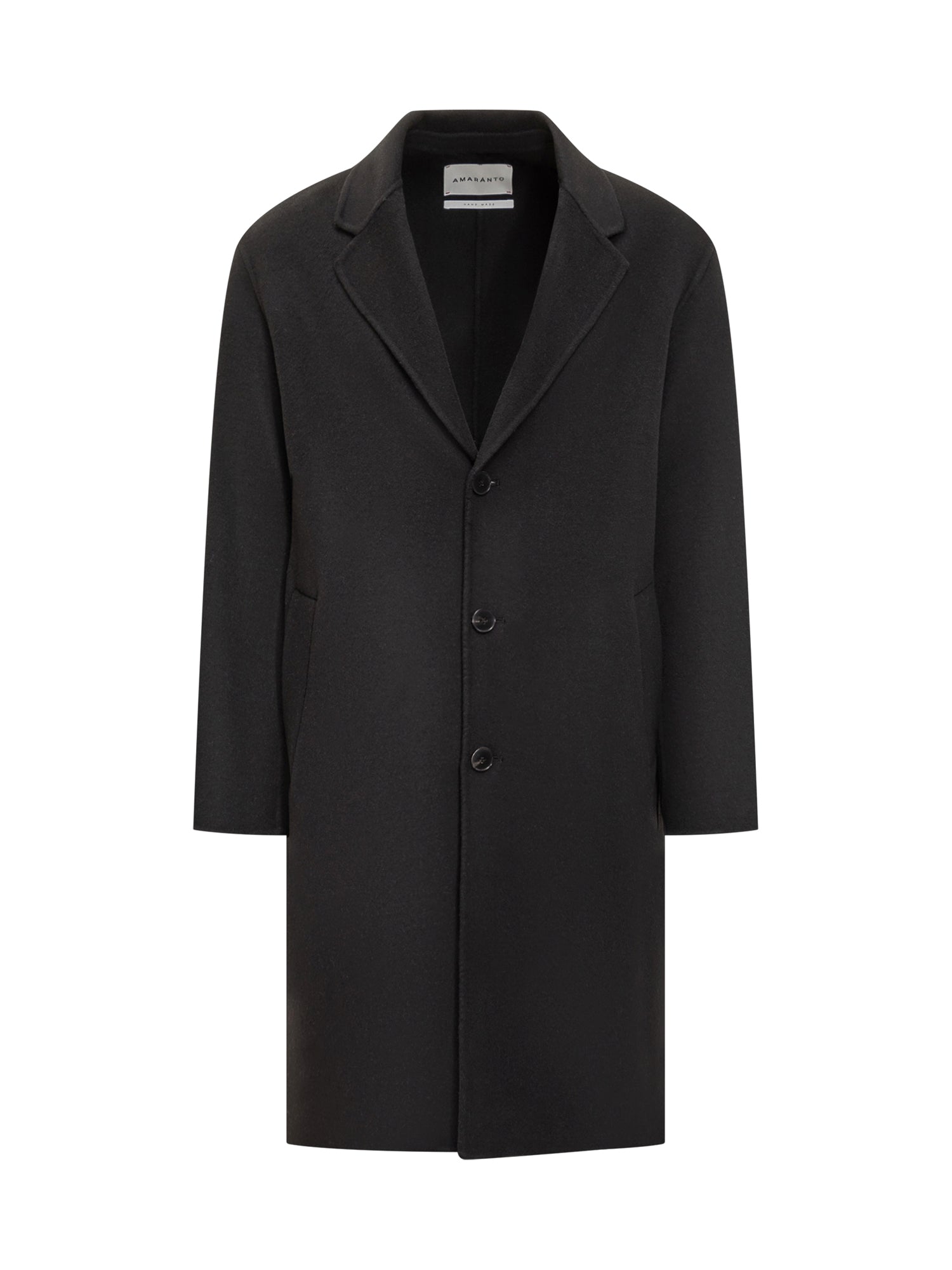 Cappotto Amaranto in lana nera con revers classici e chiusura a tre bottoni.