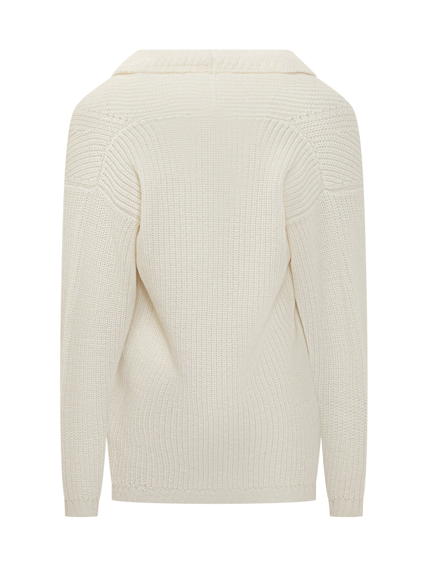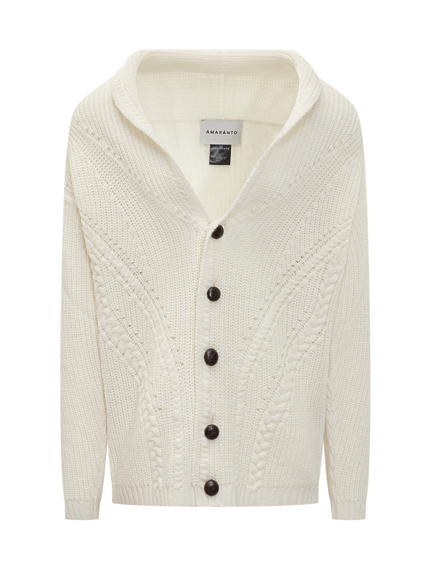 Cardigan Amaranto in lana bianca con motivo intrecciato e bottoni scuri.