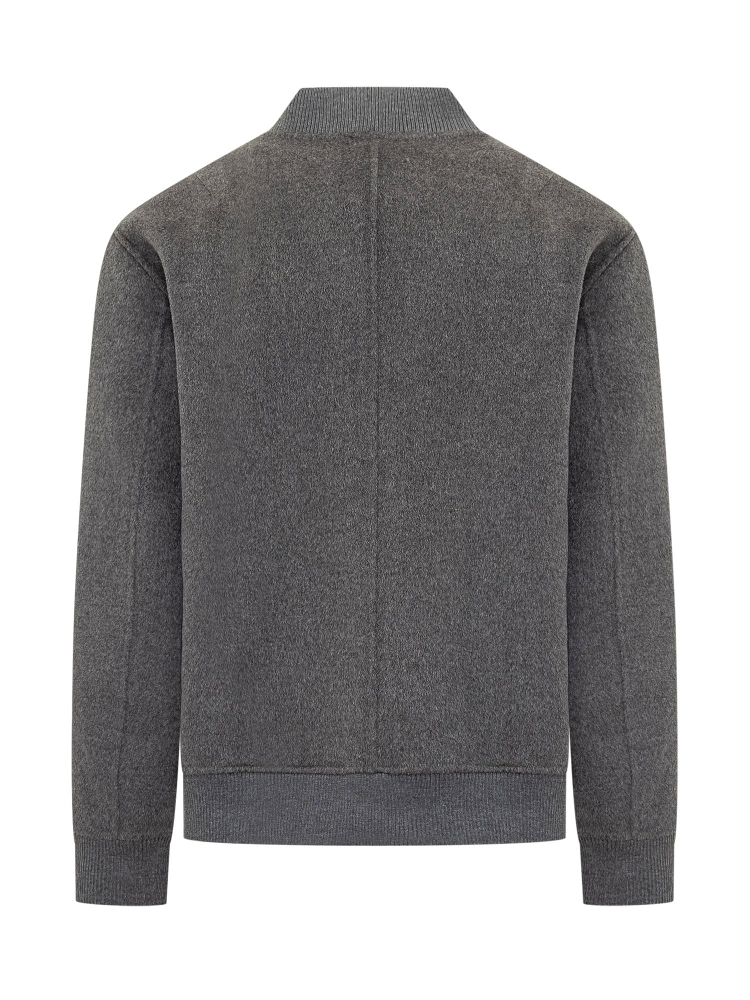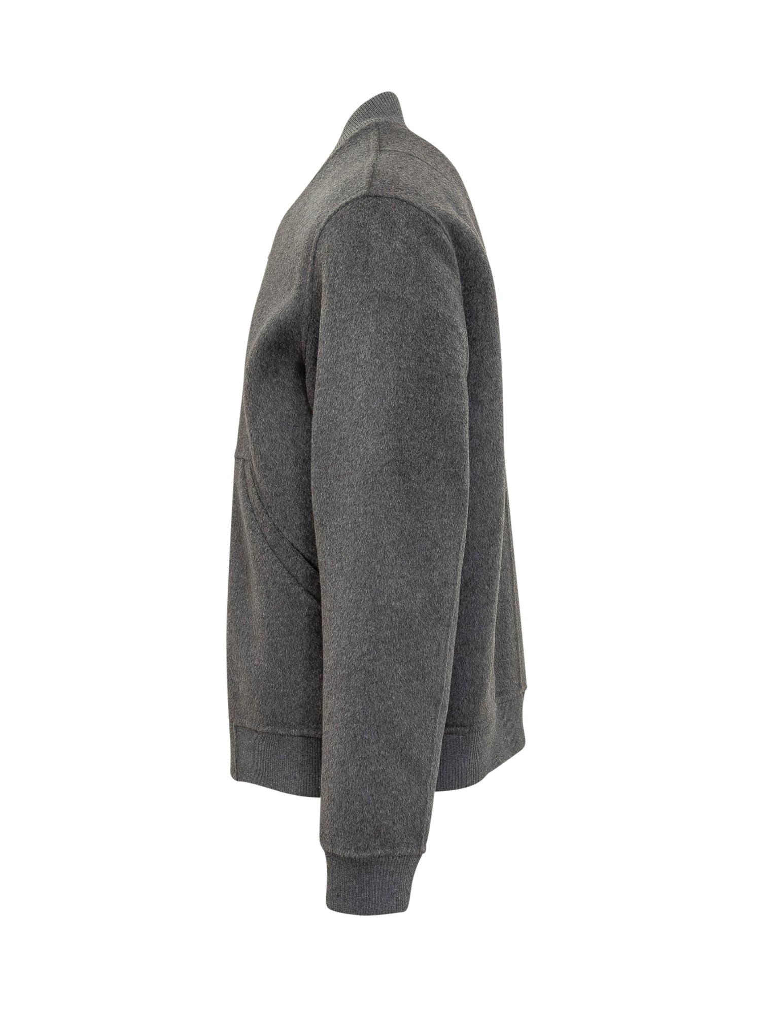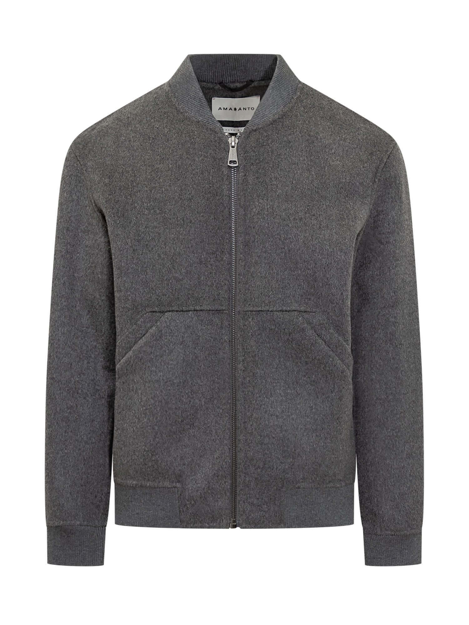 Giacca Amaranto in lana grigia con chiusura a zip, colletto bomber e tasche laterali.