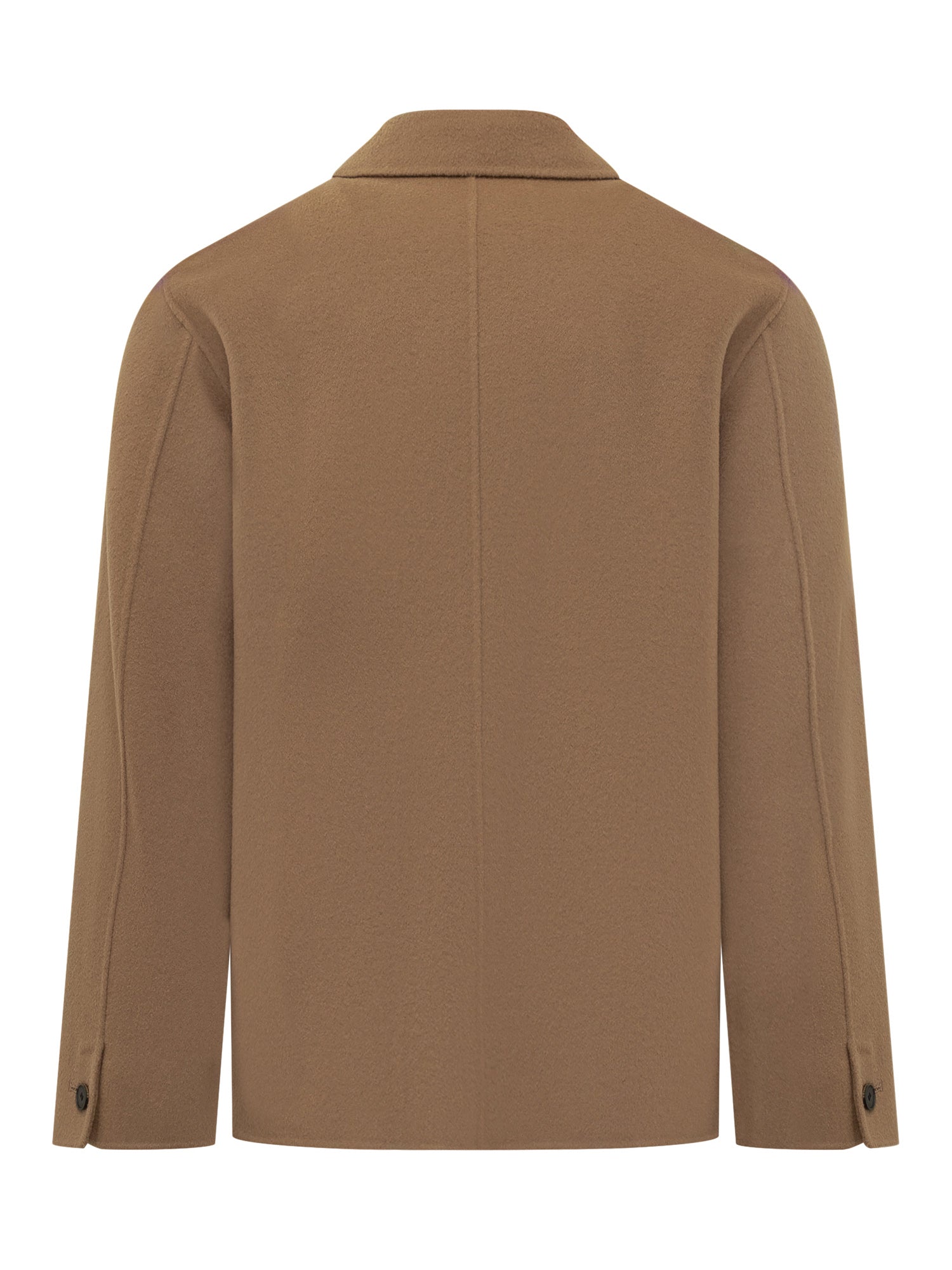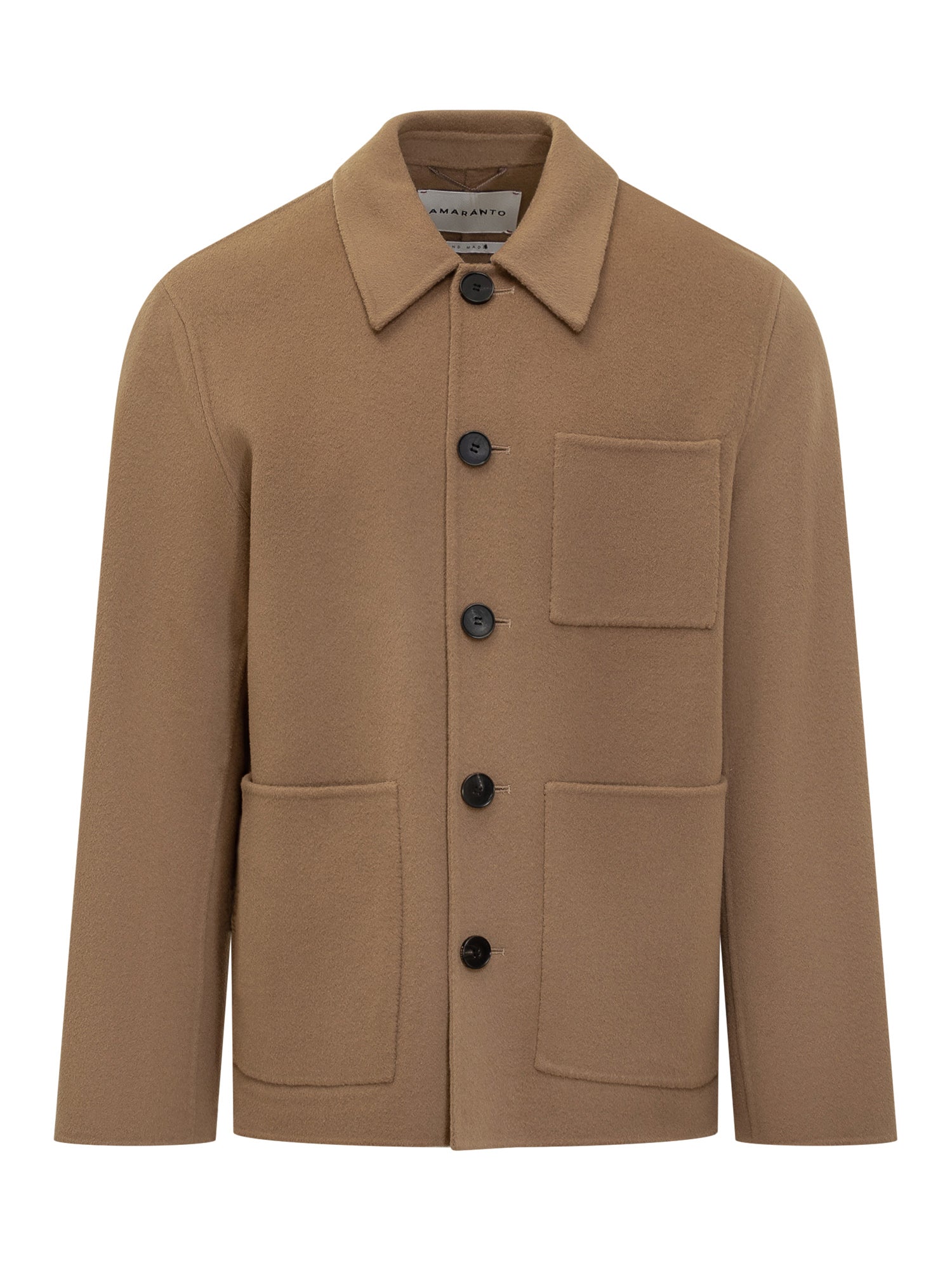 Giacca Amaranto in lana cammello con bottoni frontali, colletto classico e tasche applicate.