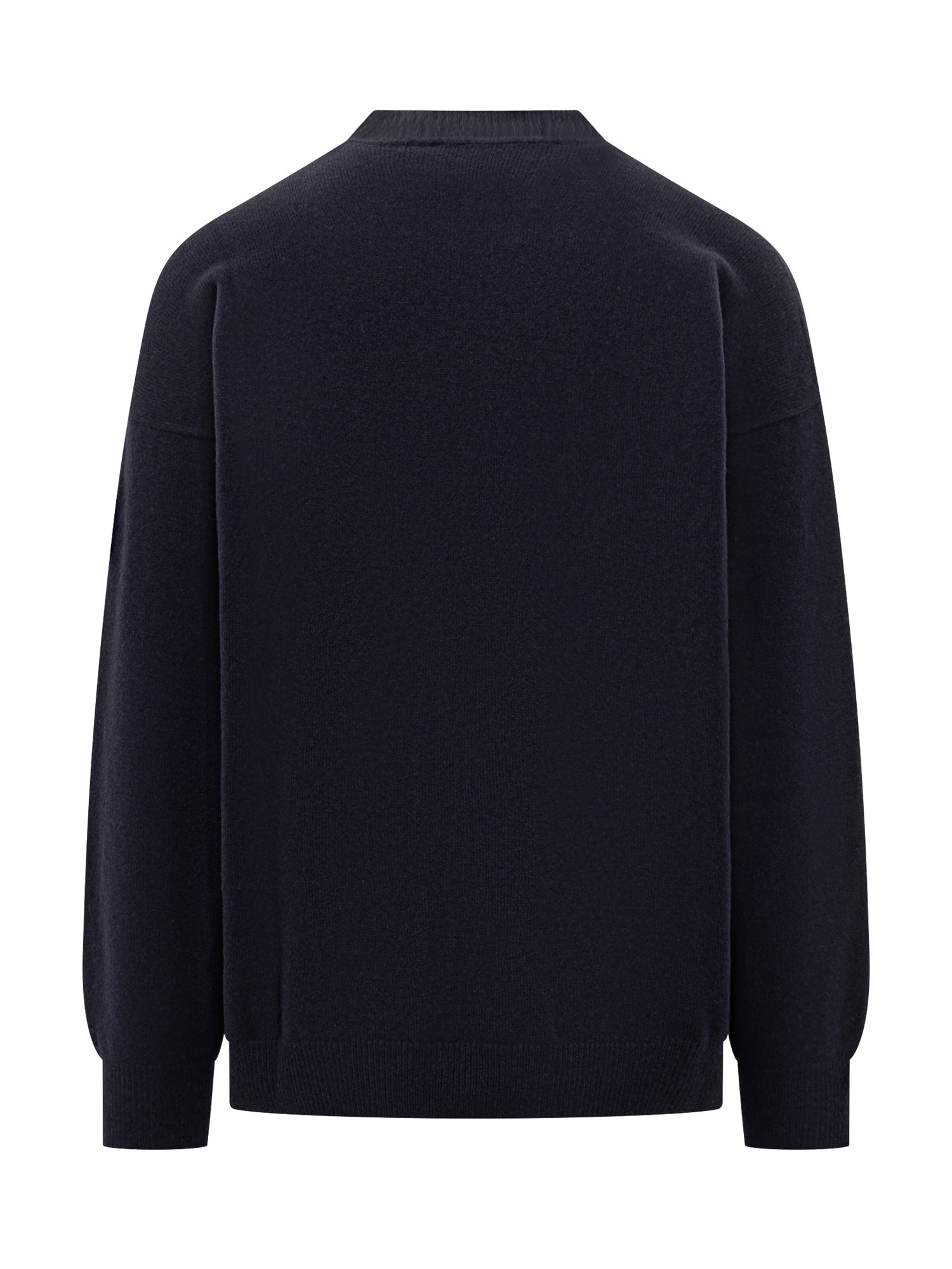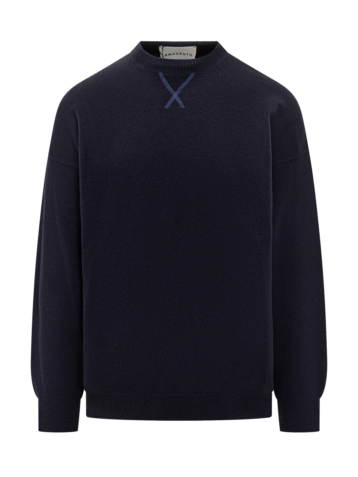 Maglione Amaranto in lana blu con collo girocollo e cucitura a X in contrasto sul davanti.