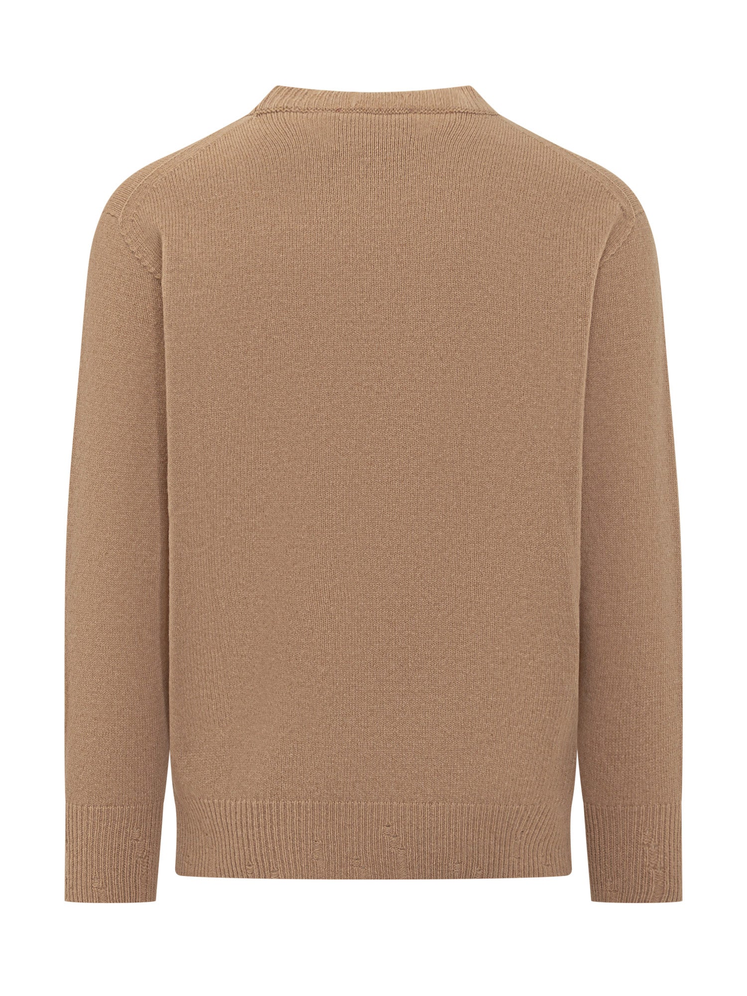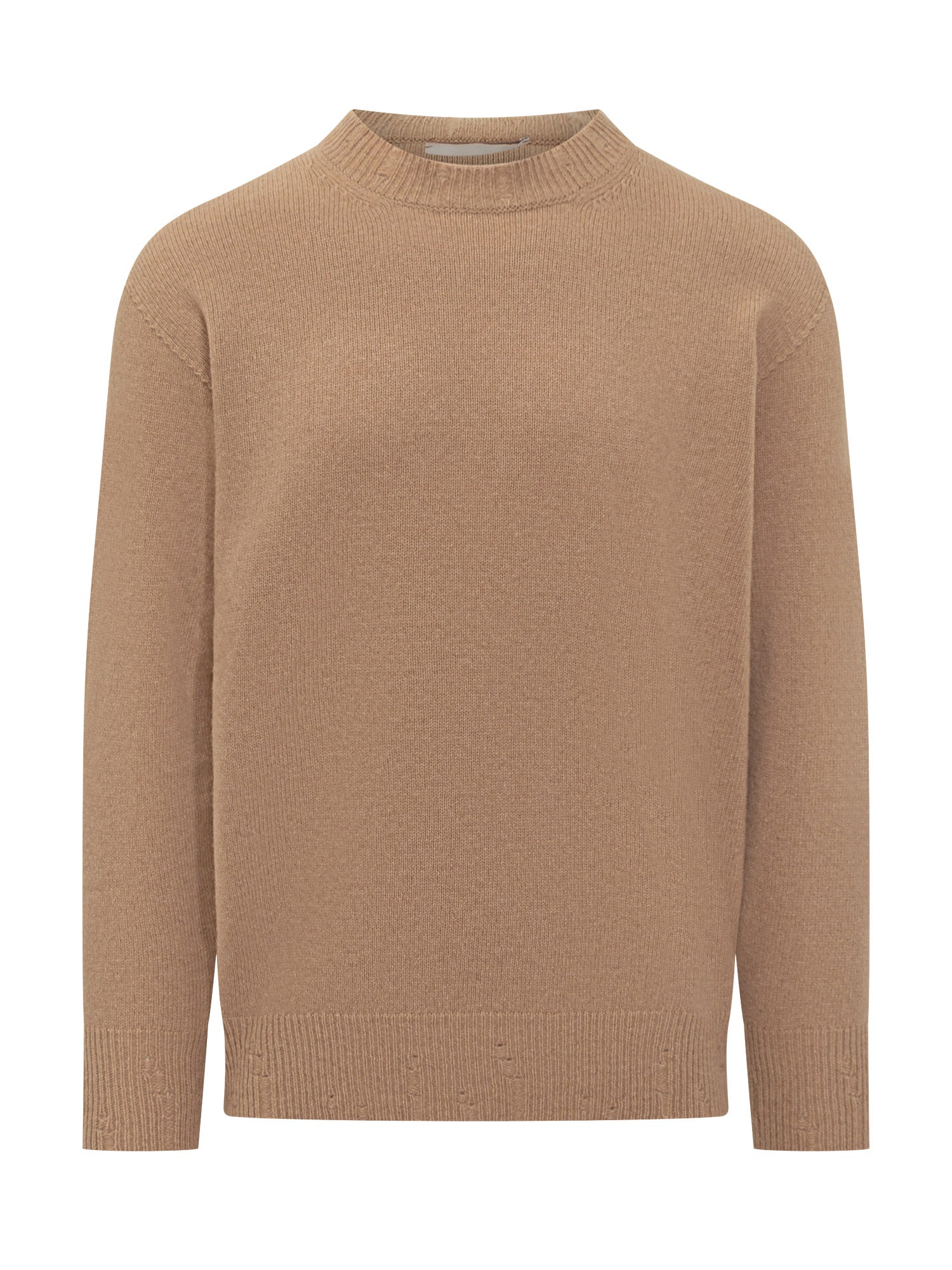 Maglione Amaranto in lana color cammello con collo girocollo e lavorazione liscia.