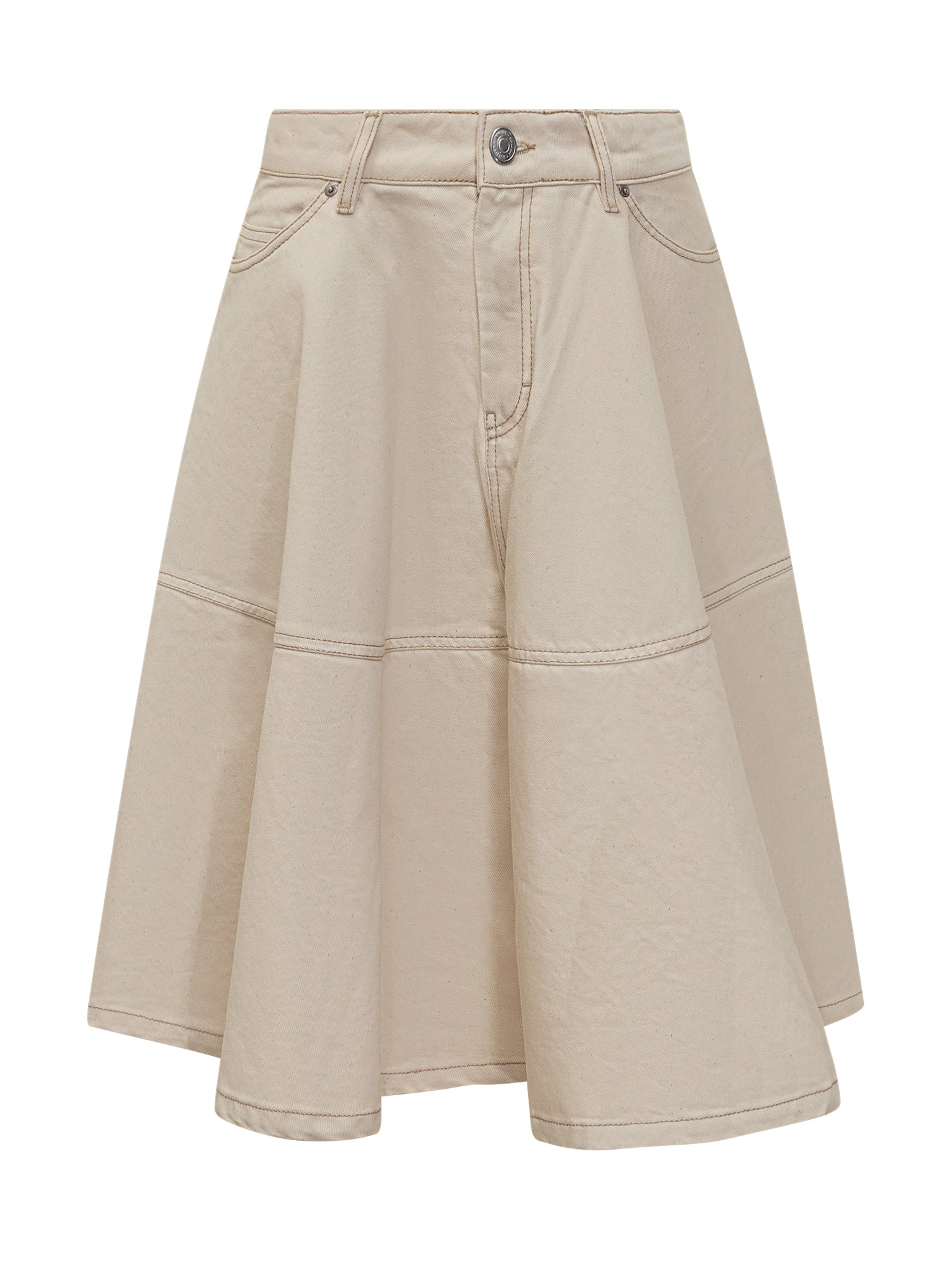 Gonna Ami Alexandre Mattiussi in denim beige con silhouette a ruota e vita media. Design con cuciture a vista e chiusura frontale con bottone e zip.