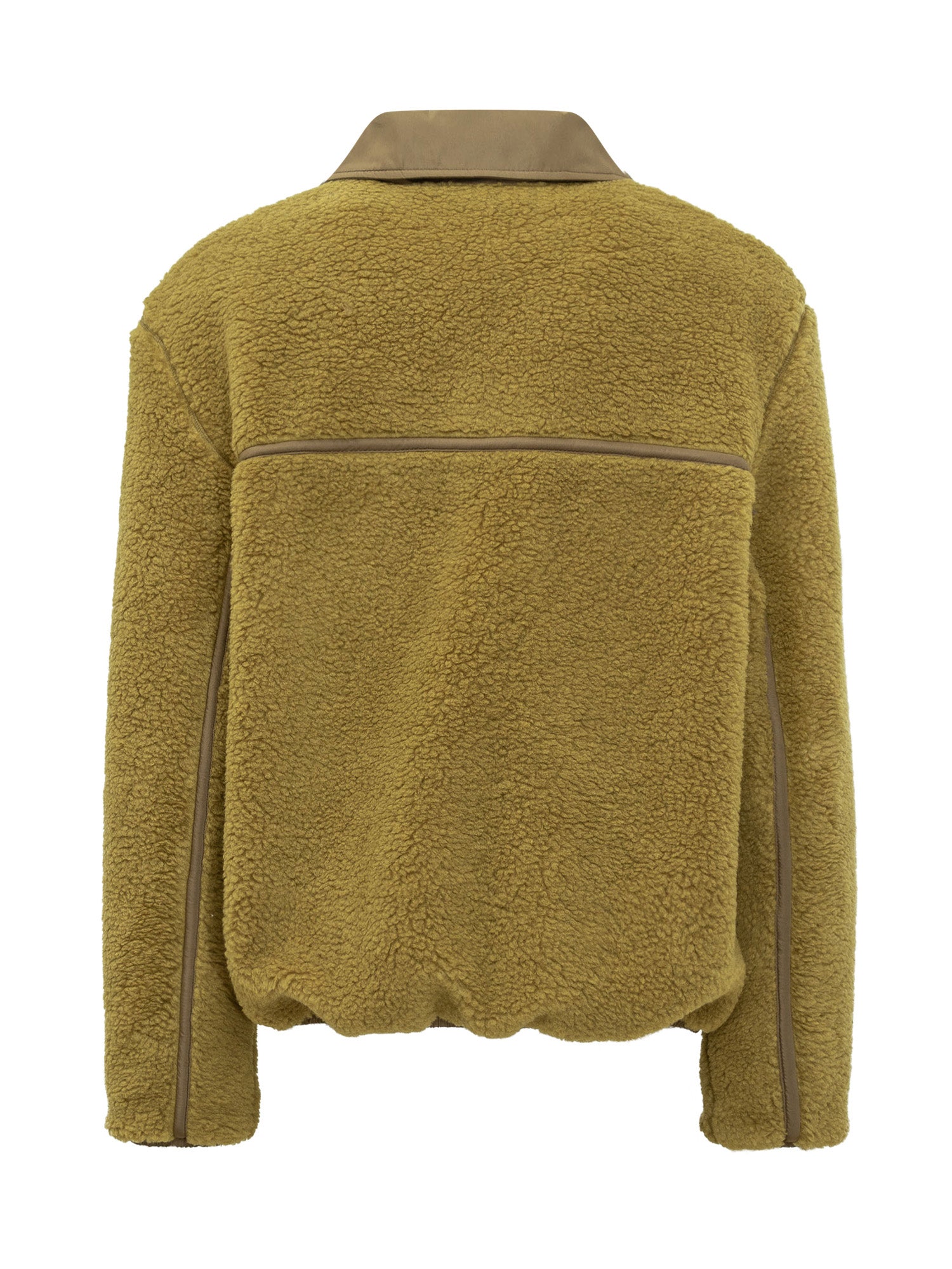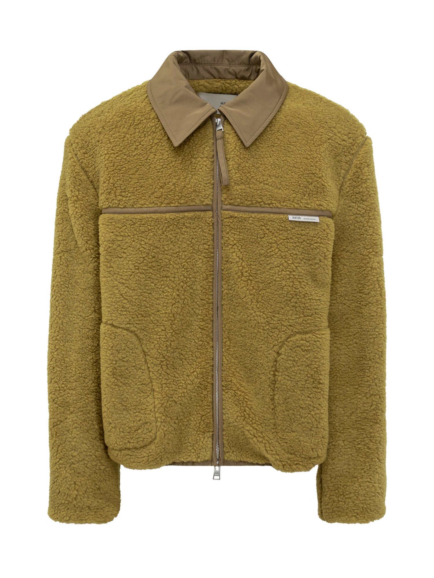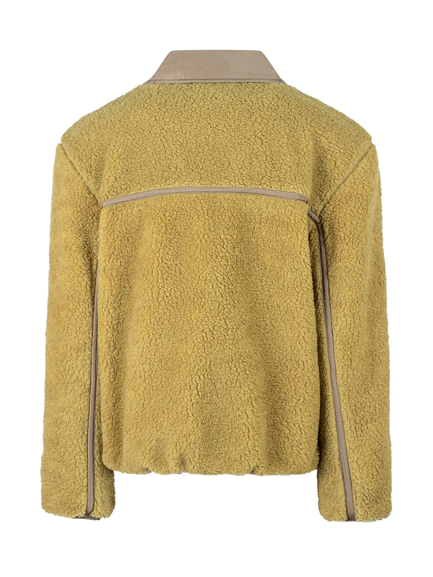 Giacca Ami in shearling giallo con colletto a contrasto e chiusura a zip frontale. Presenta tasche laterali e dettaglio logo discreto.