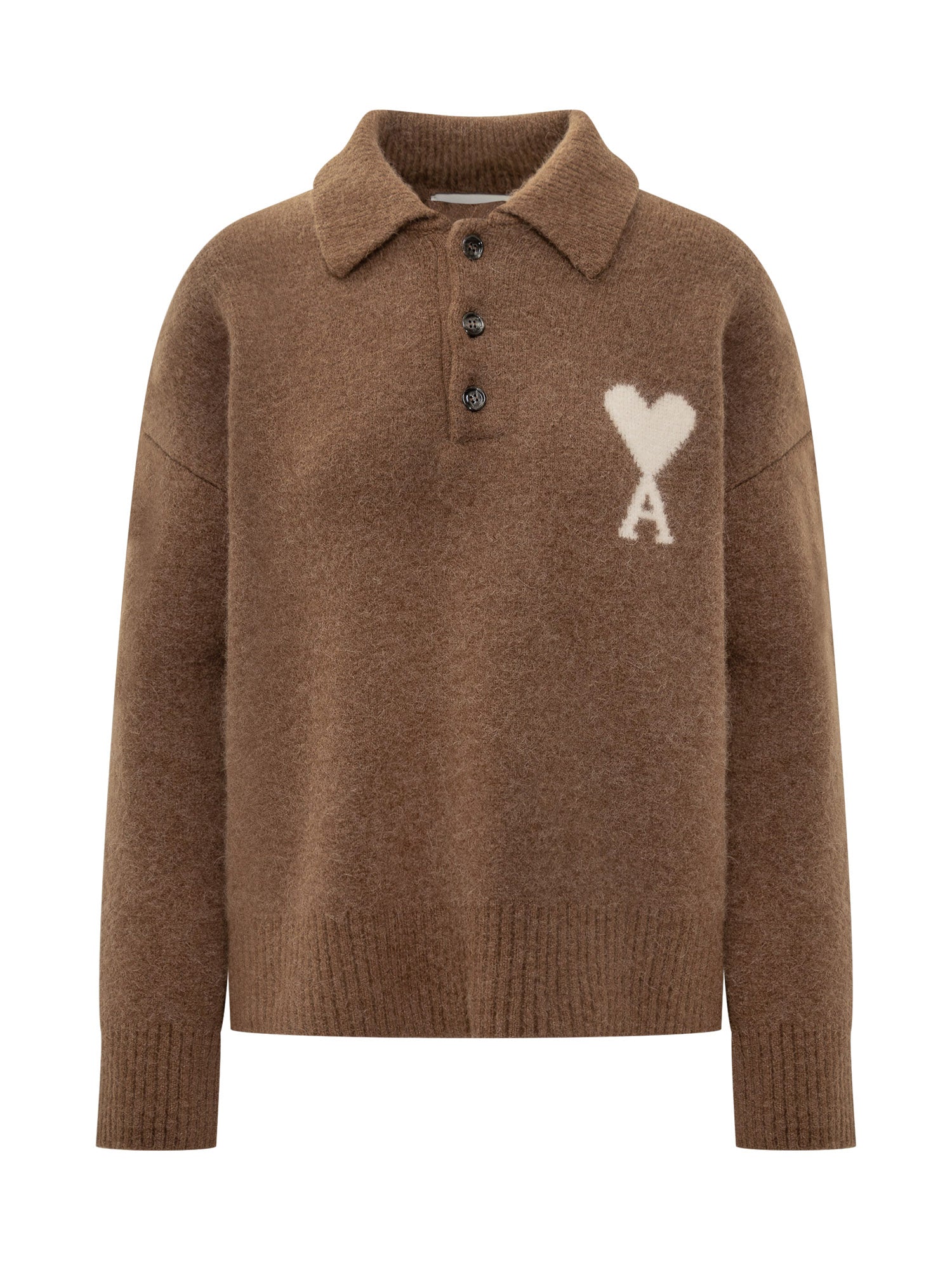 Maglia polo AMI Paris in lana marrone con colletto, bottoni frontali e iconico logo cuore A bianco sul petto.