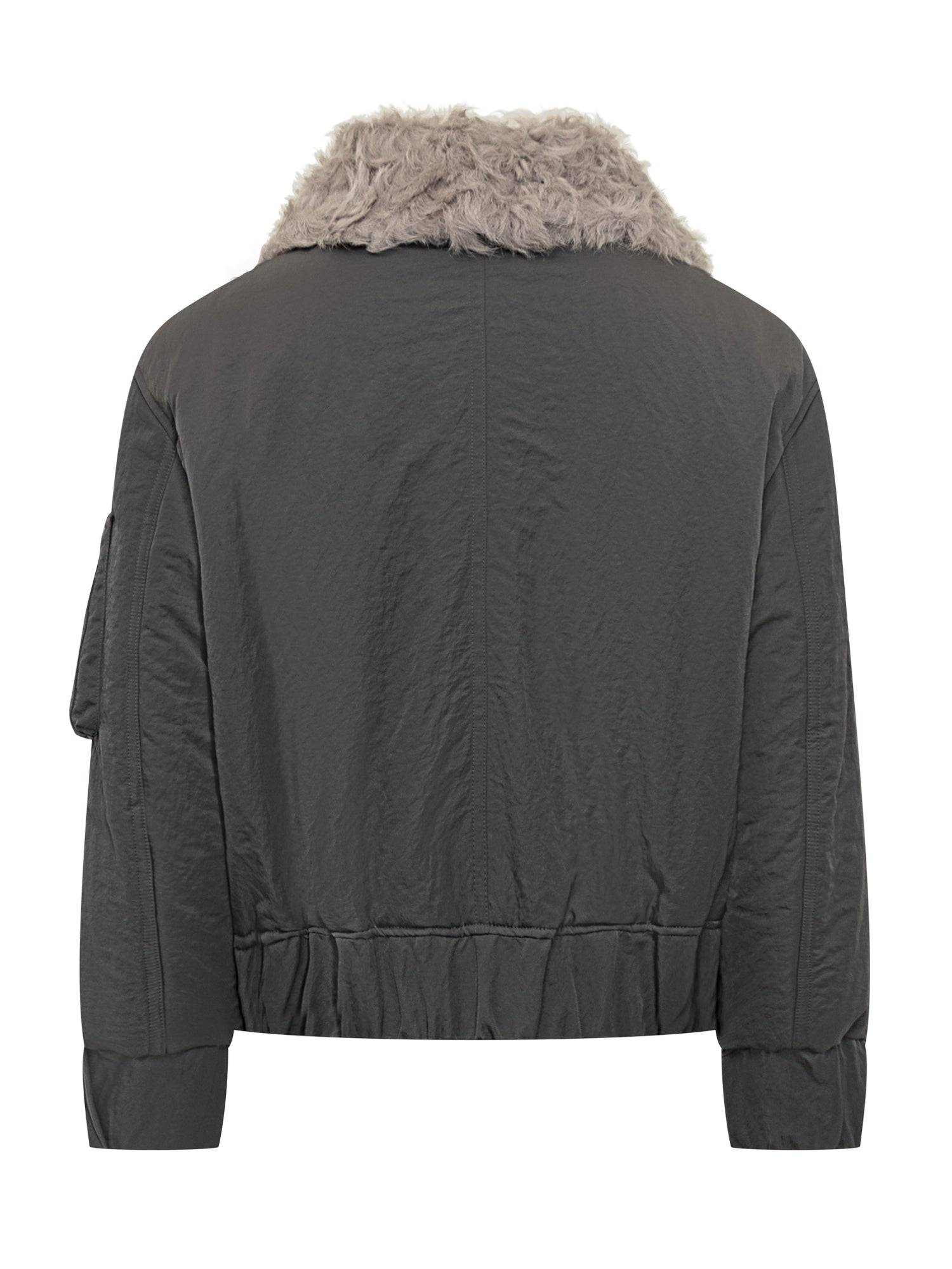 Bomber Ami Alexandre Mattiussi in tessuto tecnico nero con zip frontale, tasche laterali e collo in shearling grigio a contrasto.