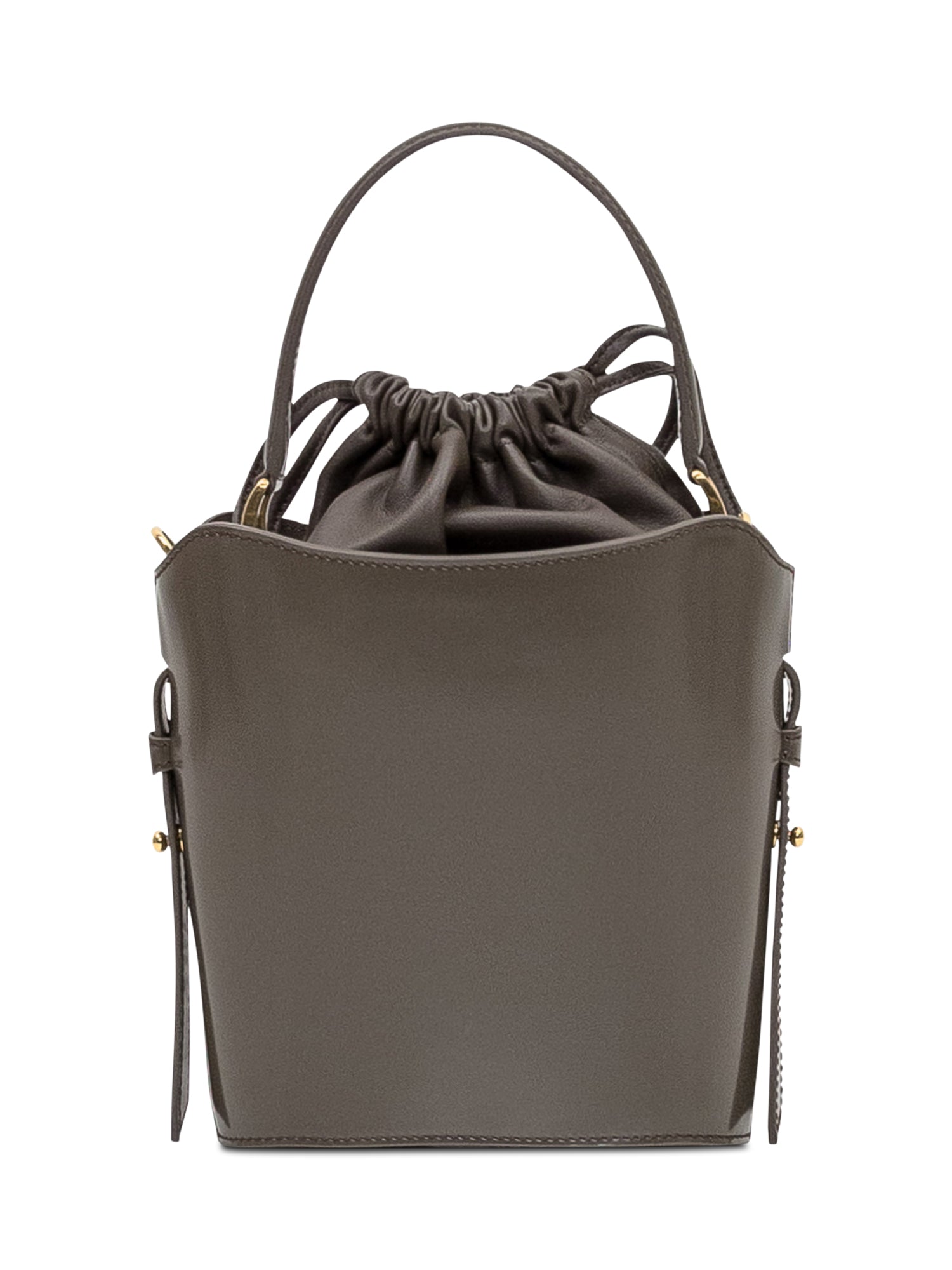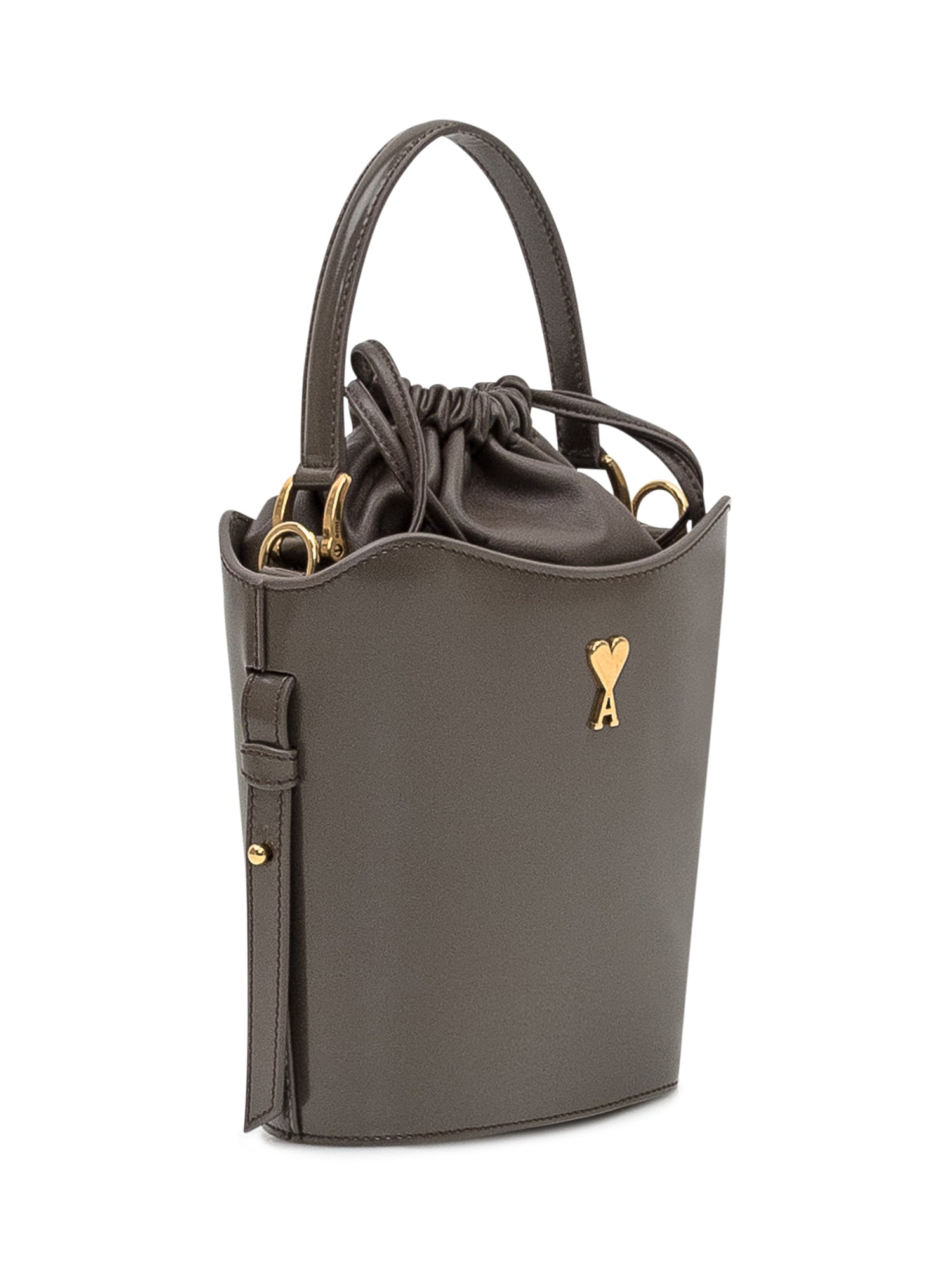 Borsa secchiello Ami Paris in pelle liscia color taupe con iconico logo Ami De Coeur dorato sul fronte. Chiusura con coulisse in tessuto e manico superiore.