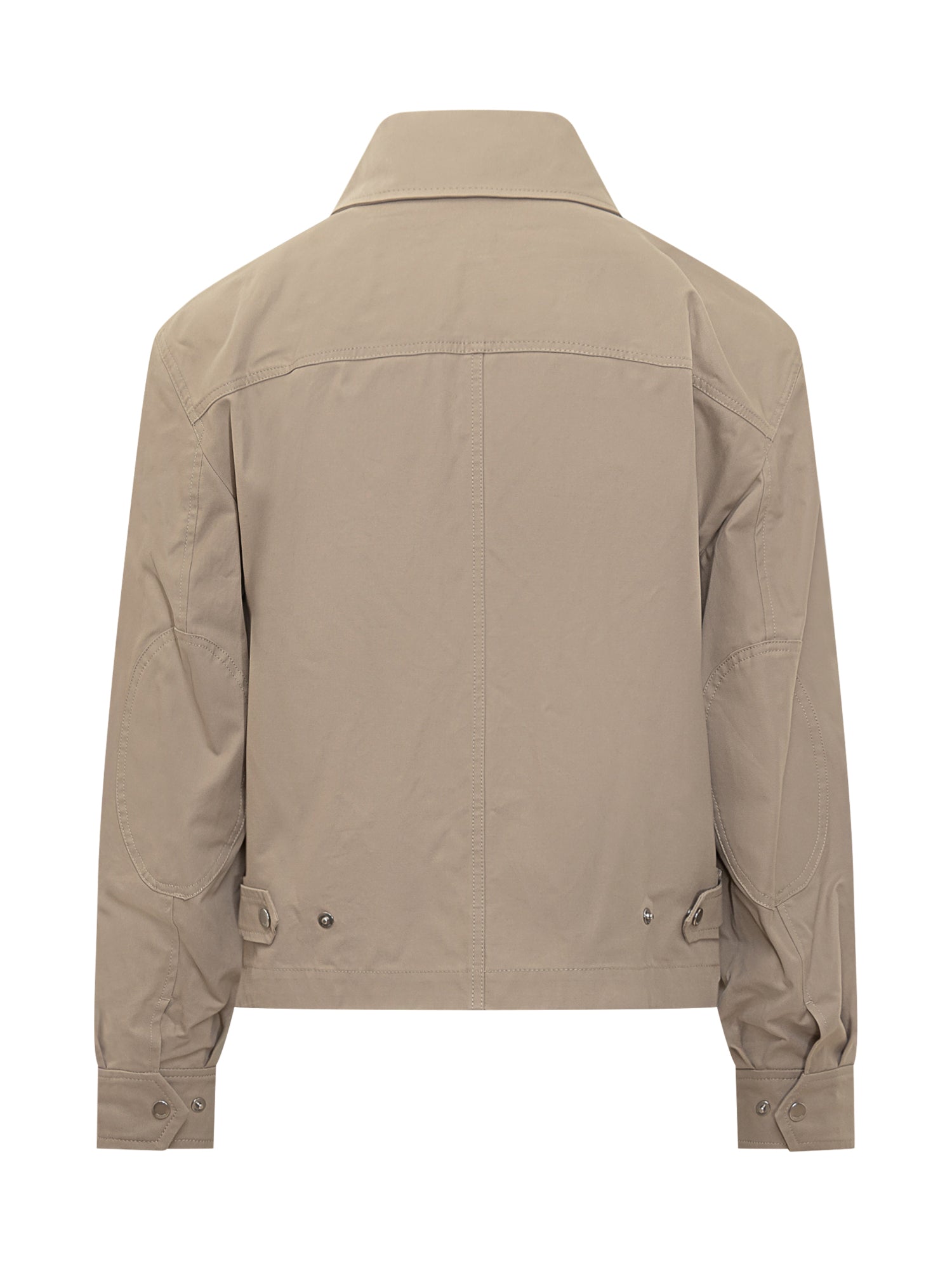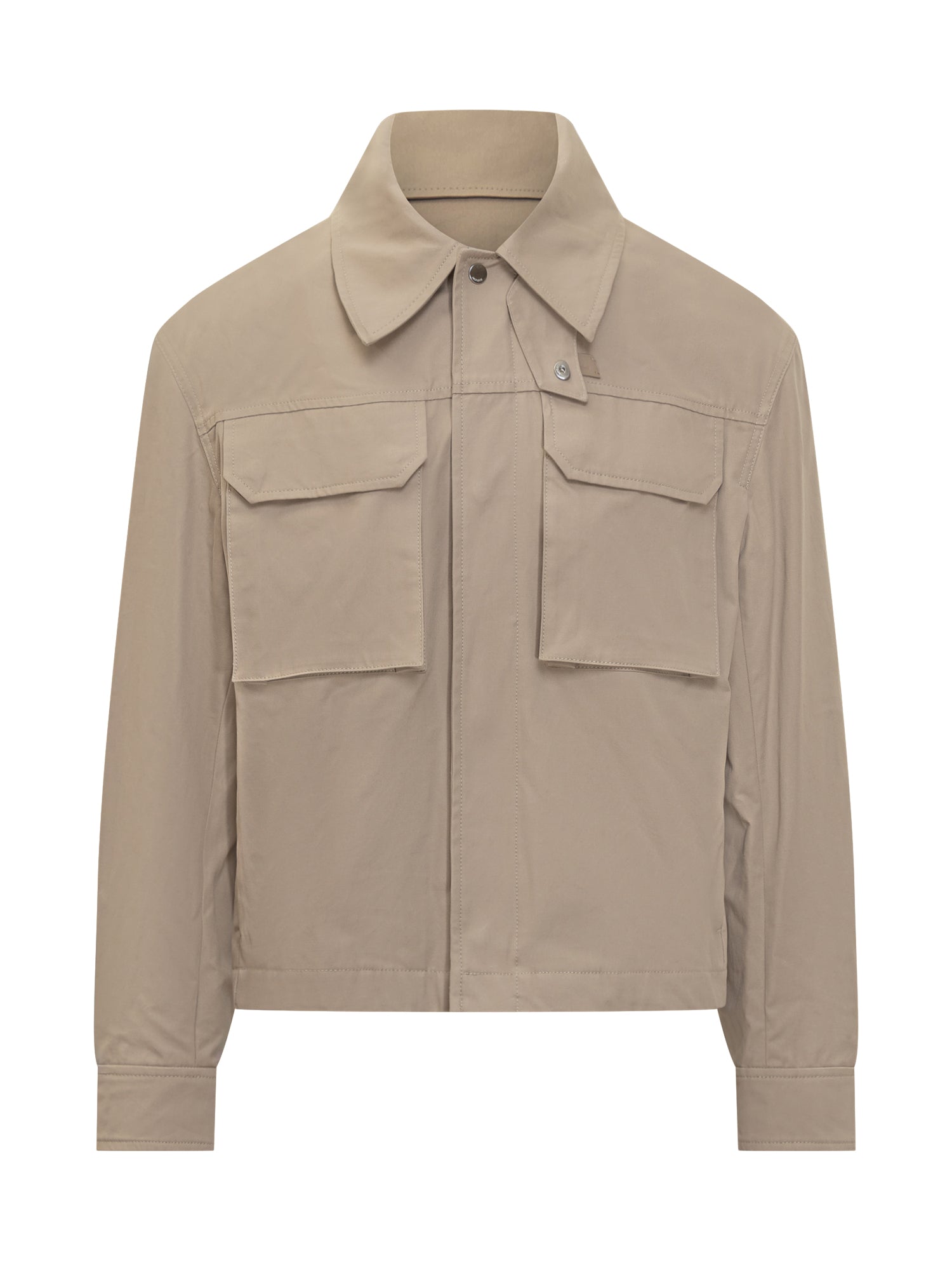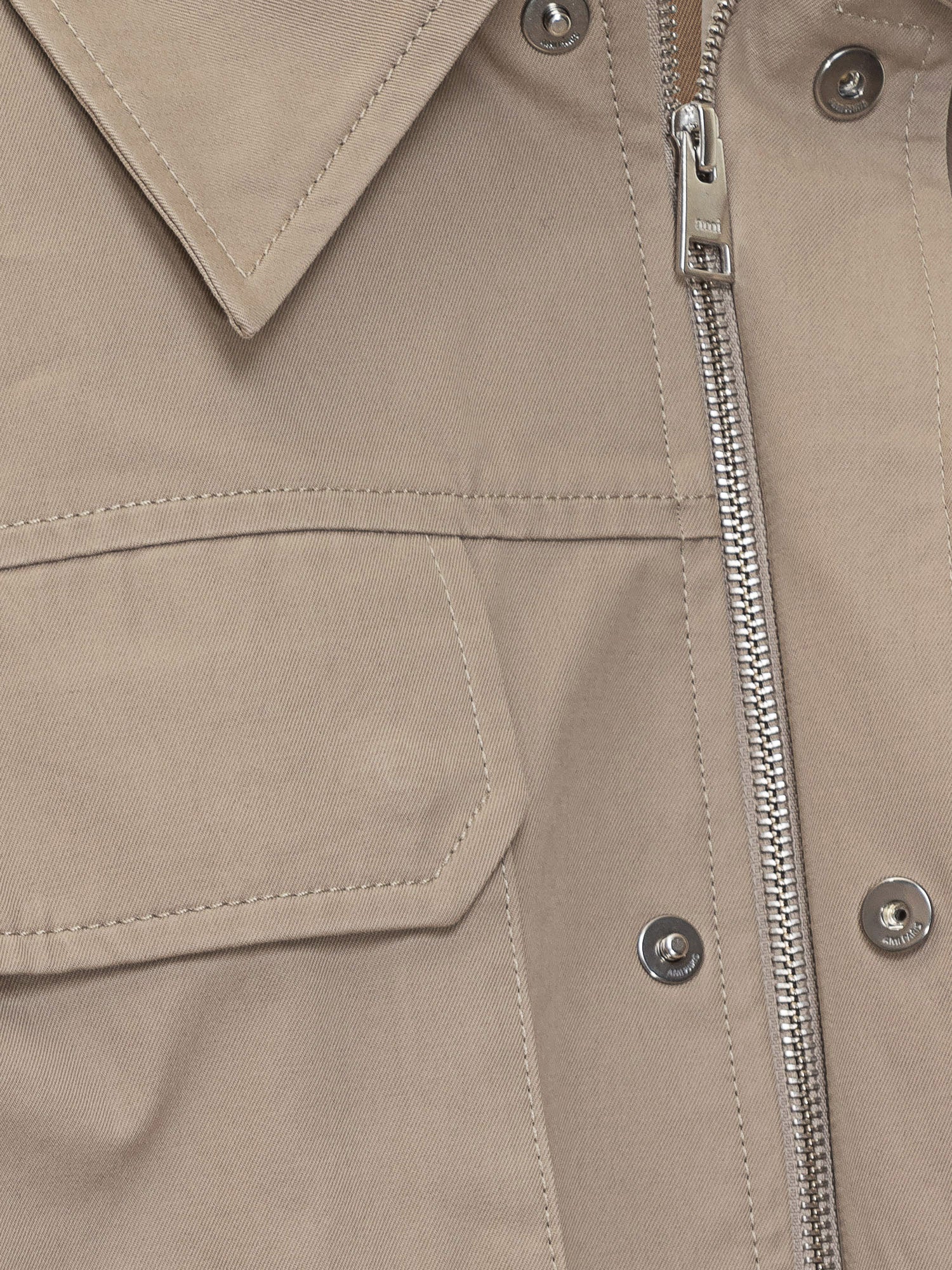 Blouson worker beige in cotone tecnico con tasche frontali a patta e chiusura nascosta.