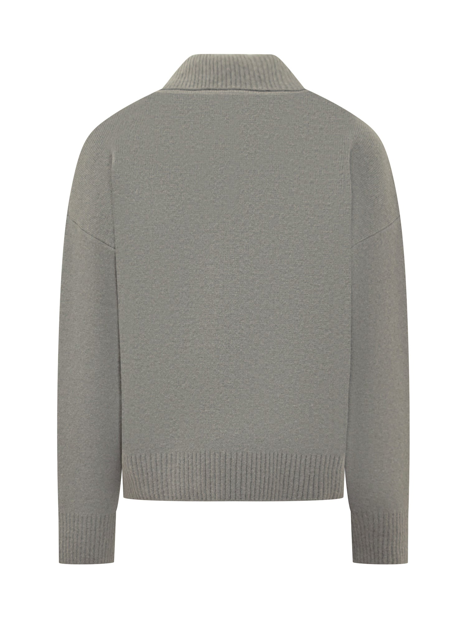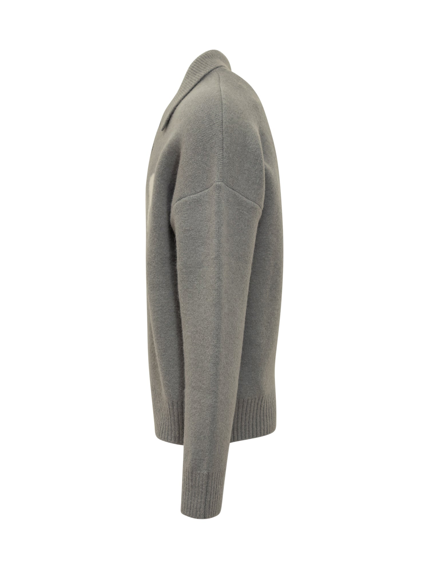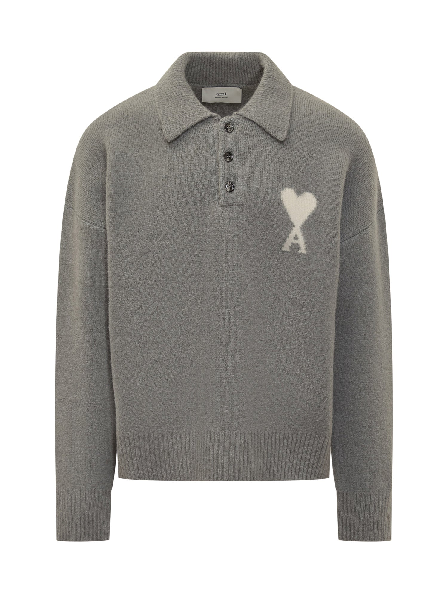 Maglione polo Ami Alexandre Mattiussi in lana grigia con chiusura a tre bottoni e iconico logo Ami sul petto.