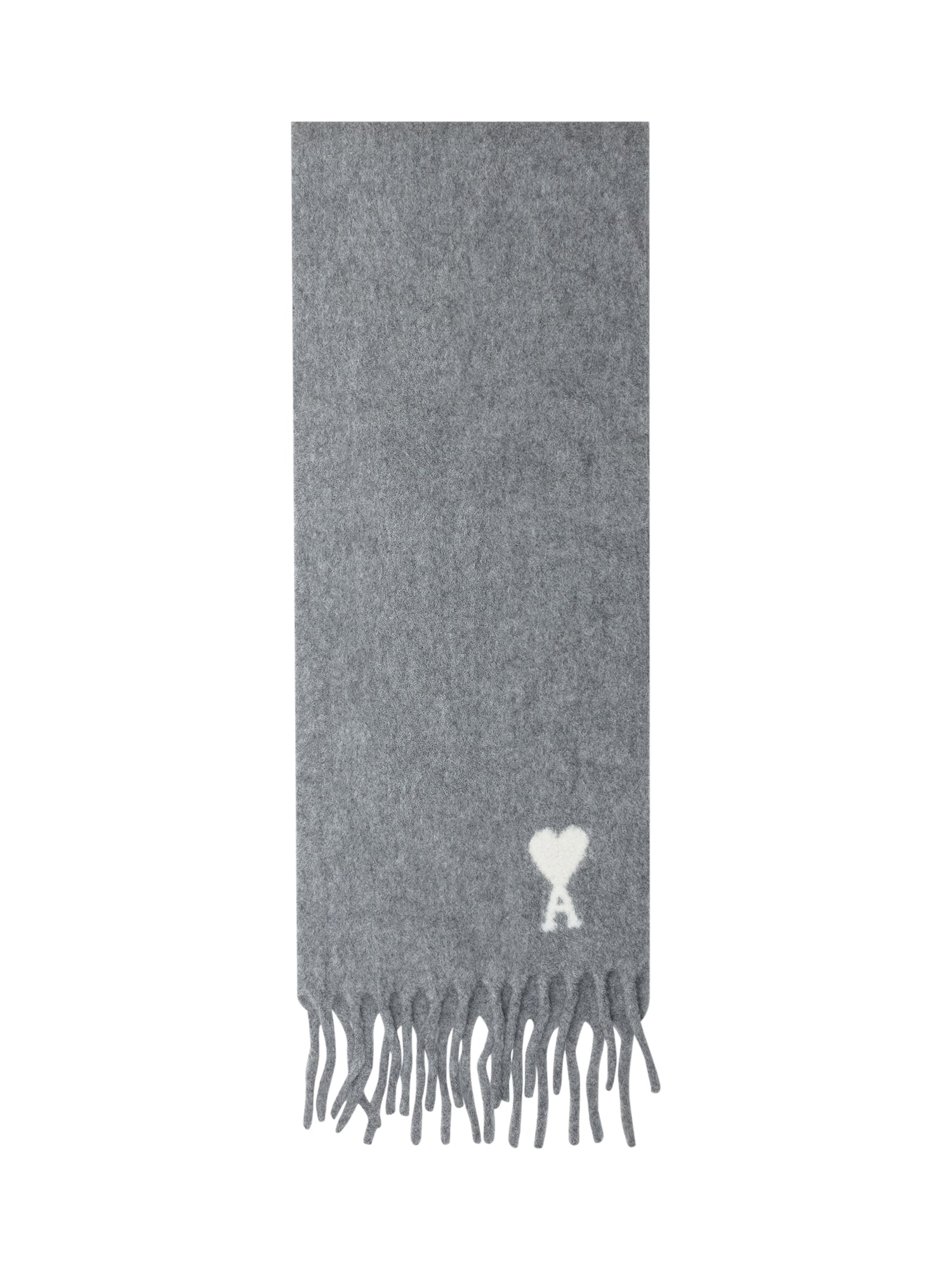 Sciarpa Ami Alexandre Mattiussi in morbida lana grigia con logo bianco e frange alle estremità.