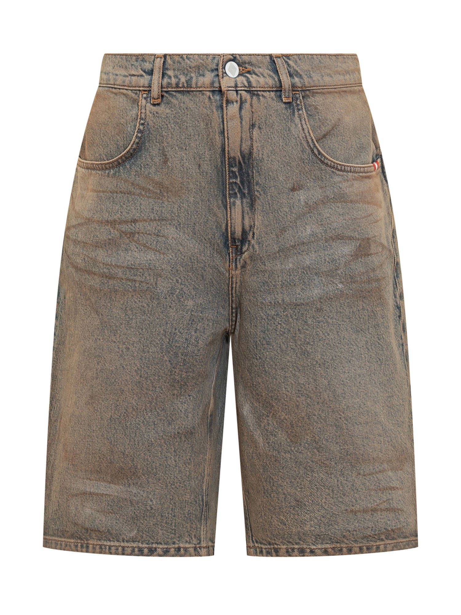 Pantaloni corti in denim. Chiusura con bottone e zip. Passanti per cintura.
