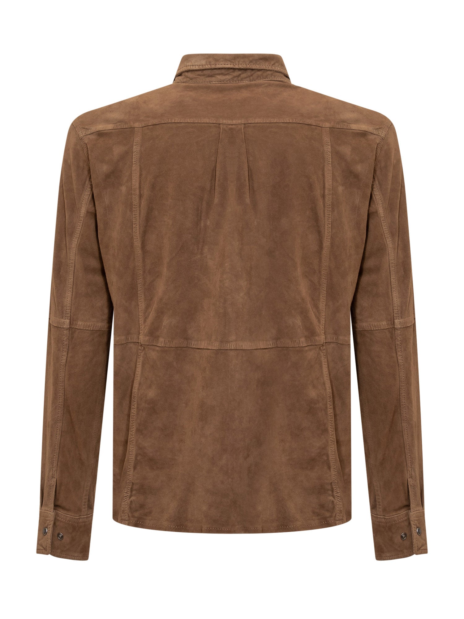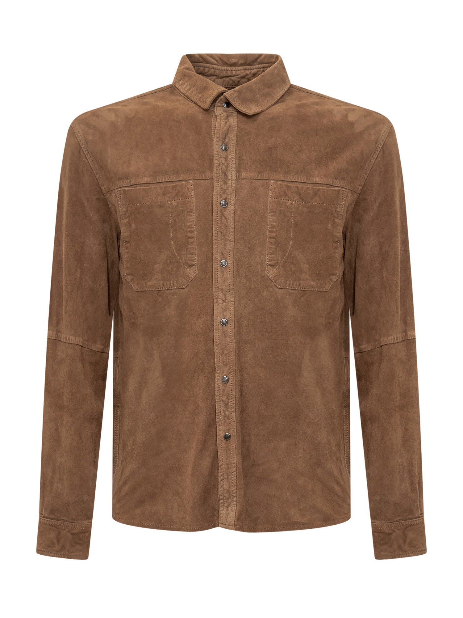 Giacca di pelle scamosciata. Colletto classico. Chiusura con bottoni. Polsini con bottoni. Due tasche sul petto.