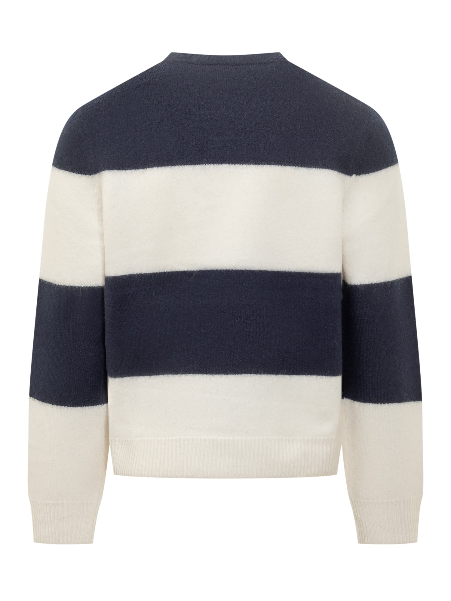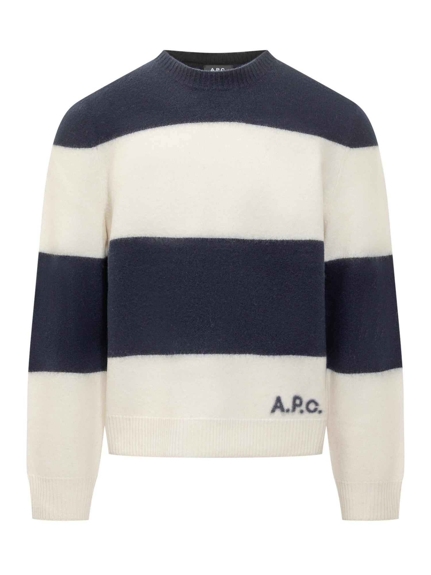 Maglione A.P.C. in lana con maxi righe blu e bianche, girocollo e logo ricamato sul fondo.