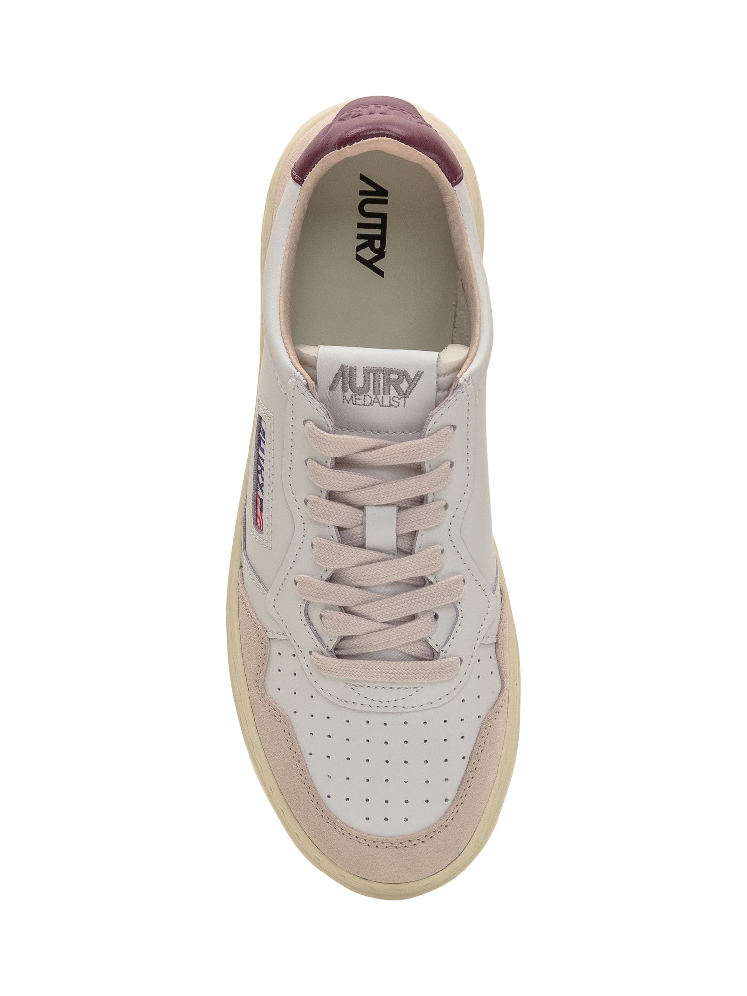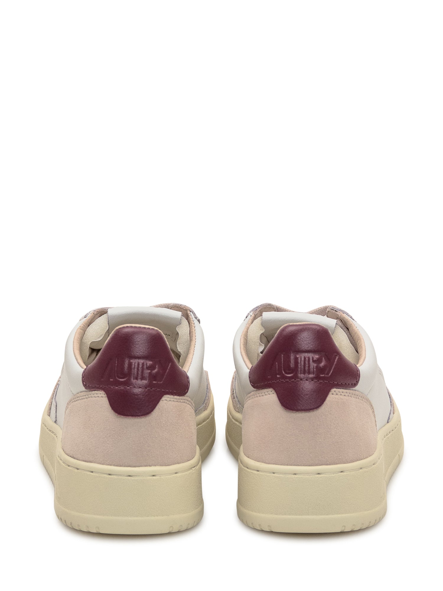 Sneakers Autry Medalist Low in pelle bianca con inserti in suede rosa cipria e tallone bordeaux.