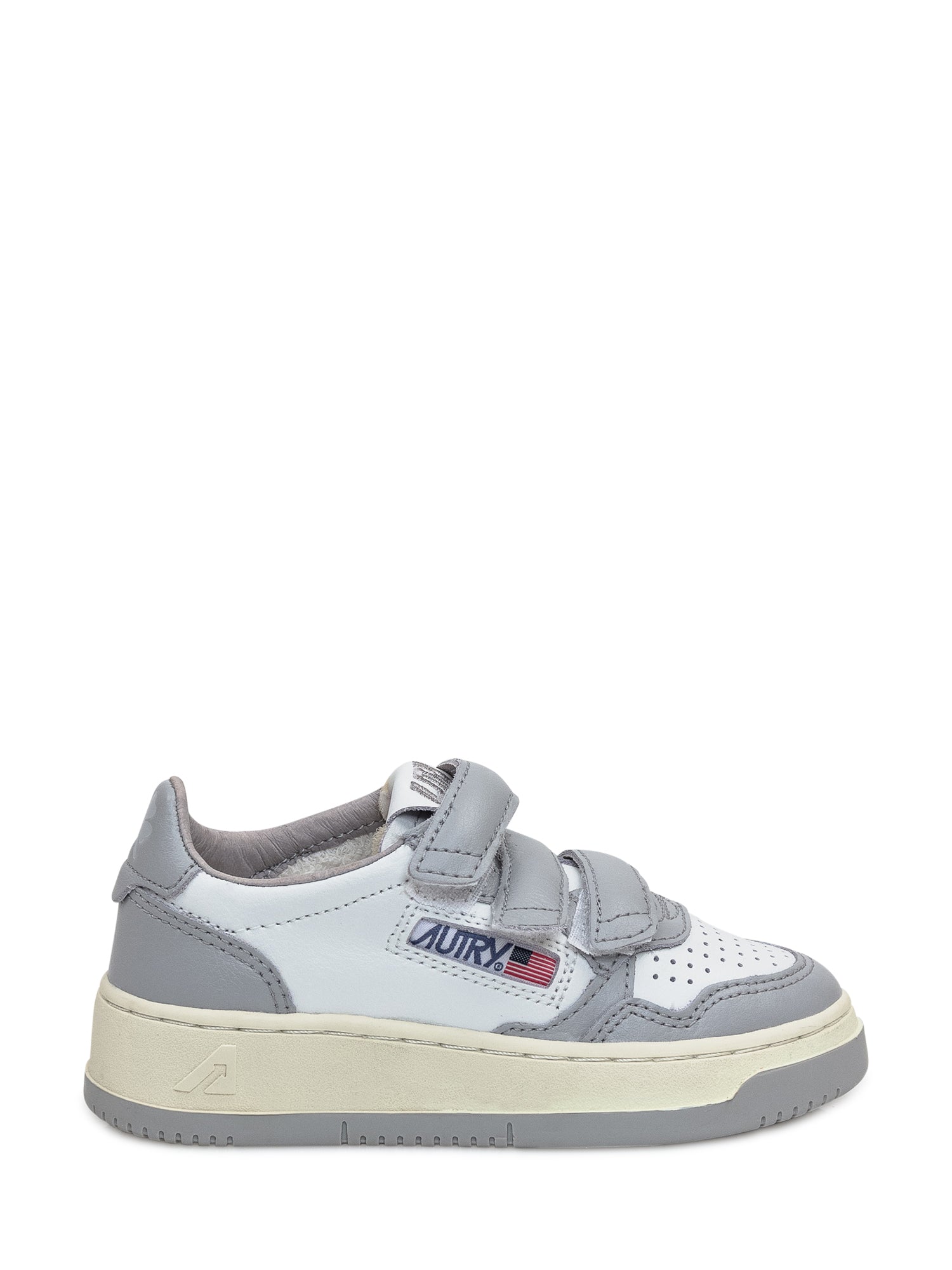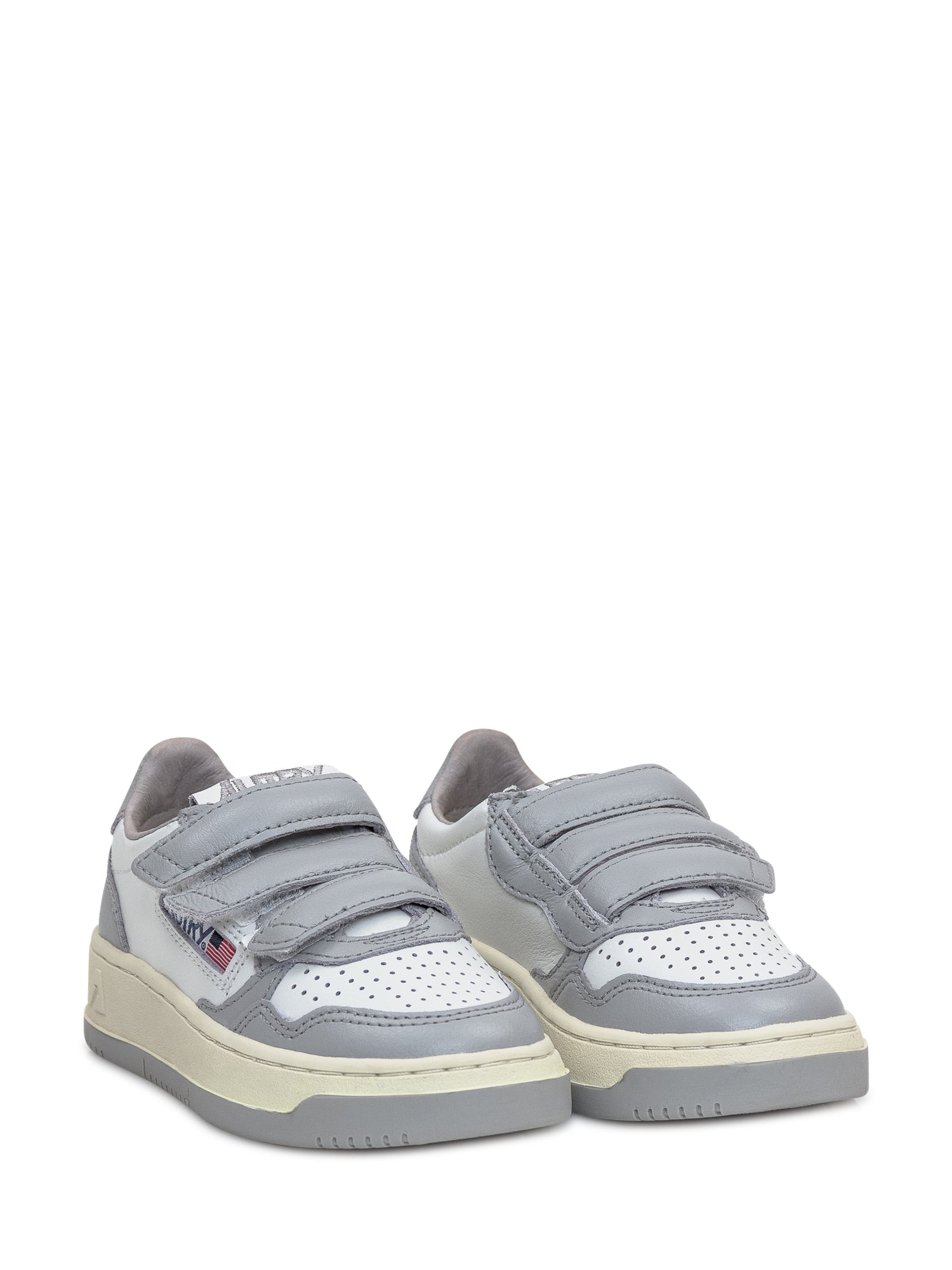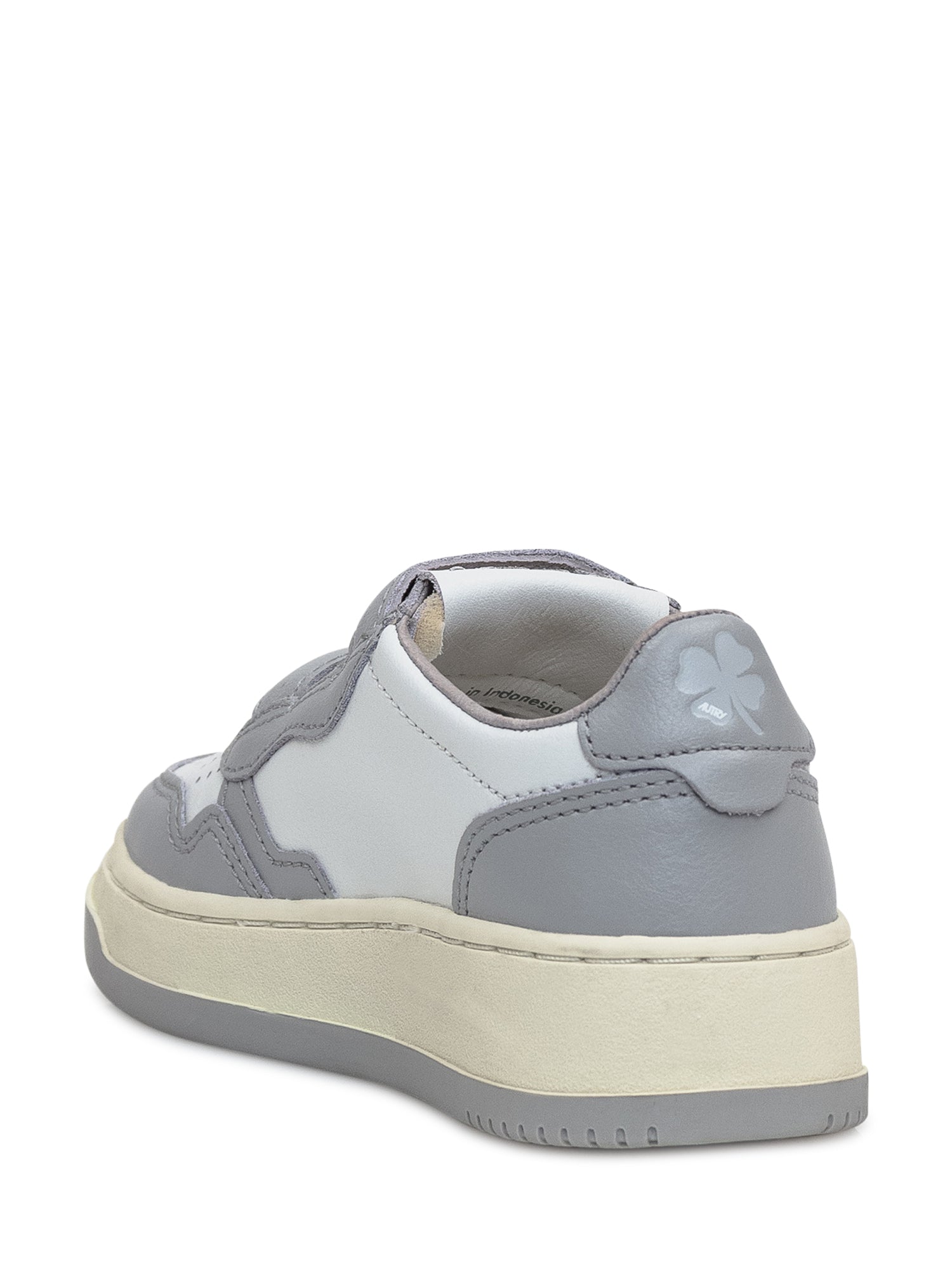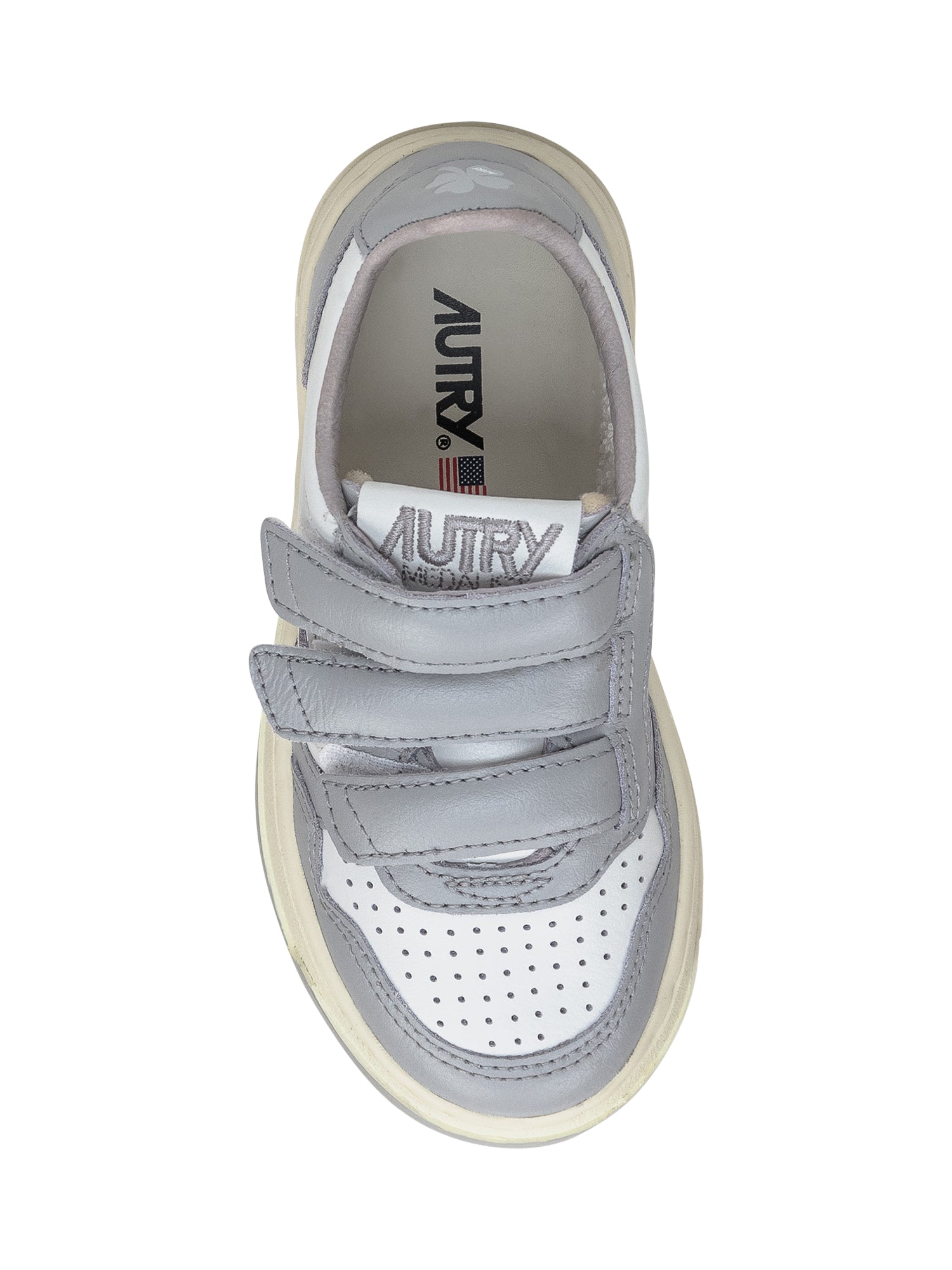 Sneaker bassa bianca e grigia. Chiusura con nastri con velcro. Logo sulla linguetta, sul tallone e sul lato.